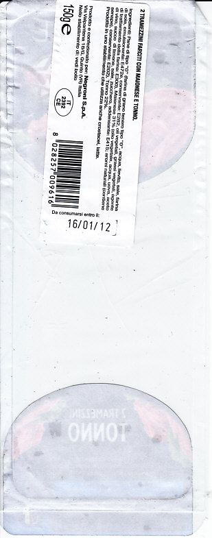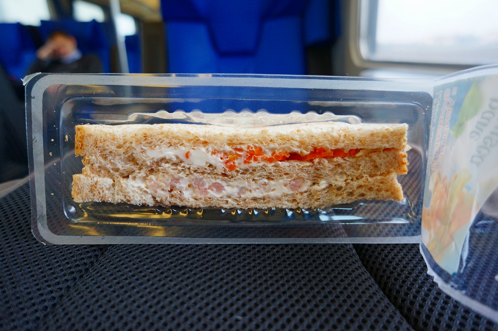 ボローニャ中央駅の地下通路内で、飲料や菓子とともに自動販売機で売られていた三角サンド。きんぴらのような生野菜スティックを混ぜたエビマヨサンドが2切れ、プラ製ケースに収まる。日本のコンビニサンドより固さと大きさと粒状感があった。調製元は鉄道向けケータリング会社を傘下に持つイタリアの食肉会社か。