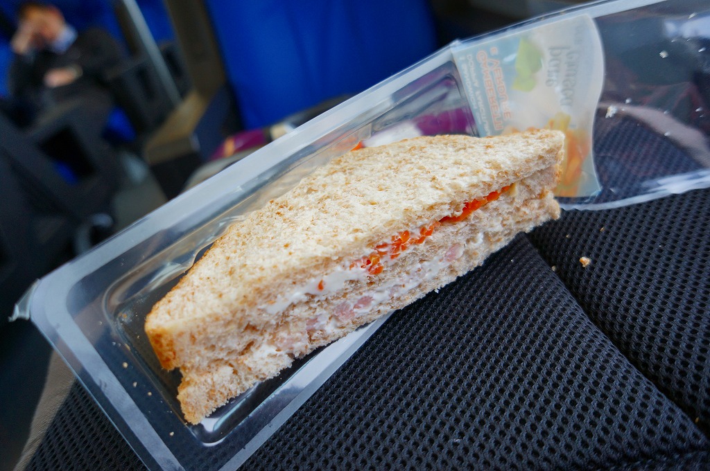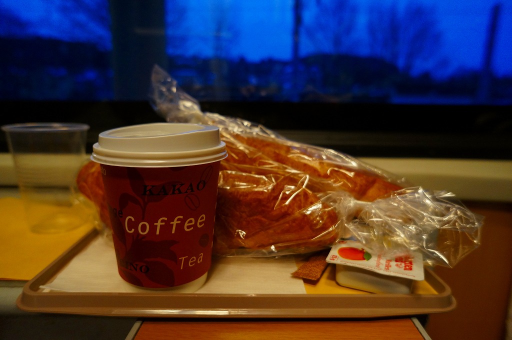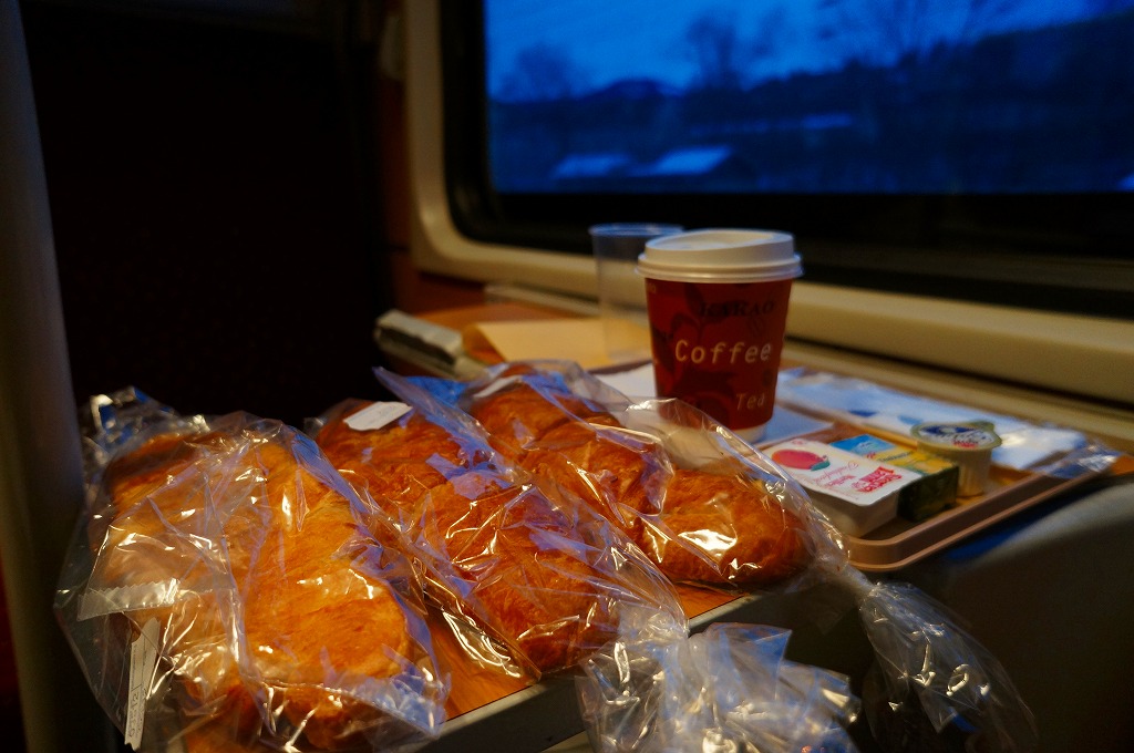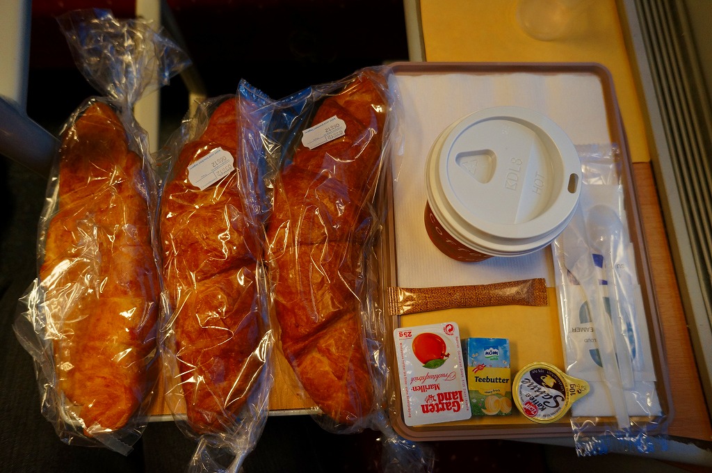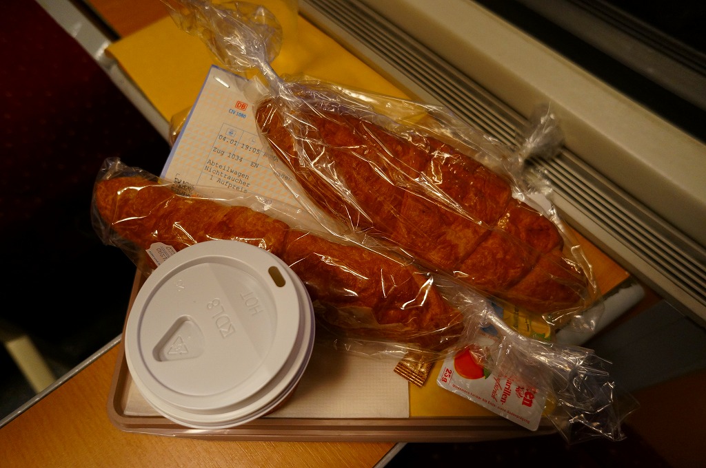 ローマ・テルミニ駅からウィーン・マイドリング駅までの夜行列車「ユーロナイト トスカ」のクシェットで朝食として配布された食事。内容は3本ものクロワッサンと、バターとジャムとホットコーヒー。夜のローマでの乗車後の検札(切符回収)時にコーヒーかティーかの注文を聞かれ不思議に思っていたら、翌朝の切符返却時にこれが出てきた。パンもコーヒーも温かく香り深く、世界遺産ゼメリング鉄道の夜明けを眺められた。