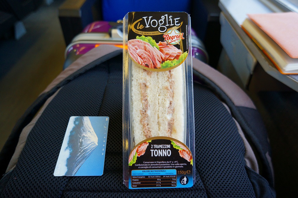 ベネチア・サンタルチア駅からボローニャ駅まで乗車したイタリアの高速列車「ユーロスター・イタリア アルタ・ヴェロチタ」で配布された軽食。ドリンクとスナック状のパンをもらえた。