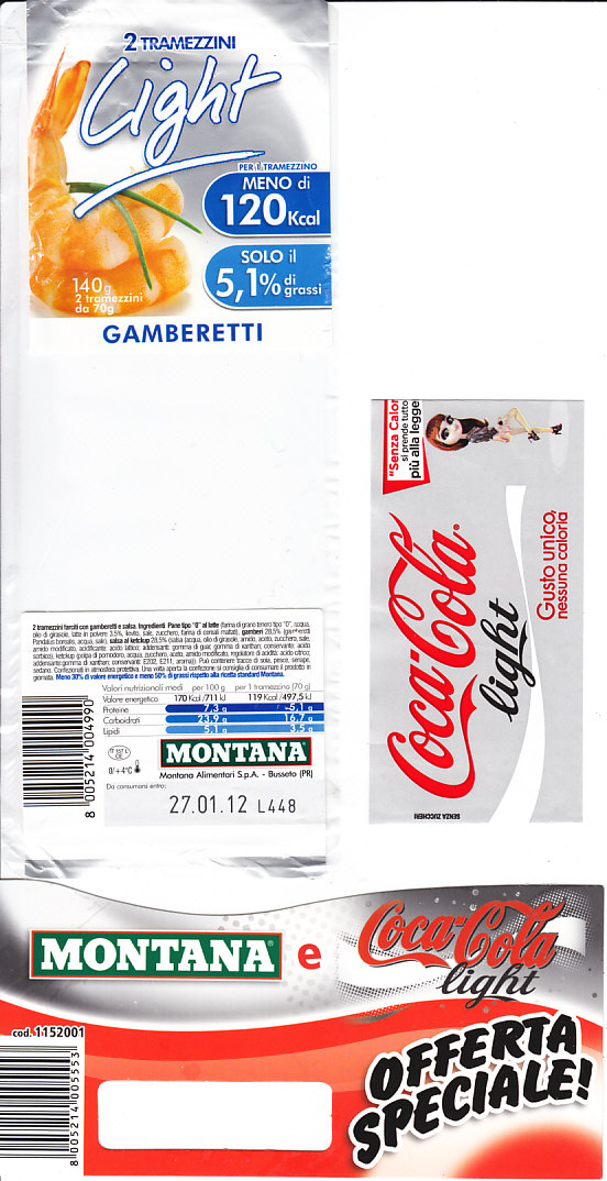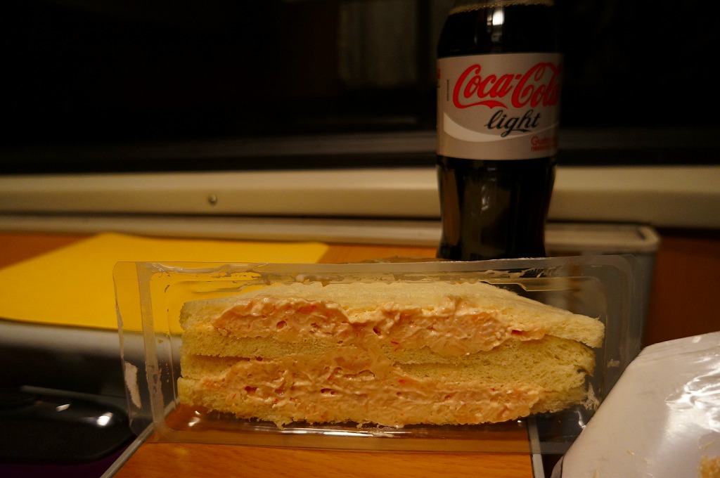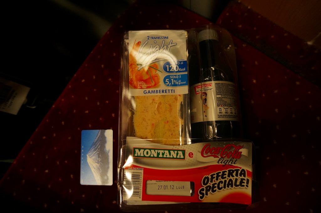 ローマ・テルミニ駅のウォークイン型ミニ食料品店で販売されていたセット商品。エビマヨの三角サンドとコカコーラライトのペットボトルが、透明なプラ製ケースに収納されていた。他にトマトサンドと無印のコカコーラをセットした商品もあったが、バルセロナと違い売り場での存在感は小さかった。