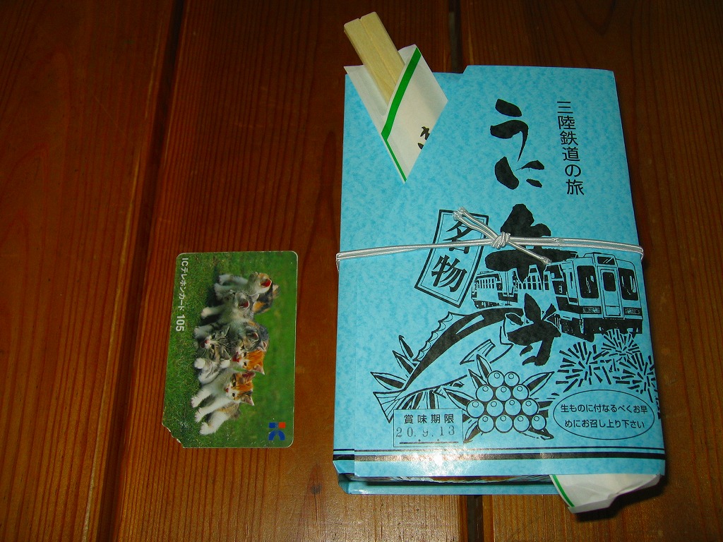 1986(昭和61)年7月26日に、三陸鉄道北リアス線の車内販売弁当として発売。日本有数の「幻の駅弁」であり、全国最強のウニ駅弁。赤い正方形の容器をラップで包み、木目調のボール紙でふたをして、三陸鉄道の列車やウニなどを描いた青い厚手の掛紙を巻く。中身はウニの混ぜ御飯の上を大量の蒸しウニで覆い尽くし、レモンとタクアンを添えるもの。