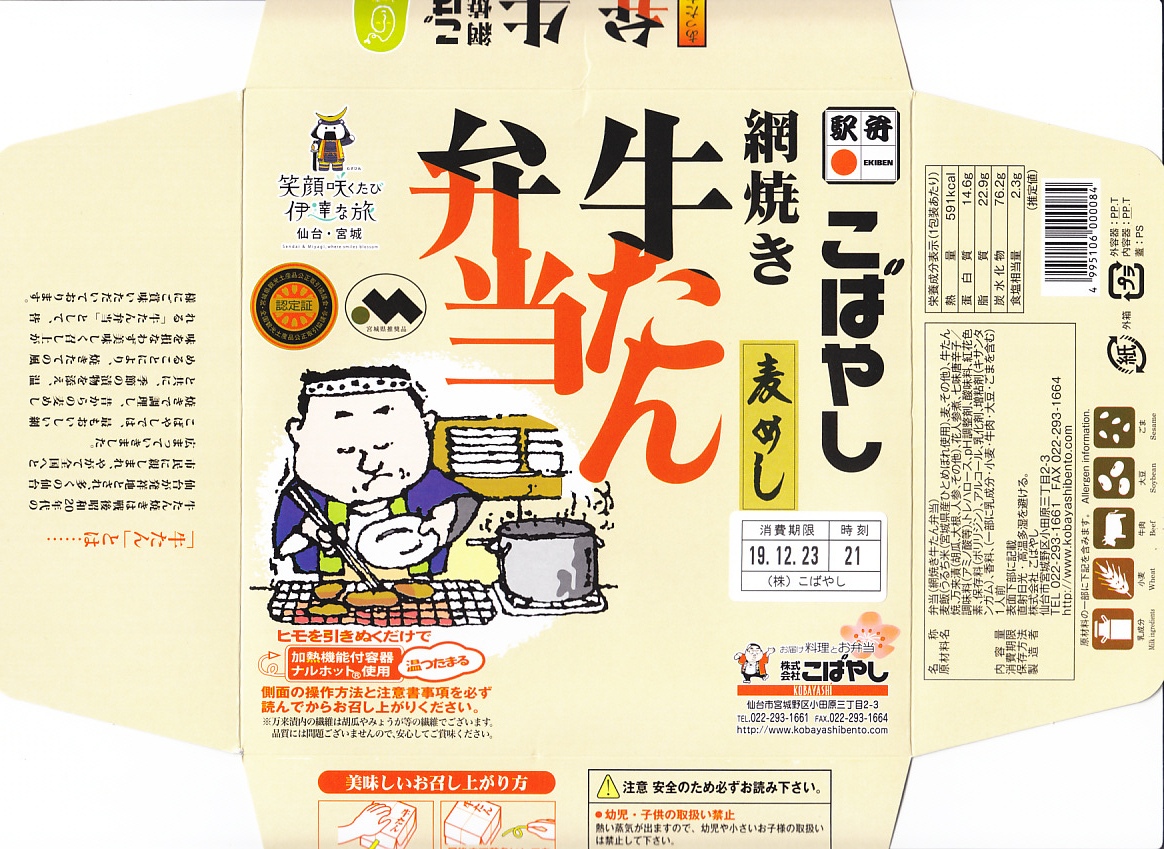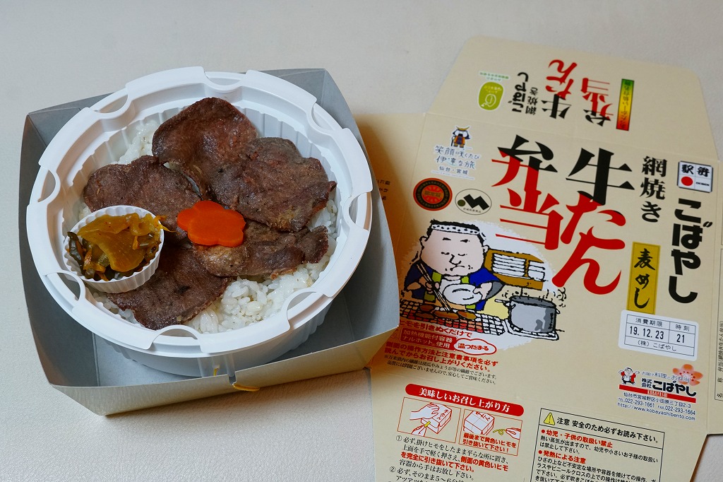 1990(平成2)年に発売した、仙台駅を代表する駅弁。発熱材入りの丸い容器をボール紙のパッケージで包む。中身は麦飯の上に牛たん焼が5〜6枚載るだけのシンプルなもの。仙台駅のほか、東北新幹線の車内や秋冬シーズンの駅弁催事でも購入できる。