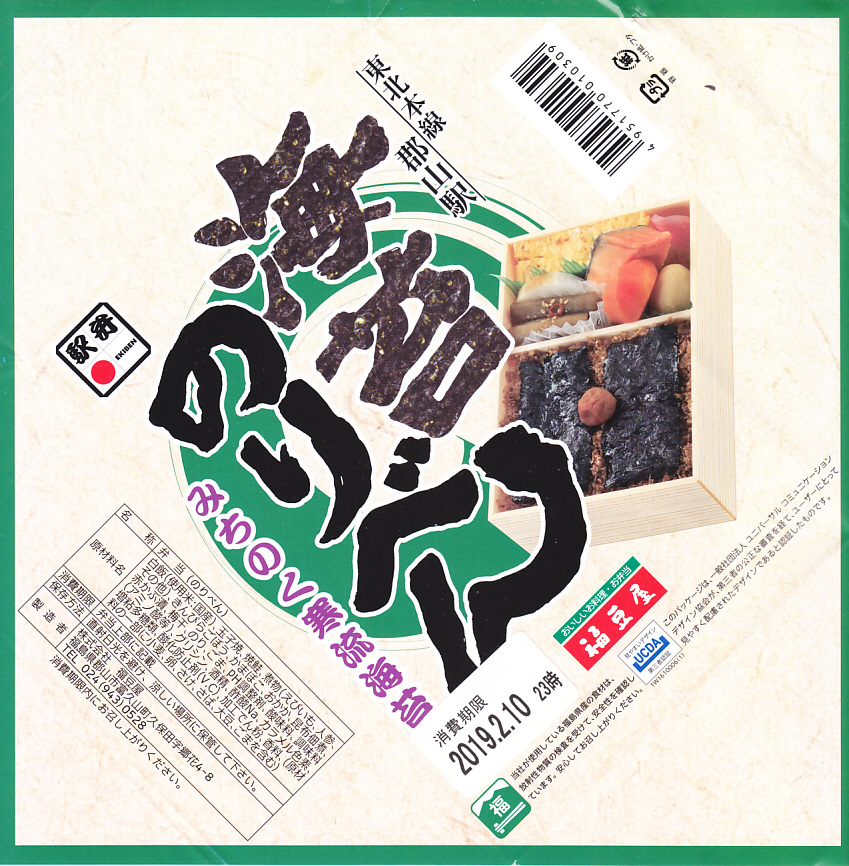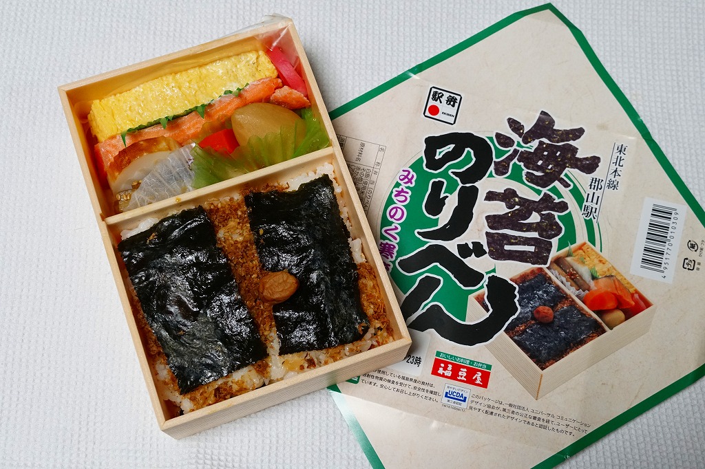 2010(平成22)年の発売か。2008(平成20)年10月の東京駅の駅弁大会で売られたメガ駅弁「ビッグのり弁」の通常版か。2015(平成27)年8月のTBSテレビ「マツコの知らない世界」や、2016(平成28)年9月のTBSテレビ「この差って何ですか?」など、いくつかのテレビ番組や特集コーナーで駅弁マニアの1位その他高い評価を得て、今では最も有名な郡山駅弁。