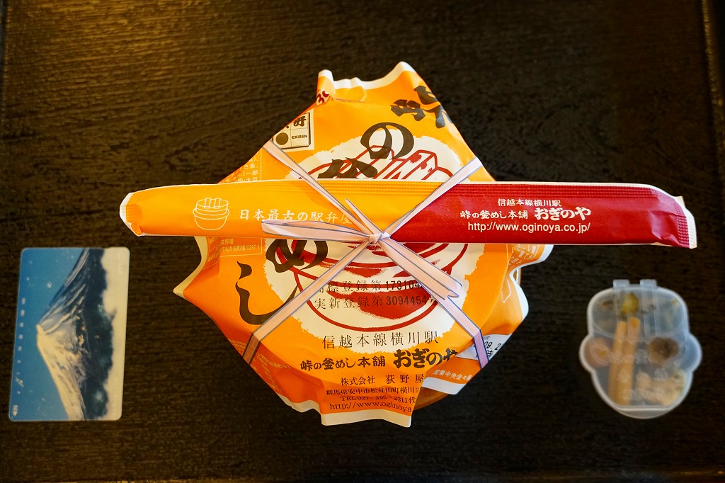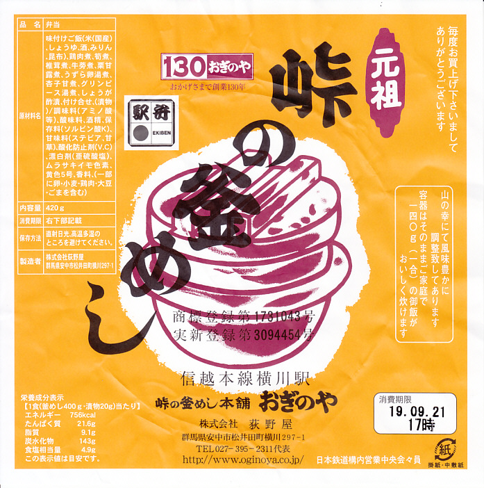 公式には1958(昭和33)年2月の発売。前年12月に非公式発売とする文献もある。今さら説明することもない、日本で最も有名な駅弁の一つ。焼き物を容器とした初めての駅弁でもある。益子焼の釜の中に茶飯を詰め、その上に鶏肉、タケノコ、ゴボウささがき、椎茸、栗・、ンズ、うずらの卵、紅生姜、グリーンピースを載せる。ふたも陶製で、掛紙をかけて紙ひもでしばり、釜型プラ製の別容器で5種の漬物を添付して出来上がり。