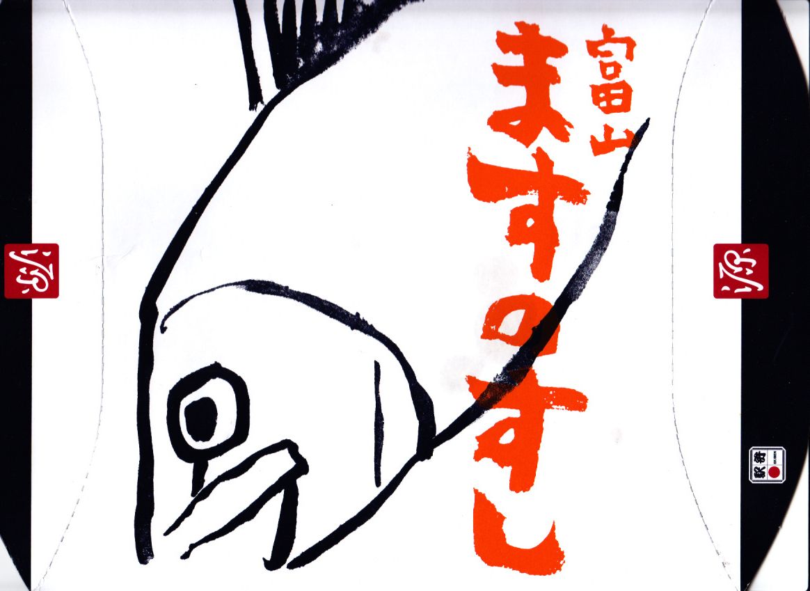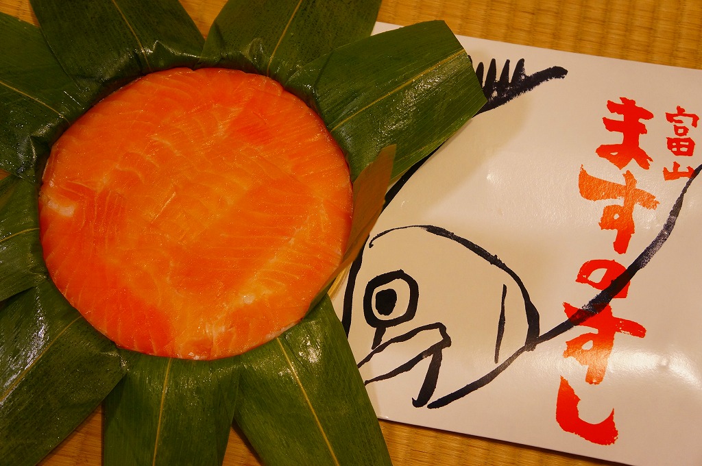 富山駅の駅弁として、1912(明治45)年に発売。この駅弁の特徴である、ボール紙のパッケージと、画家の中川一政による絵柄は、1965(昭和40)年から使われるという。木製の曲げ物に、笹の葉を敷き、酢飯を詰め、マスの身を貼り、竹とゴムで押す。名物の駅弁として広く知られるほか、このようなマスの押し寿司そのものが富山の名物である。