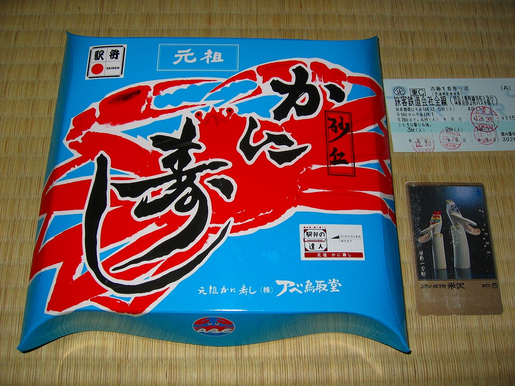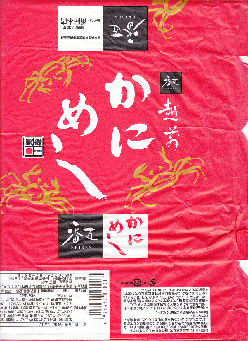 1961(昭和36)年2月に発売。福井駅で伝統の駅弁、かつ一番人気の駅弁であり、全国を代表するカニ駅弁のひとつ。カニの色と形をイメージした赤黒いプラ製容器を、駅弁の名前を書いた袋に詰めて封をする。中身はカニみその炊込飯を、ズワイガニやベニズワイガニのほぐし身で覆った、シンプルなカニ飯。カニ味噌で御飯を炊いた、全国初のカニ駅弁だそうな。駅弁として普通にそのまま食べる以外に、電子レンジの使用や、チャーハンや雑炊にする食べ方を、袋で推奨している点では変わり者。