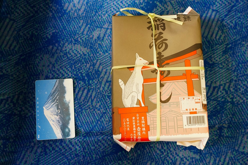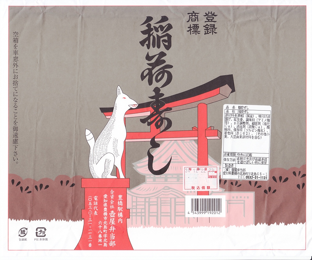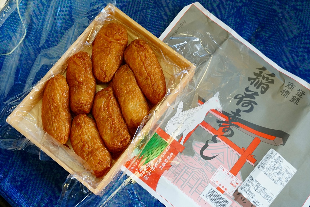 明治時代の末期に発売。かつて全国各地ほぼすべての駅弁屋が手掛けた稲荷寿司の中で、古くから日本一うまいと評価されることの多い、豊橋駅弁の稲荷寿し。掛紙の絵柄は何十年も変わらない、おそらく豊川稲荷の本殿と鳥居にキツネの像。素材こそ紙やプラだが、大きさは昔の経木折と変わらなそうな容器に、少し細身で少し茶色の濃いおいなりさんを7個収め、紅生姜の袋を添える。約20分間熱湯で油抜きをした油揚げを、醤油と砂糖のタレで約40分間煮て、酢飯を詰めて作られるという。