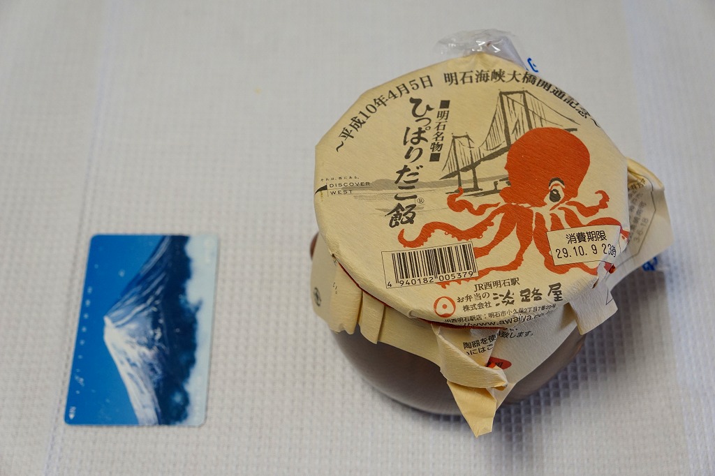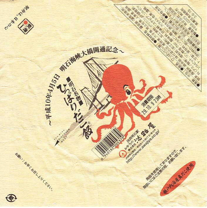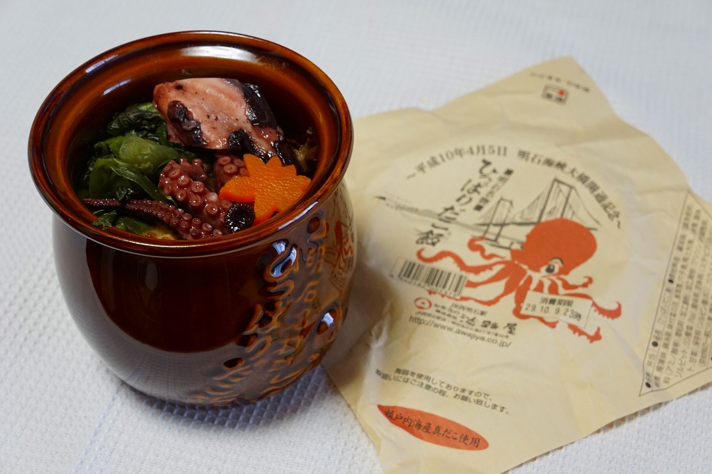 1998(平成10)年4月5日の明石海峡大橋開通を記念して発売した新しい駅弁ながら、すでに全国的な知名度を獲得している名物駅弁。たこつぼ状の茶色い焼き物容器の中に、明石のタコのうま煮やすり身天ぷらを、醤油味の炊き込み御飯やタケノコ・穴子・松茸・人参などとともにぎっしり詰める。掛紙の裏面に追記されたとおり、明石だこの不漁により、2017(平成29)年5月から瀬戸内海産のタコを使っているという。