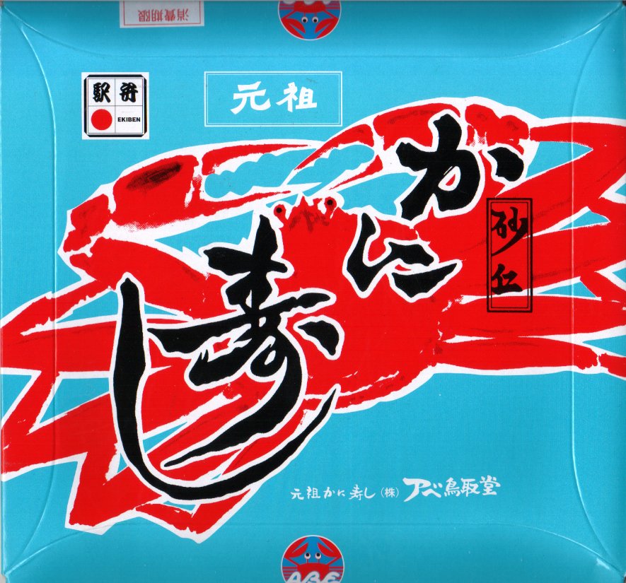 1952(昭和27)年11月に発売された、カニ寿司駅弁の元祖。1958(昭和33)年に保存技術の開発で一年中カニ駅弁を提供するようになったのも、鳥取駅弁が元祖である。カニを描いたボール紙のパッケージに、またカニを描いたふたをかける八角形の容器が入る。因幡米の酢飯を覆い隠すように、カニのほぐし身とカニ足が、錦糸卵とともに敷き詰められている。