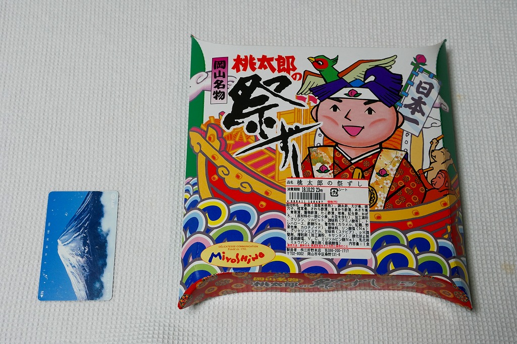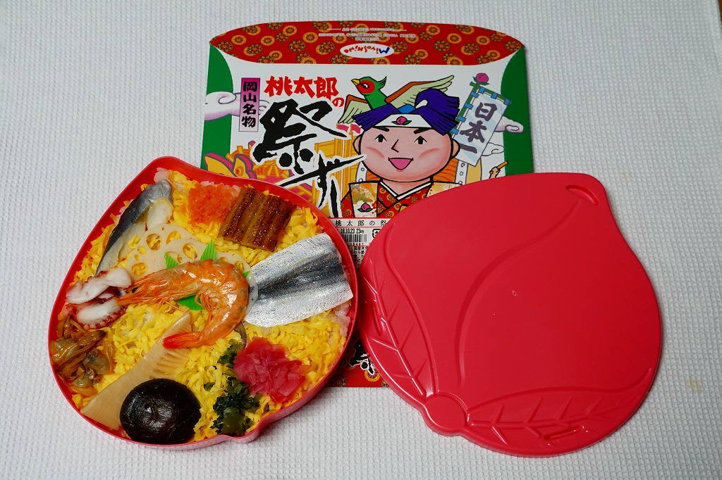 1963(昭和38)年に「祭りずし」として発売。岡山駅弁といえば祭ずし。ピンク色をした桃型のプラスティック容器を使用、備前米の寿司飯の上に錦糸卵を敷き詰め、ママカリ・椎茸・えび・アナゴ・タケノコなどを散らしている、名前どおりの華やかな駅弁。量は見た目ほど多くない。