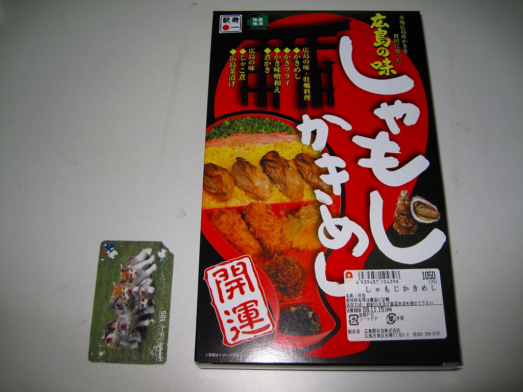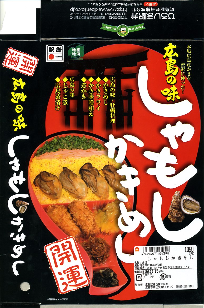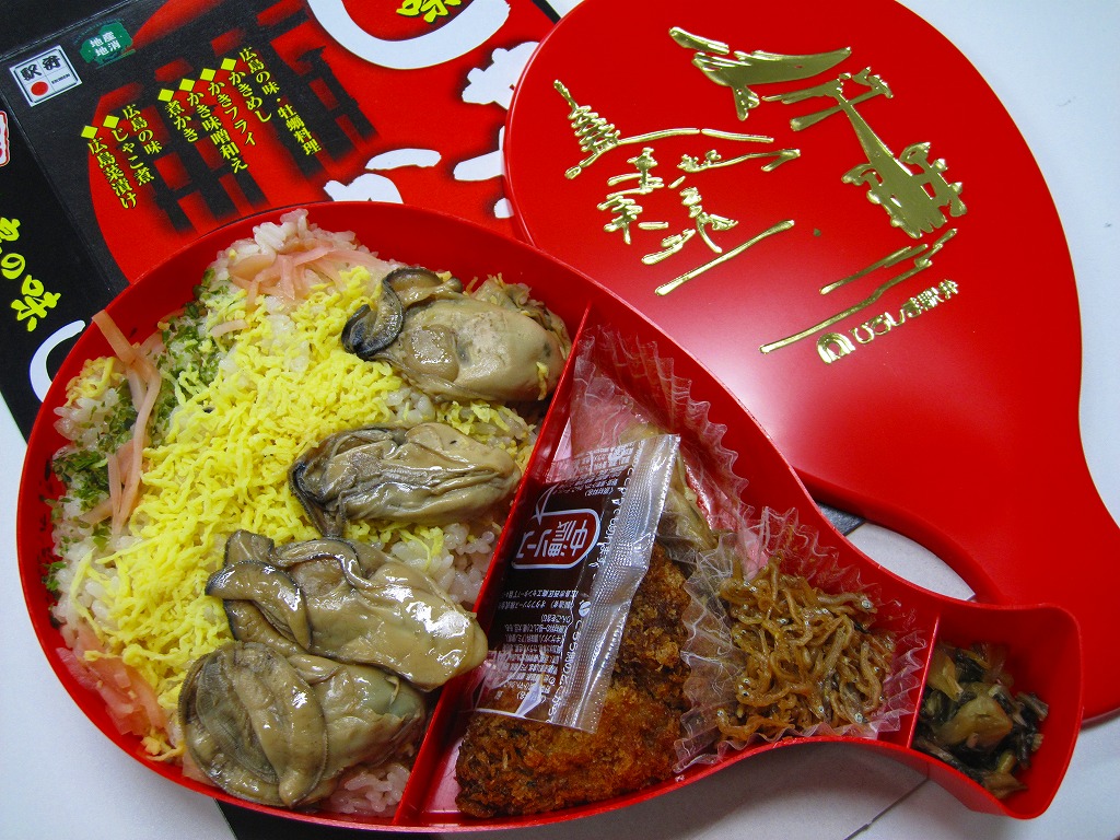 1968(昭和43)年に発売か。この駅弁のためだけに作られている、しゃもじ型の赤いプラスティック製容器を使用、これを中身の写真や商品名を大きく書いて、宮島の大鳥居のシルエットを描いたボール紙の箱に詰める。中身はカキ飯だし汁で炊いた御飯の上を錦糸卵、紅生姜、青のりで覆ったうえで煮カキを4個置き、カキフライ2個、カキの味噌和え、じゃこ煮、広島菜漬を添えるもの。10月頃から3月頃までの冬季限定発売。