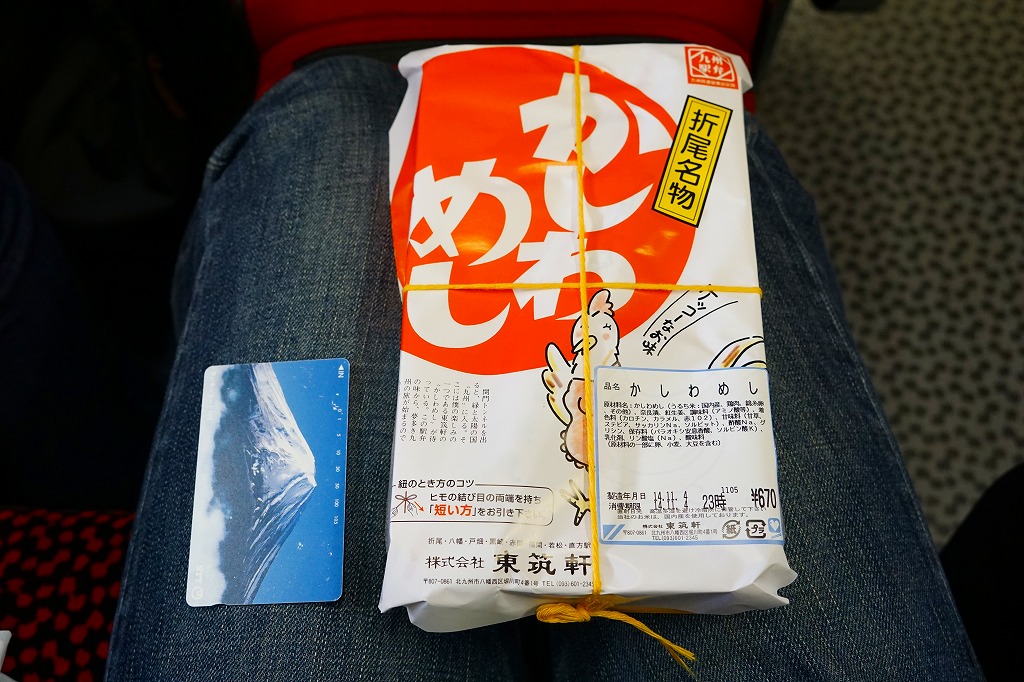 1921(大正10)年に発売。日本一の鶏飯駅弁とも評価される、折尾駅のかしわめし。昔ながらの経木の容器に、変わらぬデザインの掛紙をかけた中身は、鶏肉の炊き込み御飯の上に、刻み海苔と錦糸卵とフレーク状のかしわ(鶏)を載せた、九州北部を中心に山口県から鹿児島県まで駅弁で分布するかしわめし。秘伝の材料と製法で炊かれた御飯は口の中で甘く溶け、絶品と唸らせる味。