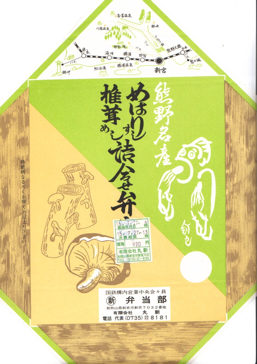 農林水産省の農林物資の規格化及び品質表示の適正化に関する法律による、2000(平成12)年3月31日の加工食品品質表示基準の制定に基づき、2001(平成13)年4月1日からすべての飲食料品に原材料等の表示が義務付けられました。2001(平成13)年8月25日の調製である左の駅弁掛紙に、上記「TRAiNG」で紹介した同年3月24日のものにはなかった食品表示ラベルが貼られています。