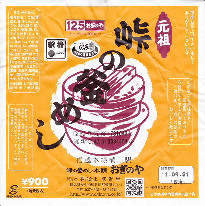 - 群馬県 信越本線 横川駅「峠の釜めし」(1,000円)※荻野屋