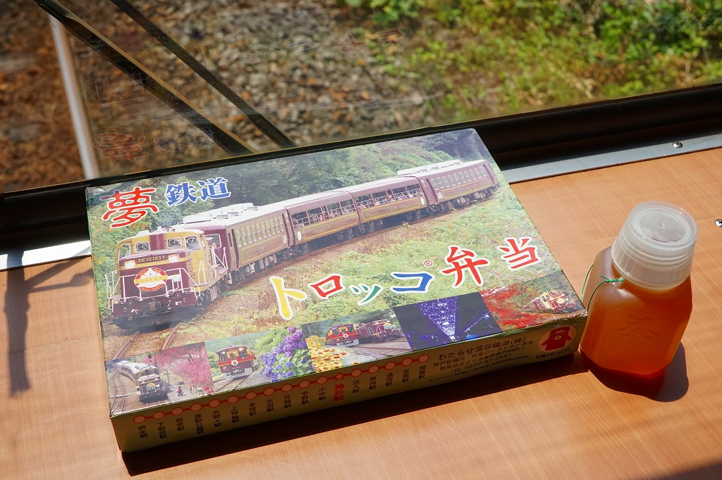 神戸駅のホーム上に据えた鉄道車両で駅弁を調製する、わたらせ渓谷鉄道直営の「レストラン清流」では、ポリ容器のお茶を100円で販売しています。2017年の購入時には、冷たいほうじ茶が入っていました。