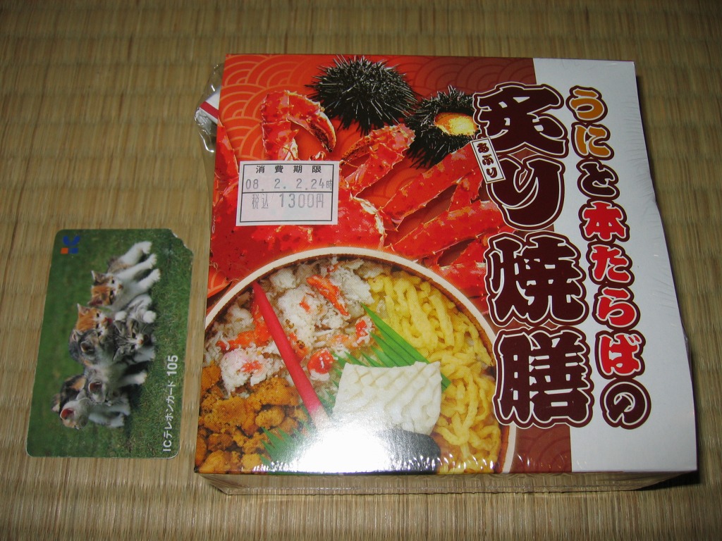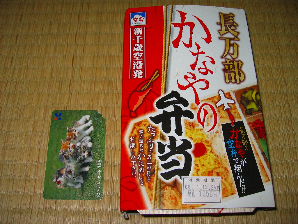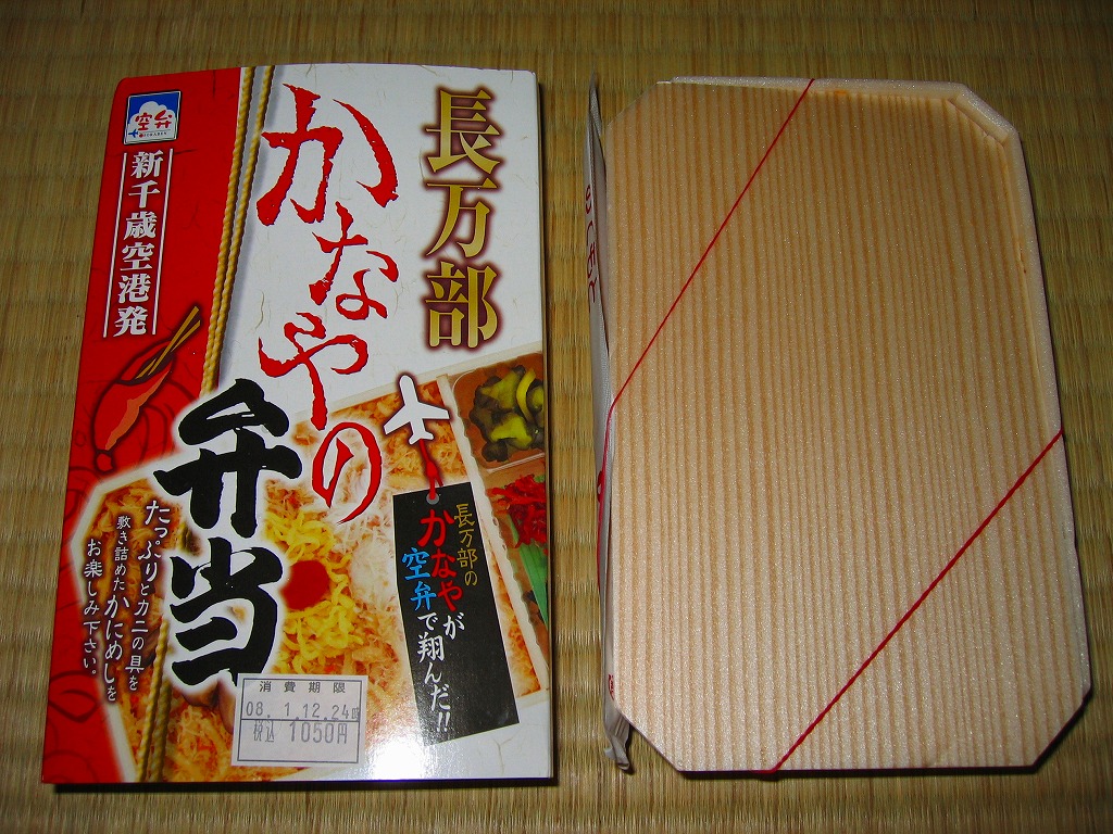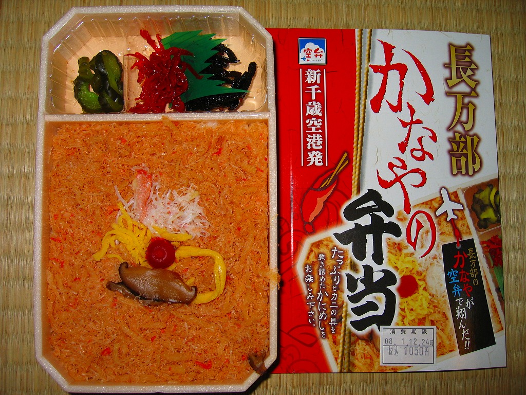 2007年の登場か。円形の発泡材容器に透明なふたをして、中身やカニやウニの写真を載せたボール紙の枠にはめてラップで包む。中身は酢飯の上を錦糸卵、カニ、ウニで覆い、イカと椎茸とはじかみを添えるもの。飯の上の半分が実は錦糸卵だが、具の味付けでなく添付の塩だれで塩気と水気を出すため、この地域でありふれるカニイクラ丼の駅弁や空弁より、風味はちょっとユニークになる。「炙り」の風味は特に感じなかった。現地での収穫報告を見ないのは、少々気に掛かる。 【新千歳空港】1926(大正15)年10月22日開港 北海道千歳市美々 http://www.new-chitose-airport.jp/ 【札幌バルナバフーズ株式会社弁当事業部】北海道千歳市美々 新千歳空港内ケータリングビル 0123(46)3472 http://www.barnabas.jp/ 長万部かなやの弁当(1,050円) 2008年1月12日にさいか屋藤沢店駅弁大会で購入