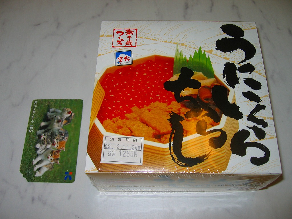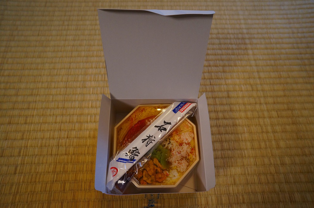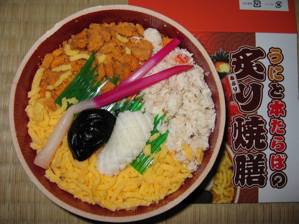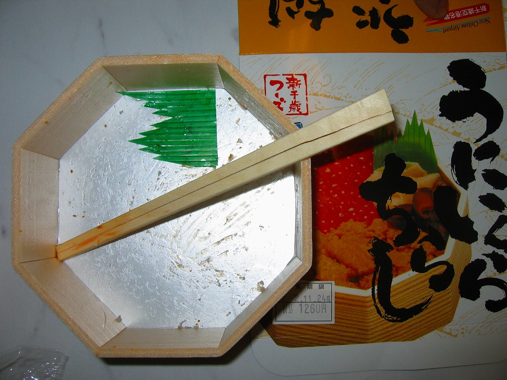 JR東京駅での駅弁大会で新千歳空港の空弁として販売されていた商品。正八角形の発泡材容器に透明なふたをして、白いデザインの紙箱に収める。中身は酢飯の上を錦糸卵とカニほぐし身で覆い、蒸しウニと海藻も詰めて、イクラと鮭漬を透明なトレーで添えるもの。新千歳空弁「石狩鮨」の佐藤水産の安定した味。 【新千歳空港】1926(大正15)年10月22日開港 北海道千歳市美々 http://www.new-chitose-airport.jp/ 【佐藤水産鮨株式会社】北海道千歳市美々新千歳空港内ケータリング施設内 0123(46)5824 http://www.sato-suisan.co.jp/ うにいくらちらし(1,260円) 2009年2月11日に上野松坂屋駅弁大会で購入