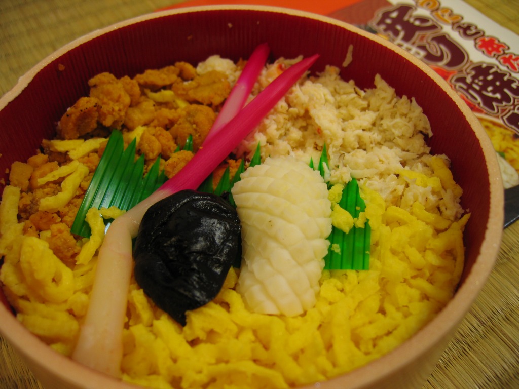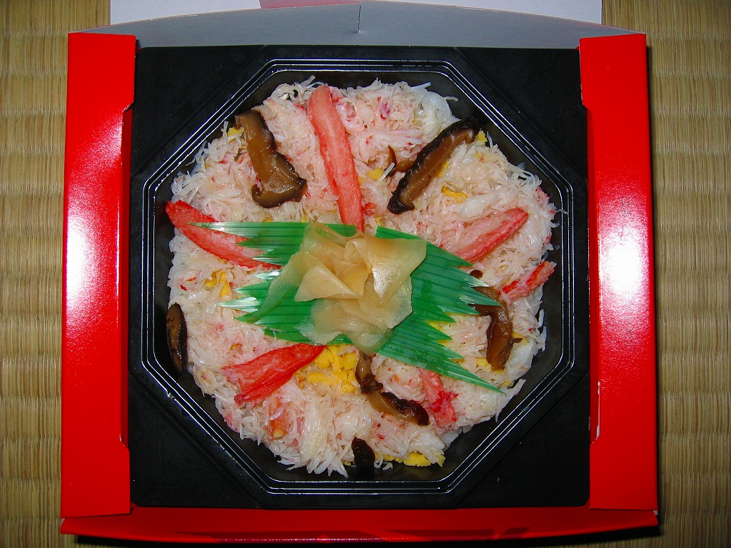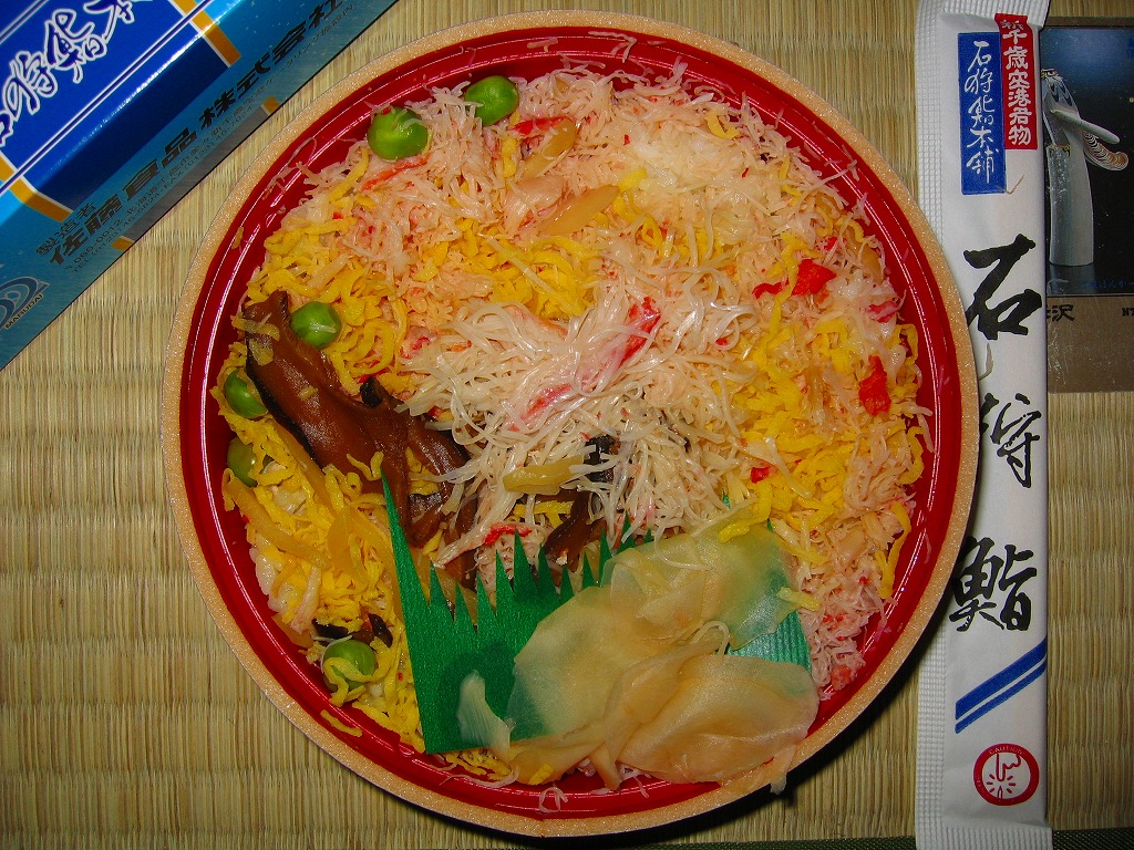 北海道新千歳空港の空弁。木目調の円形発泡材容器を、中身の写真を載せたボール紙の箱に詰める。中身は御飯の上に錦糸卵を敷いて、色がずいぶんとつややかなズワイガニのほぐし身に椎茸や生姜などを載せるもの。カニのほぐし身はこのように、酢飯ではなく白御飯でいただくほうが美味いと思う。 【新千歳空港】1926(大正15)年10月22日開港 北海道千歳市美々 http://www.new-chitose-airport.jp/ 【佐藤食品株式会社】北海道千歳市美々 新千歳空港ケータリング施設内 0123(46)5824 特選たらば鮨(1,100円) 2005年3月6日に日本橋三越の弁当大会で購入