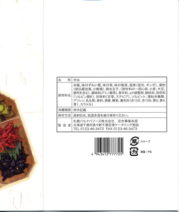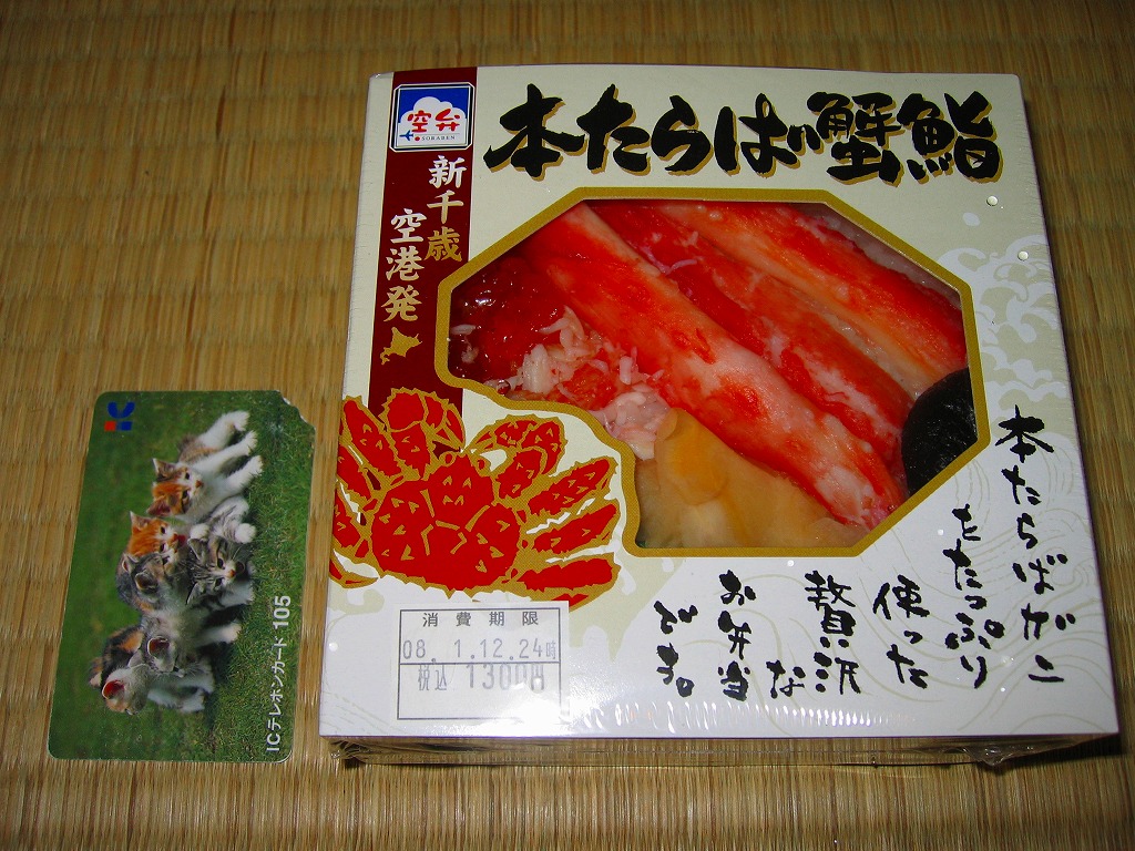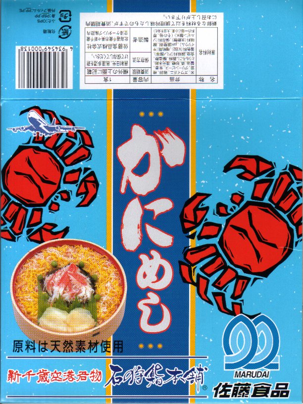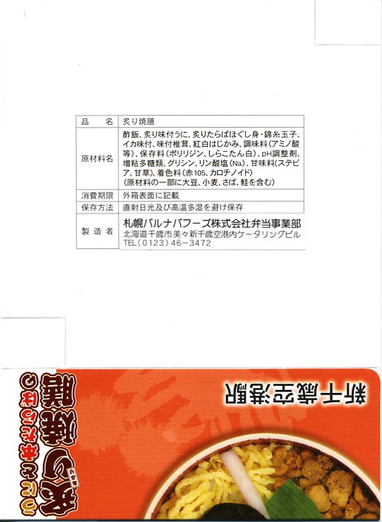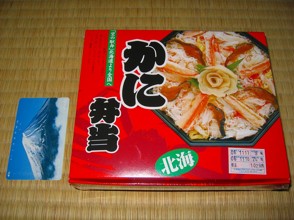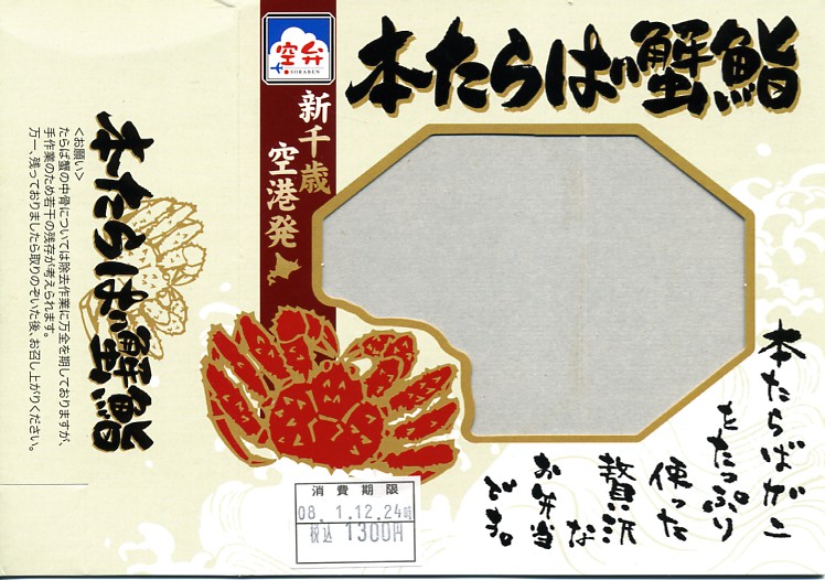 デパートの北海道物産展や駅弁大会で実演販売されるタイプの、カニ足とカニほぐし身とイクラが色鮮やかな海鮮弁当。こういう商品は現地に実態のないことが多いが、新千歳の空弁であればそういうことはほとんどなく、ターミナルビル内の売店で同じものが買えるはず。駅弁空弁収集をしていると食傷気味で、通常の旅行者や買い物客に感動を与える、北の風味。調製元は見慣れないが、2007年7月に北海道エアポートフーズサービスと札幌バルナバハムが合併し、北食往来の水産加工部門も吸収した新会社。 【新千歳空港】1926(大正15)年10月22日開港 北海道千歳市美々 http://www.new-chitose-airport.jp/ 【札幌バルナバフーズ株式会社空弁事業本部】北海道千歳市美々 新千歳空港内ケータリング施設 0123(46)3472 http://www.barnabas.jp/ かに弁当(1,020円) 2006年11月18日にユニーイセザキ店駅弁大会で購入