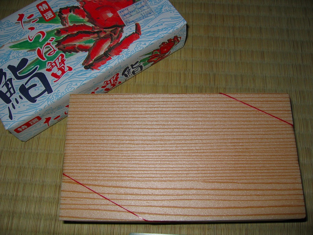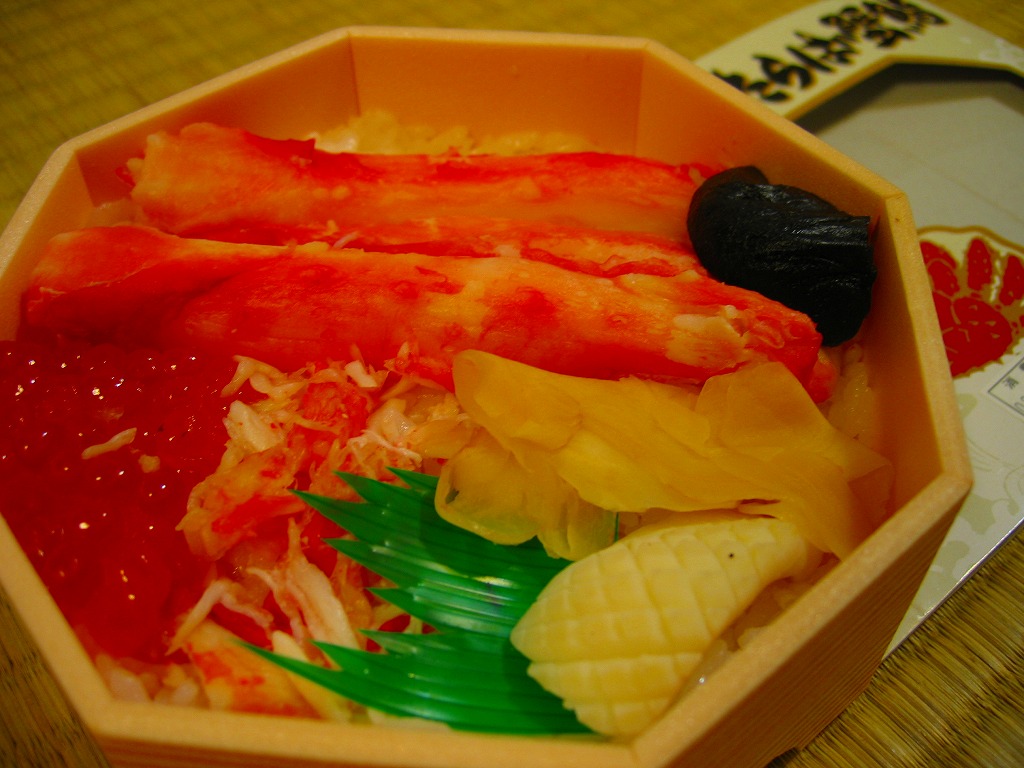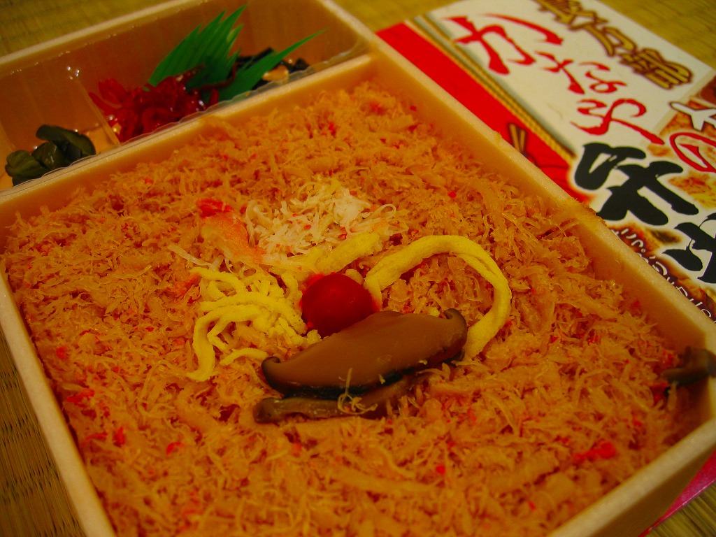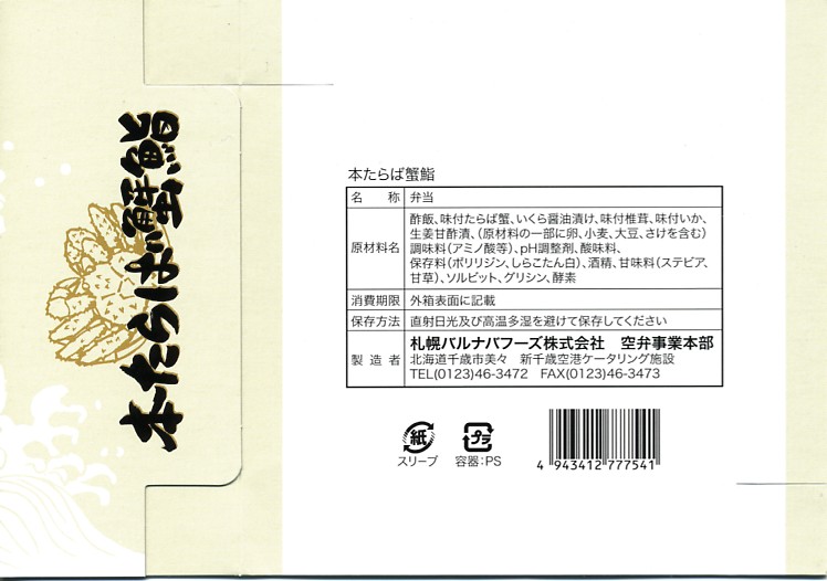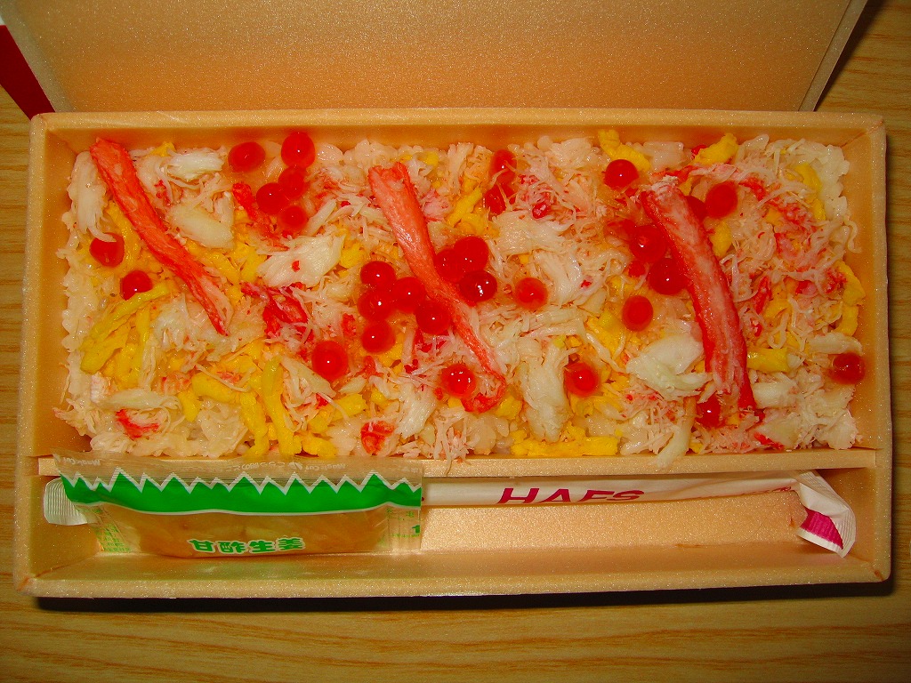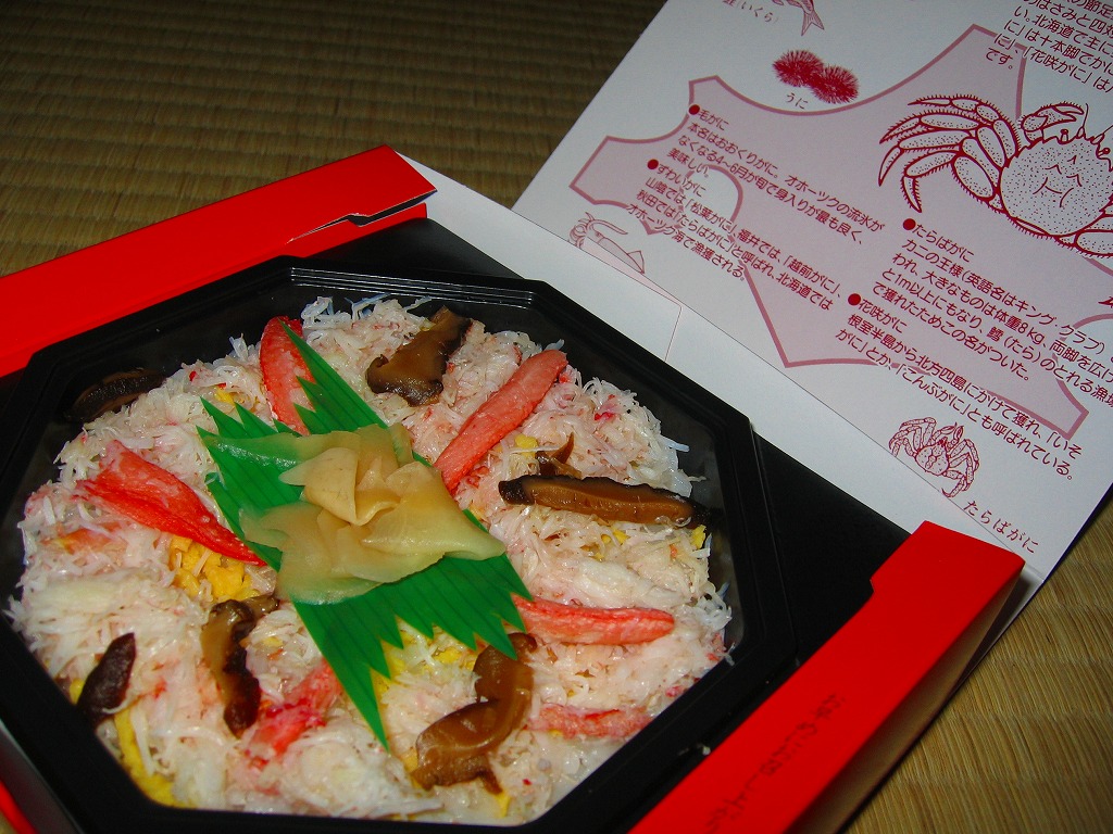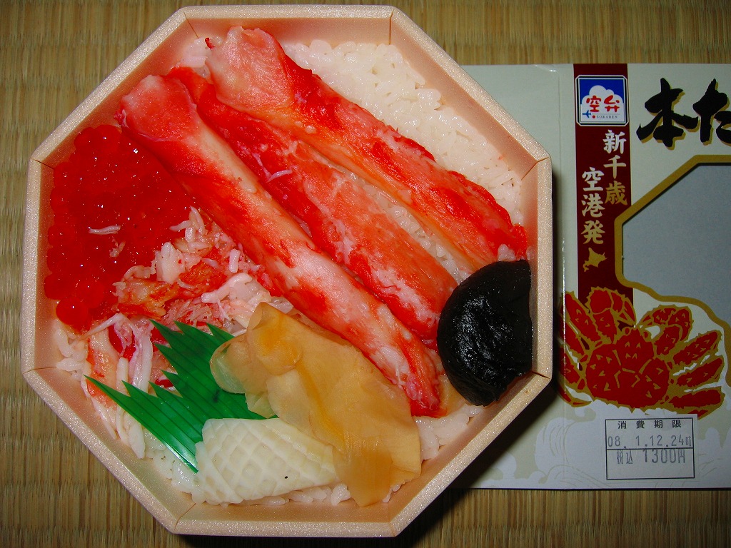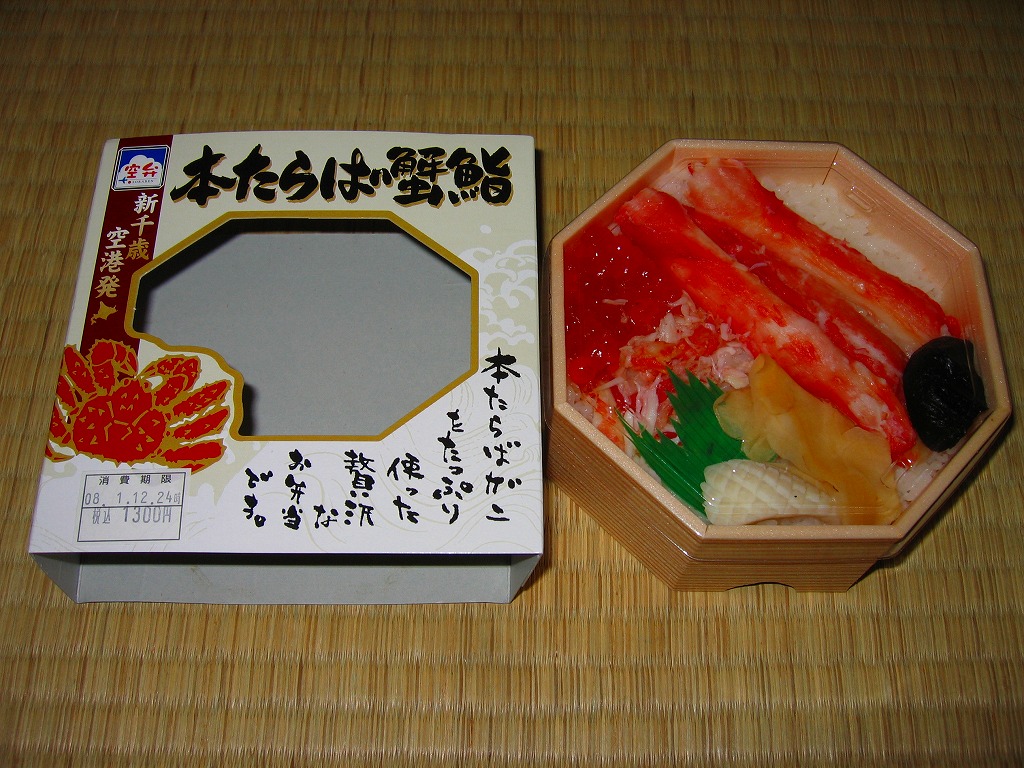 2007年10月に登場。1950年に登場したJR函館本線長万部駅の名物駅弁「かなやのかにめし」を新千歳の空弁にアレンジしたもので、御飯の上にタケノコ混じりのカニフレークが敷き詰められる。調製元が駅弁屋ではなく新千歳の空弁屋なので、製品ではなくレシピをもらってきたのだろう。 空港で人気の空弁だそうだが、発泡材の容器は曲がり、カニ飯はカニと飯の一体感に欠け、長万部のかなやであればこんな雑な仕事をしないはず。容器も駅弁では調湿機能に優れた経木(きょうぎ:薄く平たい木)製であり、風味も確実に駅弁が上。駅弁の評判を落とさず、長万部や駅弁を売り込めればよいが。 【新千歳空港】1926(大正15)年10月22日開港 北海道千歳市美々 http://www.new-chitose-airport.jp/ 【札幌バルナバフーズ株式会社空弁事業本部】北海道千歳市美々 新千歳空港内ケータリング施設 0123(46)3472 http://www.barnabas.jp/ 本たらば蟹鮨(1,300円) 2008年1月12日にさいか屋藤沢店駅弁大会で購入