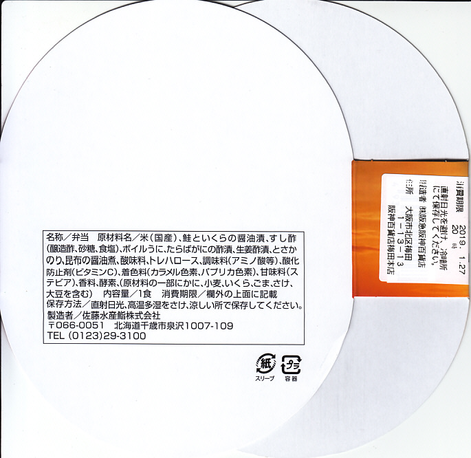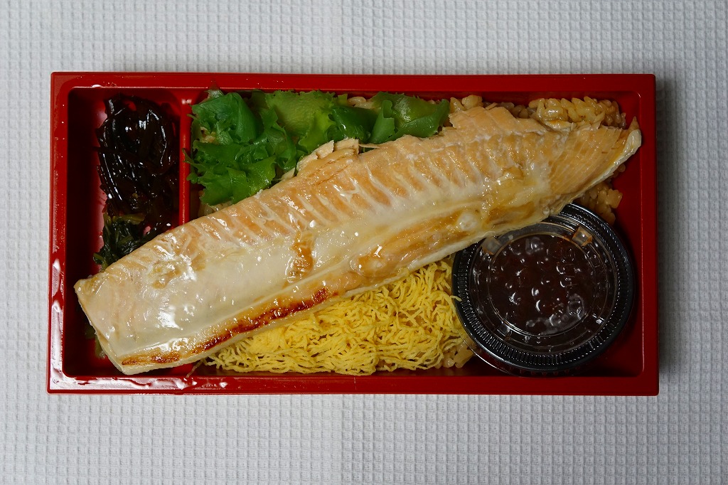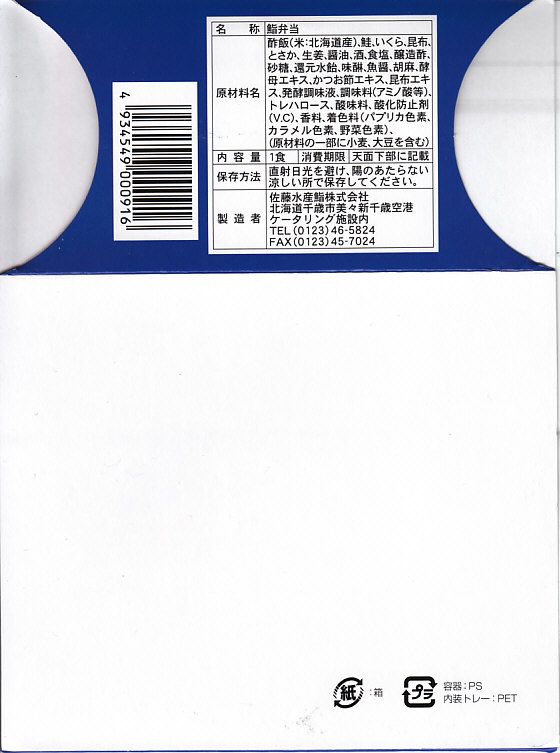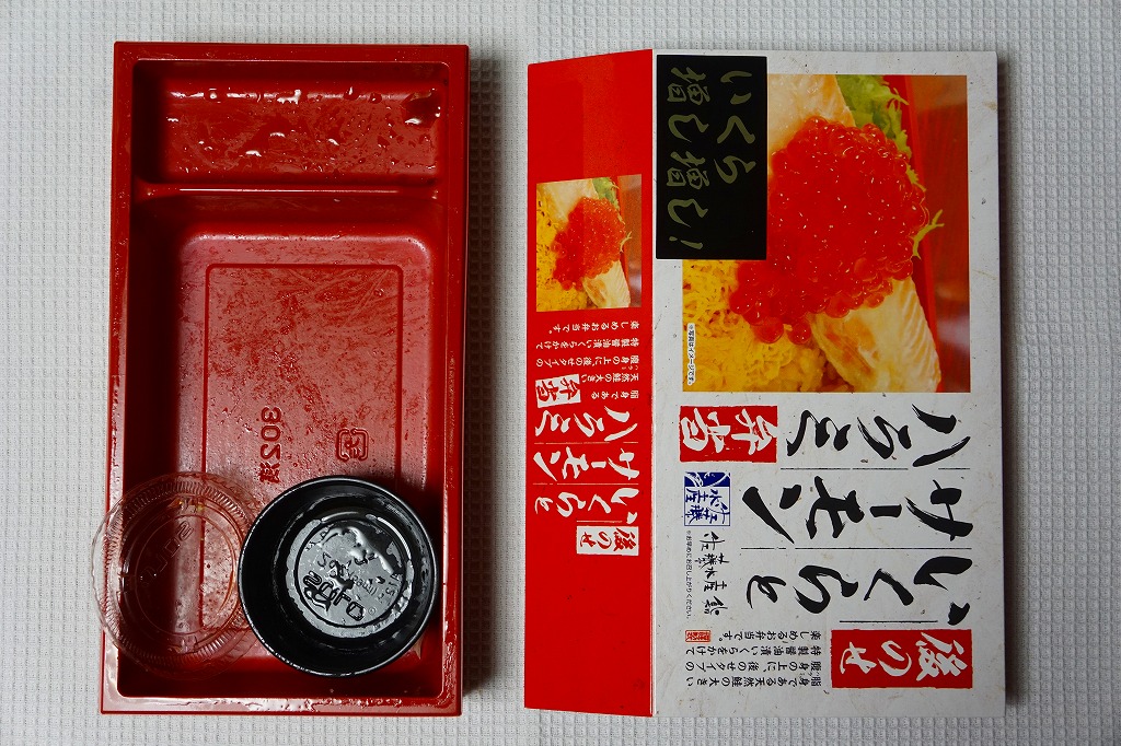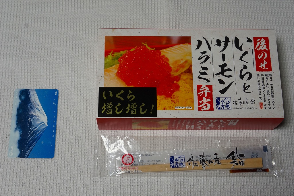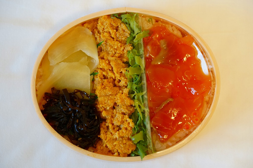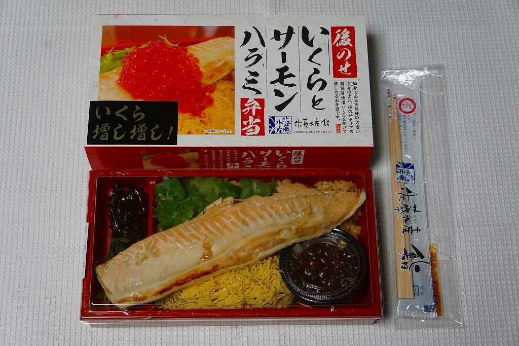 2018年の秋にスーパーの駅弁大会で発売か。2019年1月の阪神百貨店駅弁大会で新千歳空弁として実演販売。新千歳空港で実際に売られているかどうかは分からない。楕円形の容器に御飯を詰め、蒸しウニ、トサカノリ、ガリ、昆布で覆い、鮭ルイベ漬を薄く敷いた透明トレーを置く。昼も夜もうまそうな味なのに、催事場でお客さんが全然付いていなかった。 【新千歳空港】1926(大正15)年10月22日開港 北海道千歳市美々 http://www.new-chitose-airport.jp/ 【佐藤水産鮨株式会社】北海道千歳市泉沢1007−109 連絡先の記載なし http://www.sato-suisan.co.jp/ 後のせいくらとサーモンハラミ弁当(1,380円) 2018年1月28日に阪神百貨店駅弁大会で購入
