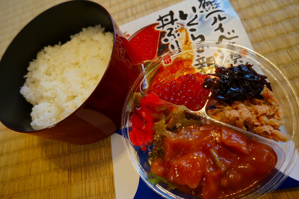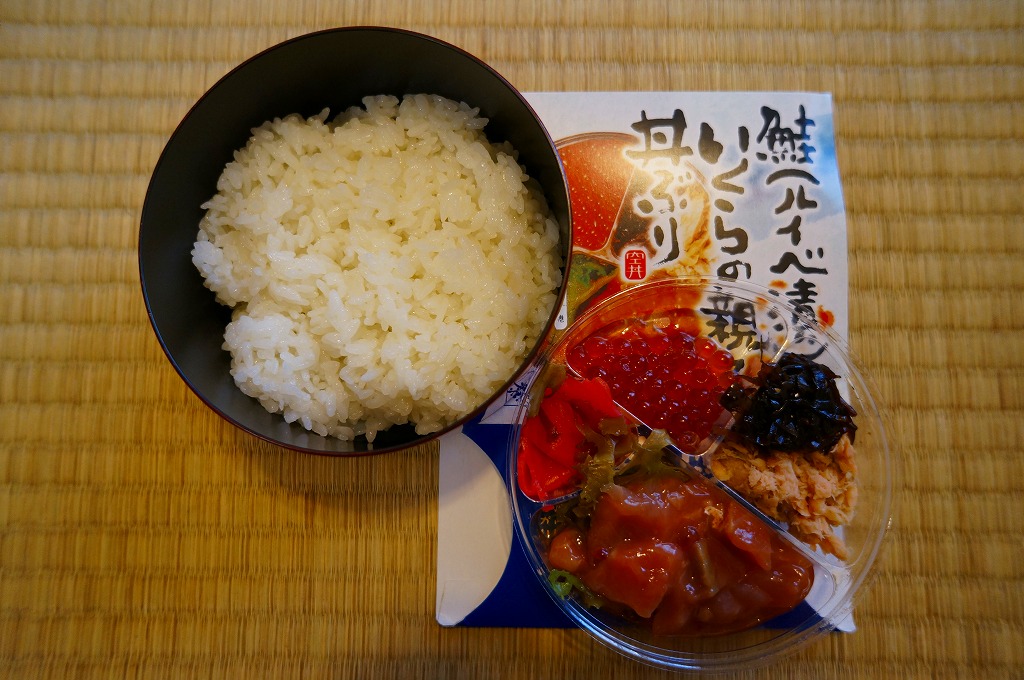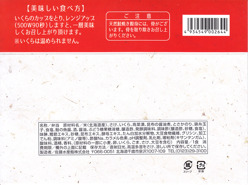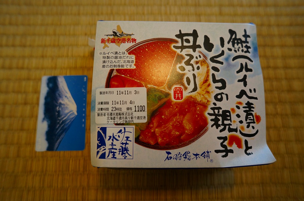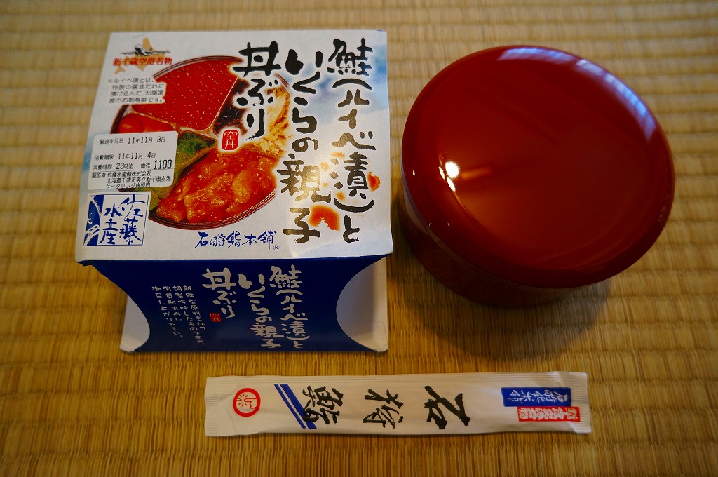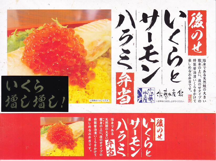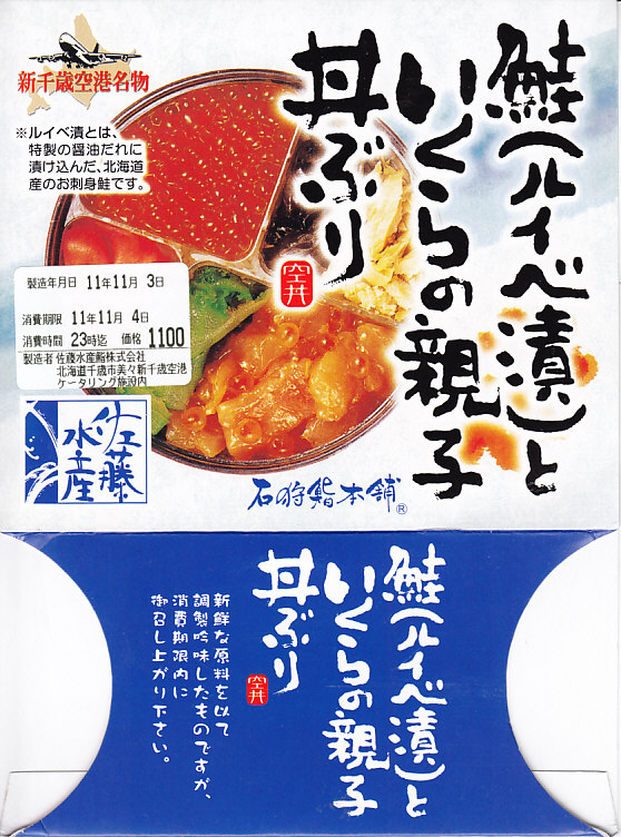 2017年の秋にスーパーの駅弁大会で発売か。翌2018年1月に阪神百貨店駅弁大会で実演販売、その数か月後に羽田空港で、秋頃には新千歳空港でも新商品として売られ始めた模様。茶飯にでっかいサーモンハラミ焼を横たえ、真っ黒になったイクラ醤油漬を小さなカップで添付し、「いくら増し増し!」のシールをスリーブに後付け。色は味に影響なし。これは百貨店の催事場で購入したもので、「いくら増し増し」でない1,180円の商品は見当たらなかった。 【新千歳空港】1926(大正15)年10月22日開港 北海道千歳市美々 http://www.new-chitose-airport.jp/ 【佐藤水産鮨株式会社】北海道千歳市美々新千歳空港内ケータリング施設内 0123(46)5824 http://www.sato-suisan.co.jp/ 鮭(ルイベ漬)といくらの親子丼ぶり(1,100円) 2011年11月4日に東京駅「東北応援ご当地うまいもん駅弁大会」で購入