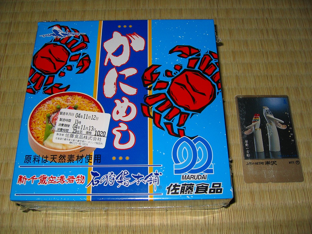 小さな木目調の蓋付き発泡材容器を、カニを描いたボール紙の枠にはめてラップで密封する。中身は酢飯の上にカニ脚とカニほぐし身と錦糸卵とイクラを散らすちらしずし。空弁らしく少量なのに価格はまともなので、カニがみずみずしく全体の風味も良い感じ。しかし空弁催事でない場所で買えたという報告が見付からず。本当に新千歳空港で買えるかどうかは分からない。 【新千歳空港】1926(大正15)年10月22日開港 北海道千歳市美々 http://www.new-chitose-airport.jp/ 【北海道エアポートフーズサービス株式会社】北海道千歳市美々 新千歳空港内ケータリング施設 0123(46)3472 【株式会社耕人舎】北海道千歳市美々 新千歳空港内 0123(46)5388 かにめし(1,020円) 2004年11月13日に東急ストア横浜店の駅弁大会で購入
