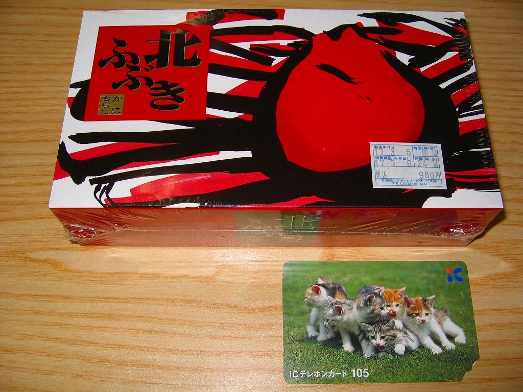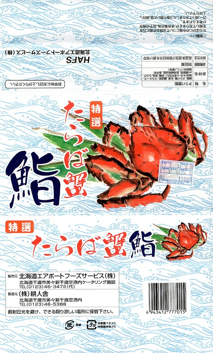 小さな木目調の蓋付き発泡材容器を輪ゴムで留めて、カニと海の波を描いた掛紙で巻いてラップで包む。中身は御飯の上にタラバガニほぐし身を敷き詰めるもの。カニは水気が豊かで御飯と共にとろける感じで淡い風味も楽しめるが、容器の強度がかなり小さいので食べているうちに崩壊しないかと心配した。高価で少量なので購入の際には気が引けるかも。 【新千歳空港】1926(大正15)年10月22日開港 北海道千歳市美々 http://www.new-chitose-airport.jp/ 【北海道エアポートフーズサービス株式会社】北海道千歳市美々 新千歳空港内ケータリング施設 0123(46)3472 【株式会社耕人舎】北海道千歳市美々 新千歳空港内 0123(46)5388 Copyright (C) 2006-2022 まっこうくじら |