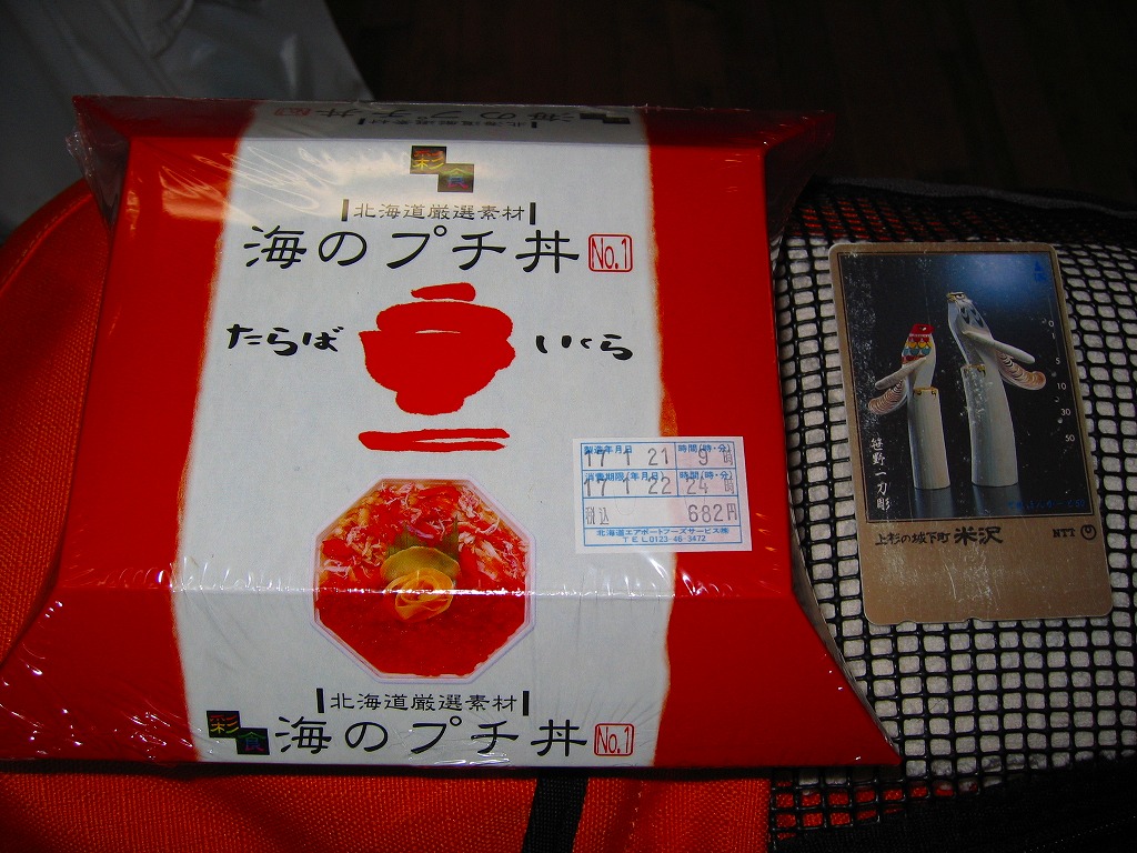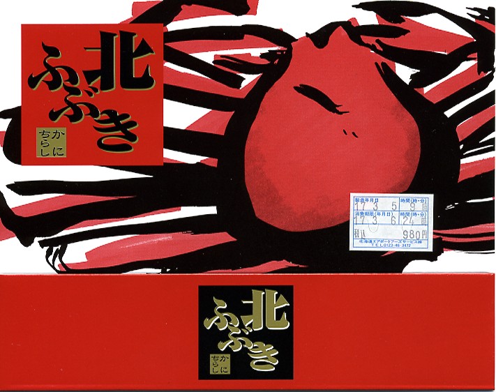 北海道新千歳空港の空弁。デパ地下風の惣菜用プラ容器を立体的なボール紙の箱に詰めてラップで包装する。中身は御飯の上にタラバガニほぐし身とイクラが載るのだが、購入時に販売員から確認されたとおり、分量はコンビニおにぎり一個分程度の少量なので、写真ではイクラがとても大きく見える。少食向けにしても程があるが、新千歳空弁の多様さは感じられる。 【新千歳空港】1926(大正15)年10月22日開港 北海道千歳市美々 http://www.new-chitose-airport.jp/ 【北海道エアポートフーズサービス株式会社】北海道千歳市美々 新千歳空港内ケータリング施設 0123(46)3472 【株式会社耕人舎】北海道千歳市美々 新千歳空港内 0123(46)5388 北ふぶき かにちらし(980円) 2005年3月6日に日本橋三越の弁当大会で購入