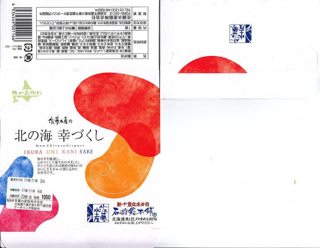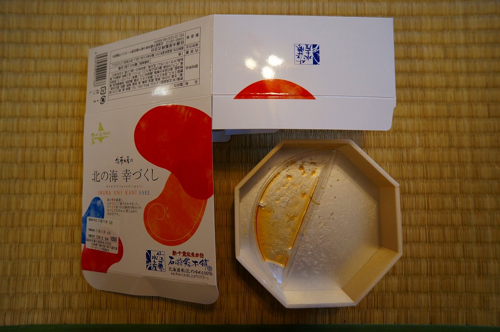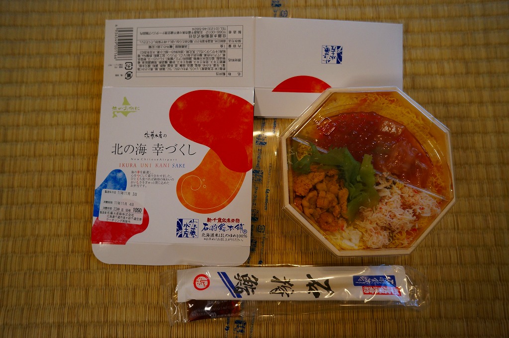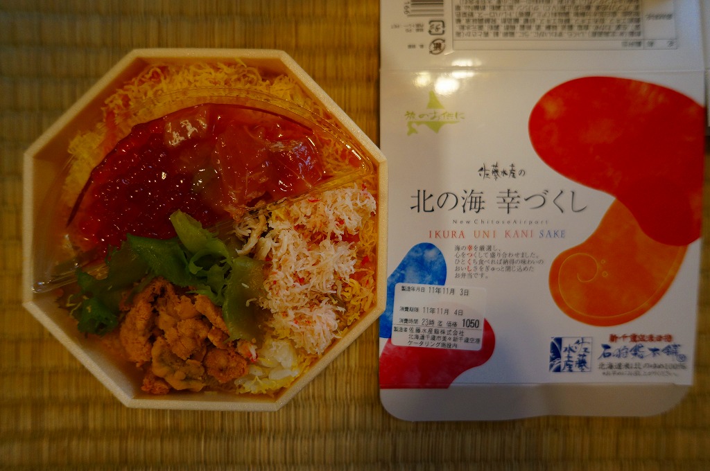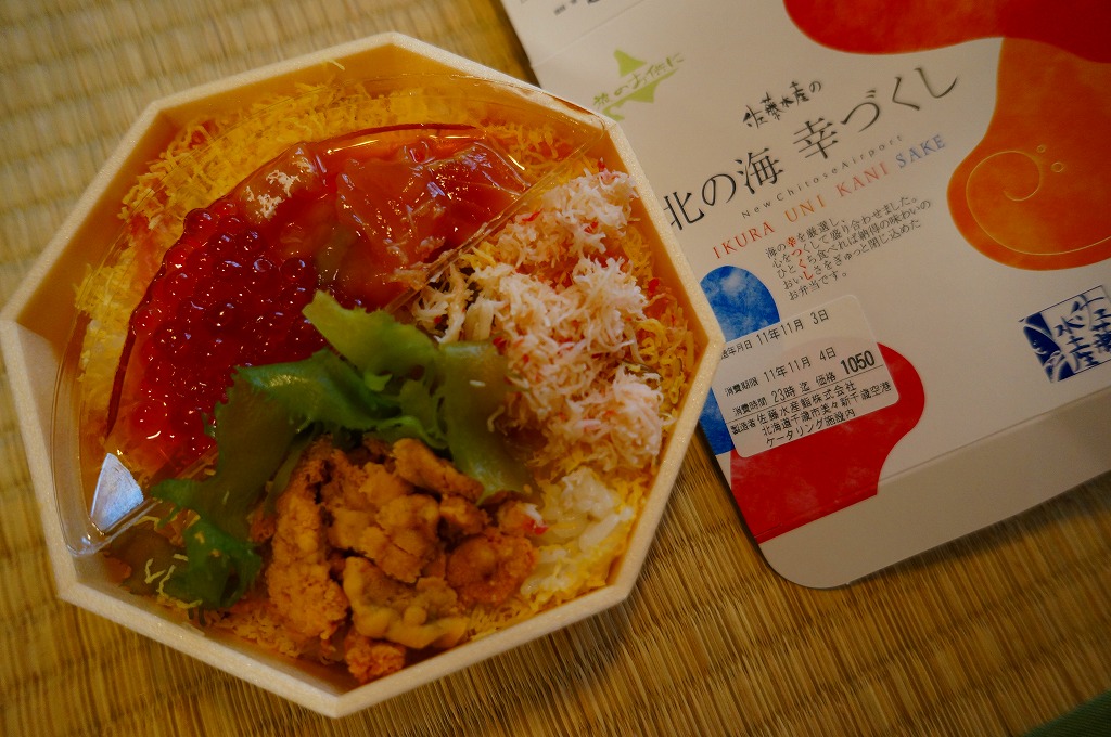 JR東京駅での駅弁大会で新千歳空港の空弁として販売されていた商品。JR旭川駅の駅弁でも使われる、円形で強度がある漆器風のプラスティック製容器を、商品名や中身の写真を印刷したボール紙の枠にはめる。中身は酢飯と、ふた付きの透明なトレーに収めた鮭ルイベ漬にイクラと鮭フレークや海草類。まるで催事を意識したような容器と構造を持つ商品。味はいつもどれも良好。 【新千歳空港】1926(大正15)年10月22日開港 北海道千歳市美々 http://www.new-chitose-airport.jp/ 【佐藤水産鮨株式会社】北海道千歳市美々新千歳空港内ケータリング施設内 0123(46)5824 http://www.sato-suisan.co.jp/ 北の海幸づくし(1,050円) 2011年11月4日に東京駅「東北応援ご当地うまいもん駅弁大会」で購入