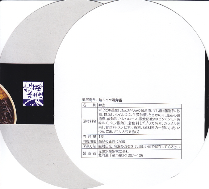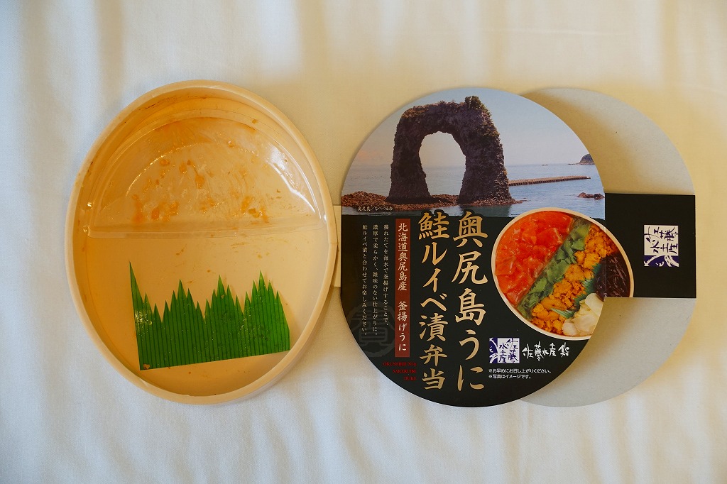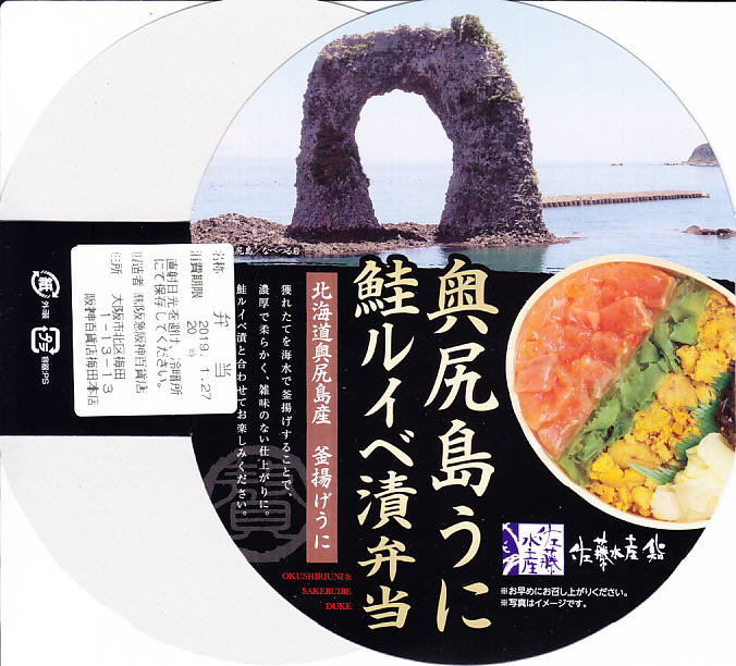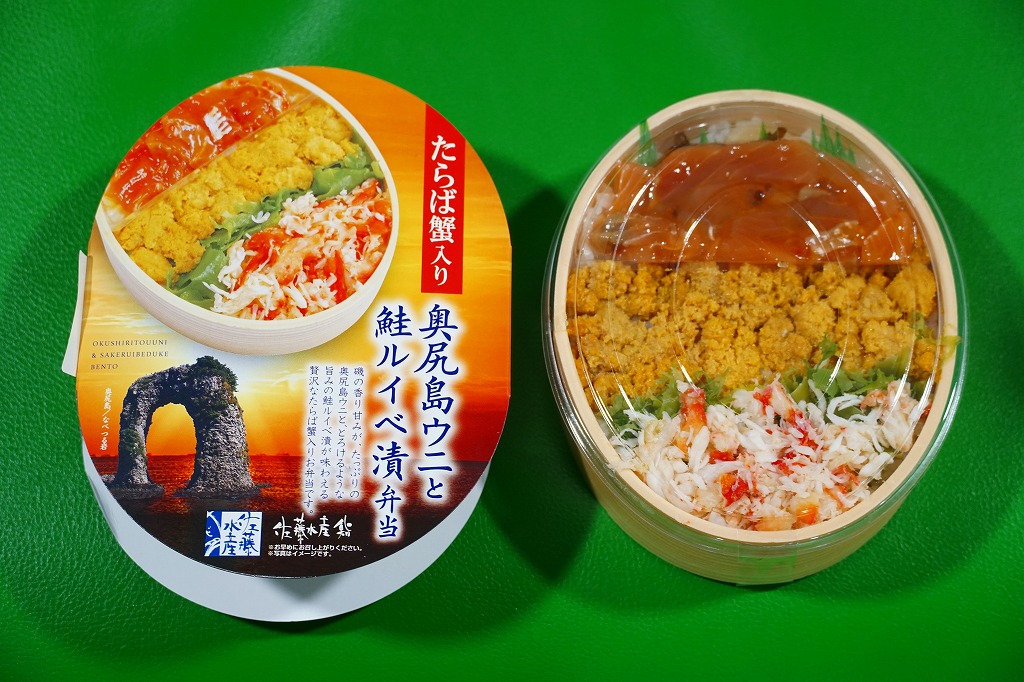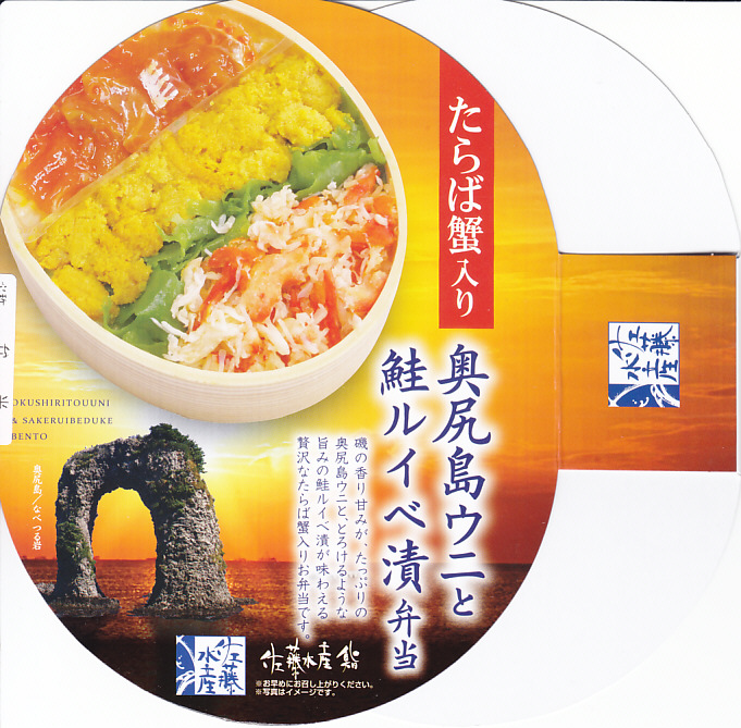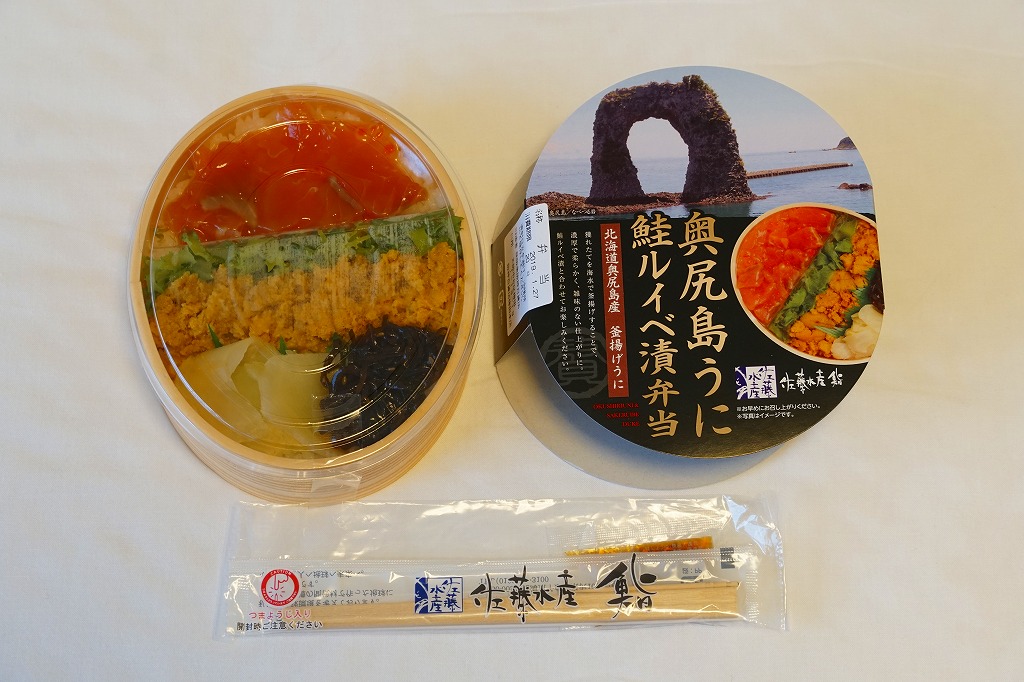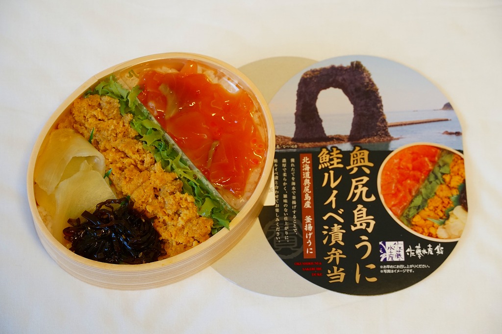 2019年1月の阪神百貨店駅弁大会で新千歳空弁として実演販売。新千歳空港など、これ以外の場所で売られたかどうかは分からない。楕円形の容器に御飯を詰め、蒸しウニ、カニほぐし身、昆布で覆い、鮭ルイベ漬を薄く敷いた透明トレーを置く。下の「奥尻島うに鮭ルイベ漬弁当」とほぼ同じものだが、スリーブの絵柄が大きく異なり、商品名も微妙に異なる。昼も夜もうまそうな味なのに、催事場でお客さんが全然付いていなかった。 【新千歳空港】1926(大正15)年10月22日開港 北海道千歳市美々 http://www.new-chitose-airport.jp/ 【佐藤水産鮨株式会社】北海道千歳市泉沢1007−109 0123(29)3100 http://www.sato-suisan.co.jp/ 奥尻島うに鮭ルイベ漬弁当(1,280円) 2019年1月27日に阪神百貨店駅弁大会で購入