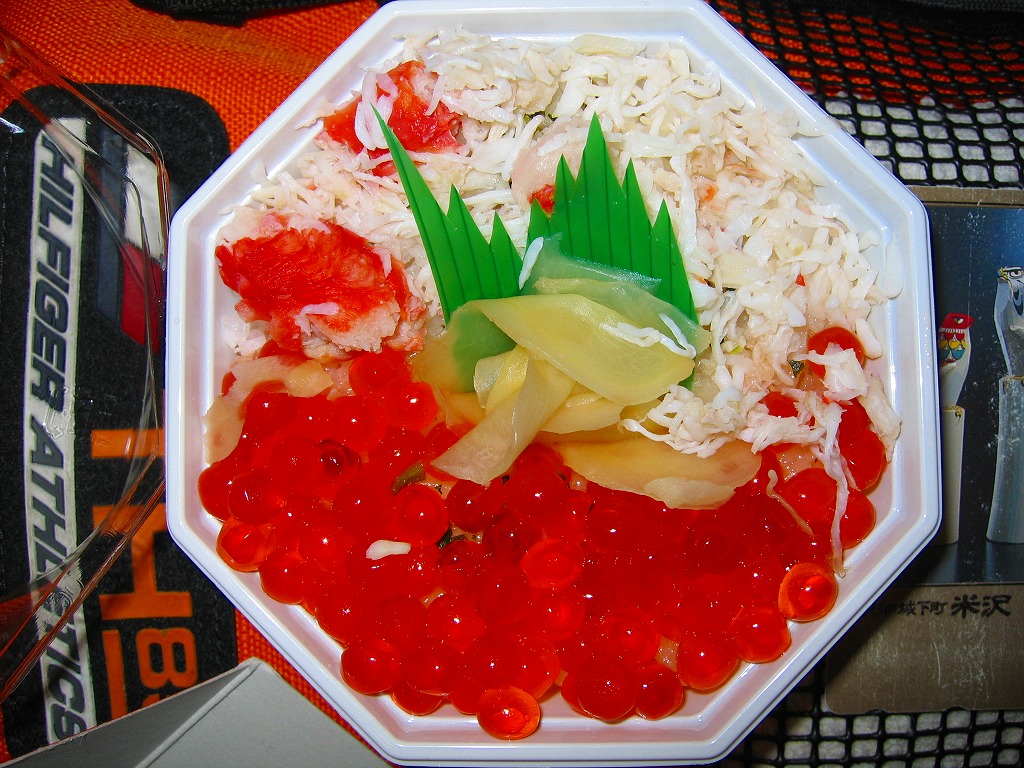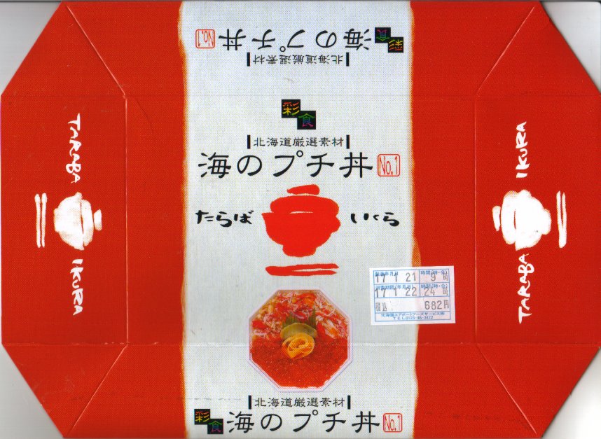 2003年9月中旬に北海道新千歳空港で登場した空弁。酢飯の上にニシン甘露煮と味付けカズノコを並べて、白いトレーに詰めて中身の盛り付け例の写真を載せるボール紙のパッケージにはめる。価格も分量も空弁らしい手頃さを備えていると思う。やん衆とは主に北海道のニシン漁師を意味するそうな。 【新千歳空港】1926(大正15)年10月22日開港 北海道千歳市美々 http://www.new-chitose-airport.jp/ 【北海道エアポートフーズサービス株式会社】北海道千歳市美々 新千歳空港内ケータリング施設 0123(46)3472 http://www.ana.co.jp/group/kigyo/079.htm 【株式会社耕人舎】北海道千歳市美々 新千歳空港内 0123(46)5388 海のプチ丼 たらばいくら(682円) 2005年1月22日に京王百貨店駅弁大会で購入