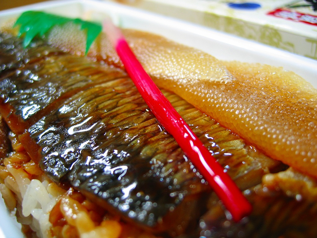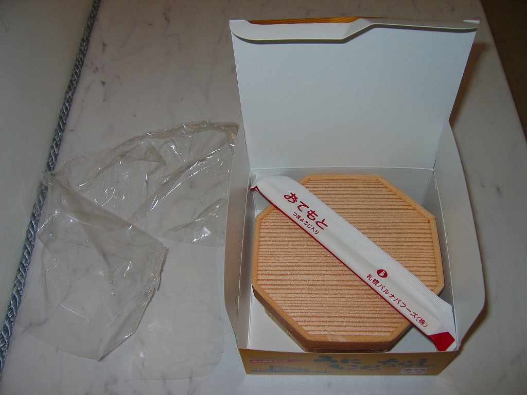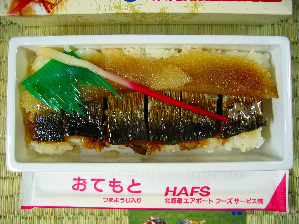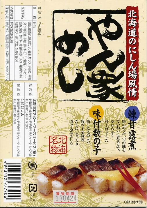 空弁ブームの前から新千歳空港や駅弁催事に出ていた老舗。赤いボール紙箱に収まる、正八角形のくぼみを持った黒いプラスティック製トレーの中に酢飯を詰めて、味付けズワイガニのほぐし身で覆い、その脚肉を5本、同心円状に並べる。 中身や風味は今となっては特段の感想がないが、これはおそらくむしろ時代が追いついてきたもの。空弁という言葉が定着した今では、パッケージ記載の「空の駅弁」というフレーズが新鮮に思える。 【新千歳空港】1926(大正15)年10月22日開港 北海道千歳市美々 http://www.new-chitose-airport.jp/ 【北海道エアポートフーズサービス株式会社】北海道千歳市美々 新千歳空港内ケータリング施設1F 0123(46)3472 やん衆めし(840円) 2005年4月24日に西武百貨店池袋店物産展で購入
