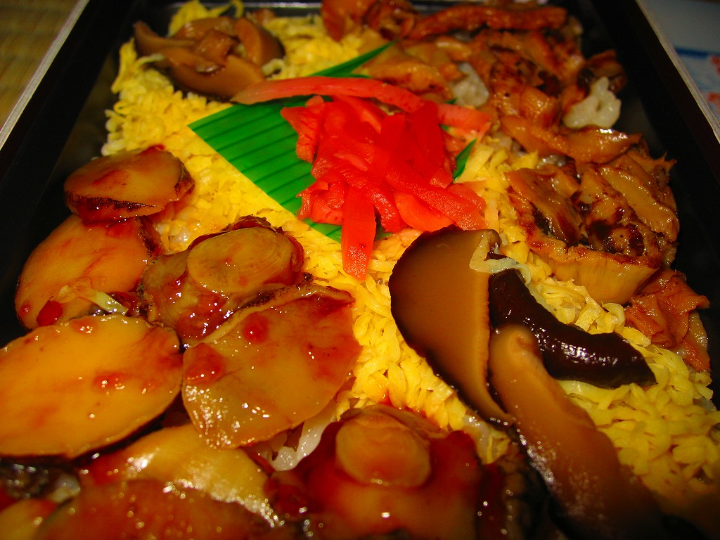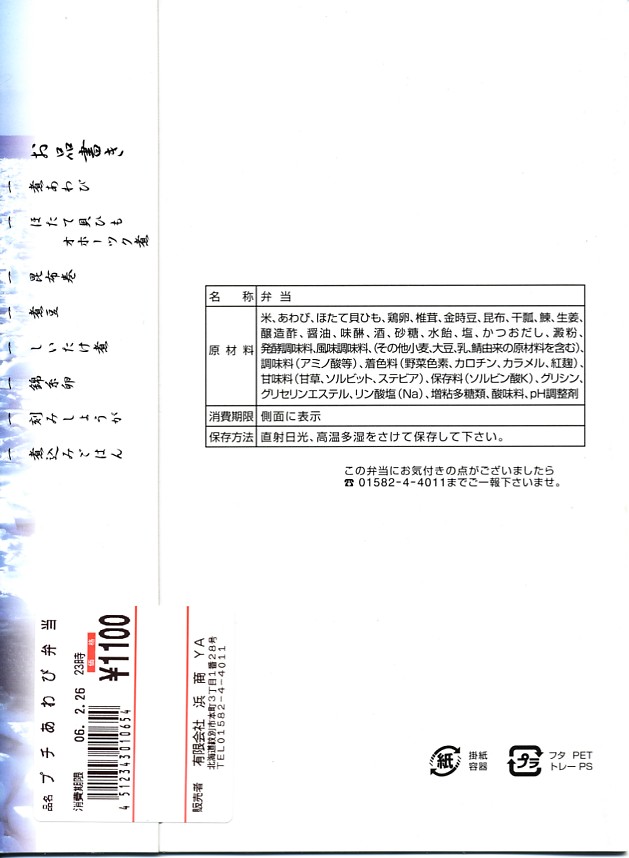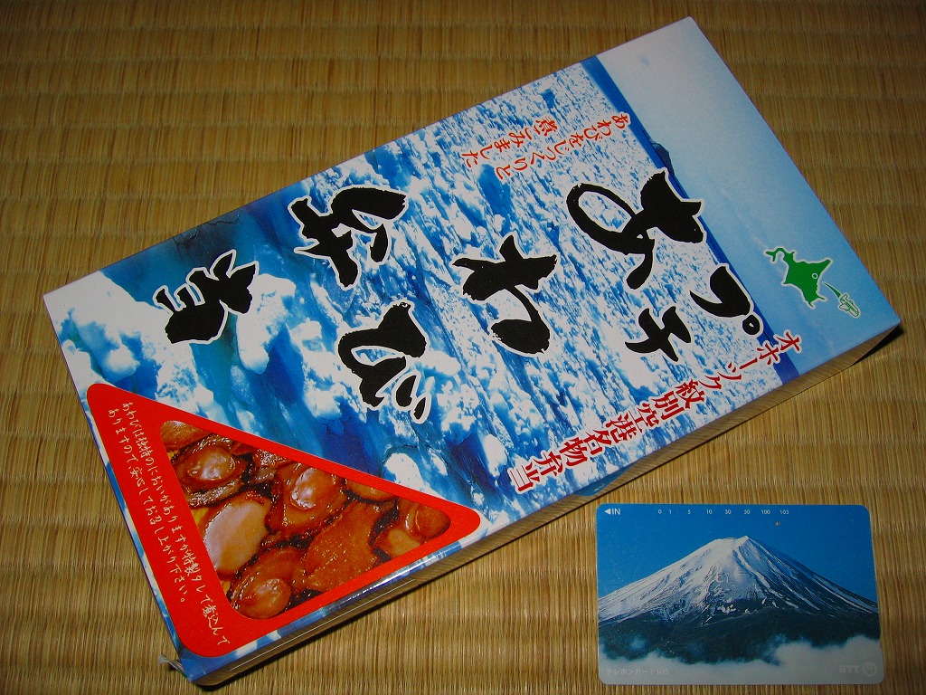北海道・オホーツク紋別空港の空弁として横浜市内のスーパーで販売されていたもの。厚紙の長方形容器に透明なプラ製ふたをして、流氷の写真を載せた紙枠にはめる。中身は茶飯の上に貝柱抜き帆立、錦糸卵と椎茸、プチあわびを載せて、昆布巻と金時豆を添える。パッケージで注意されるような独特のにおいは特に感じなかったが、空弁の真偽に関するにおいはビンビンに感じる。 【オホーツク紋別空港】1966(昭和41)年7月21日開港 北海道紋別市小向19−3 http://www.okhotsk.pref.hokkaido.lg.jp/kk/akk/rjeb1.htm 【有限会社浜商YA】北海道紋別市本町3−1−28 01582(4)4011 Copyright (C) 2006-2022 まっこうくじら |