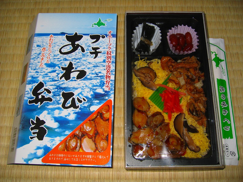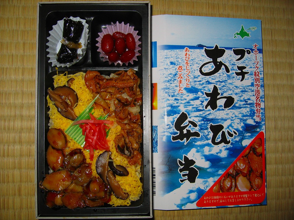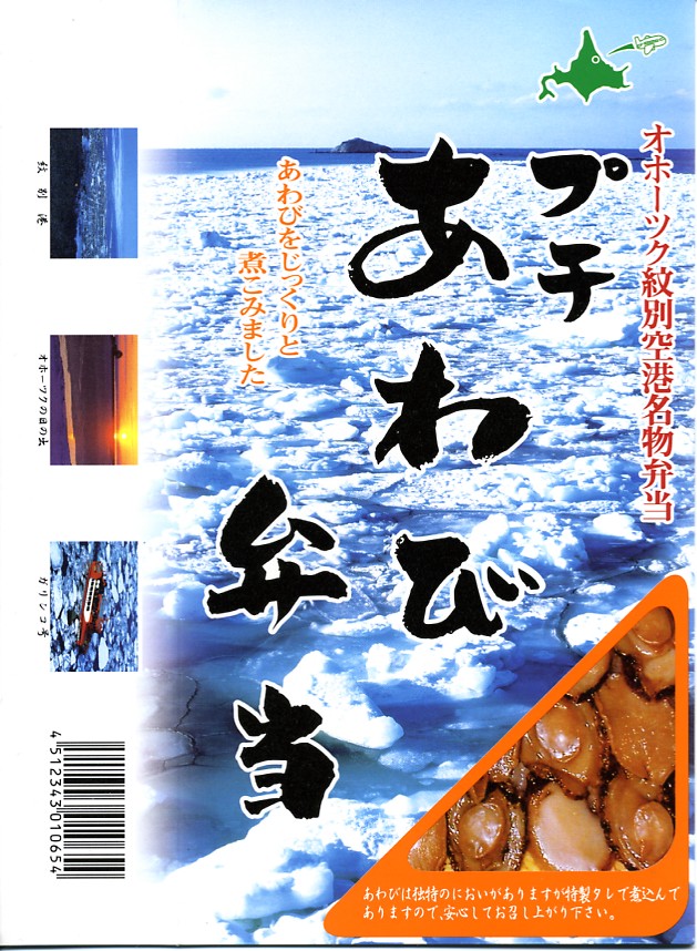 北海道・オホーツク紋別空港の空弁として横浜市内のスーパーで販売されていたもの。小判型の黒いプラスティック製容器をオレンジ色のボール紙枠に収める。中身は酢飯の上に鮭フレーク、イクラ、蒸しウニ、ズワイガニフレーク、帆立、錦糸卵と、北海道らしい内容のお弁当。調製元は紋別市内の仕出し弁当屋さん。 オホーツク紋別空港は1999(平成11)年11月11日に立派な新ターミナルビルが完成、滑走路もジェット機対応の2000メートルに延伸され、新千歳と羽田にジェット便が開設されたが、新千歳便は利用低迷でわずか一年半で廃止、代わりの丘珠便も2003年9月で二年半の運行をやめて、現在は東京便一往復のためだけにある空港。そんな空港で、本当に空弁が売られているのかどうか。 【オホーツク紋別空港】1966(昭和41)年7月21日開港 北海道紋別市小向19−3 http://www.okhotsk.pref.hokkaido.lg.jp/kk/akk/rjeb1.htm 【有限会社 浜商】北海道紋別市本町3−1−28 01582(4)4011 プチあわび弁当(1,155円) 2006年2月26日にフーデックスプレス山下公園店駅弁大会で購入
