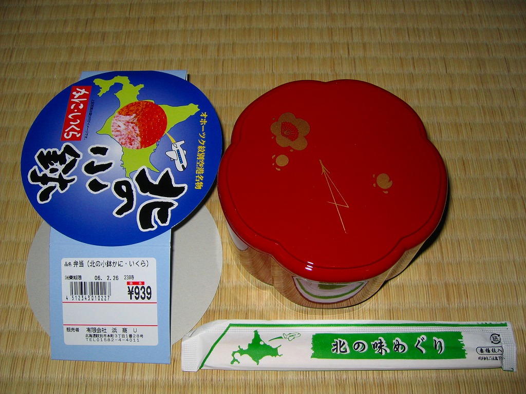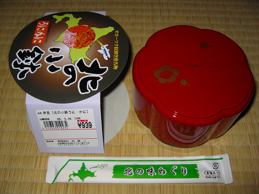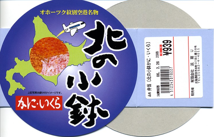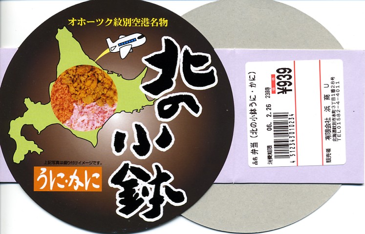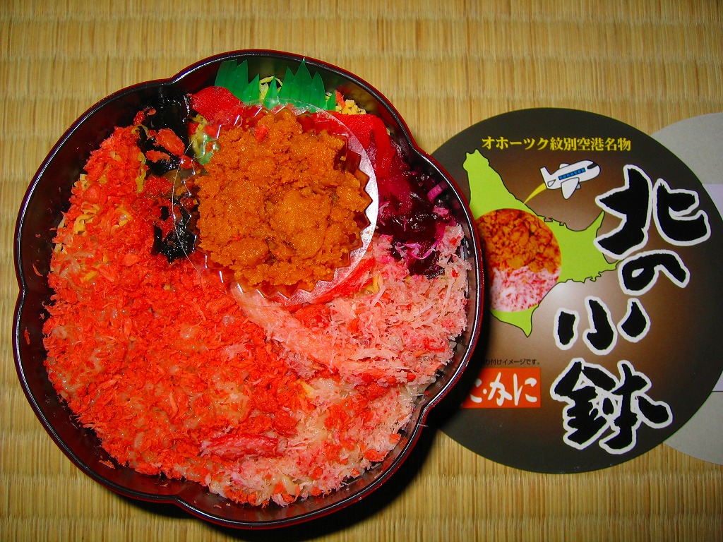 漆器調のプラ製花形容器を、アマチュア風なデザインの紙枠にはめて、割り箸を刺す。中身は茶飯の上を錦糸卵で覆い、鮭フレークとカニ粉などと、カップでたぶんイクラなどを載せるもの。駅弁大会で買える旭川や苫小牧の駅弁に深川や静内の偽駅弁と、風味や価格や内容や作りがとても似ていて、パッケージがなければ差異を見いだせない。 【オホーツク紋別空港】1966(昭和41)年7月21日開港 北海道紋別市小向19−3 http://www.okhotsk.pref.hokkaido.lg.jp/kk/akk/rjeb1.htm 【有限会社浜商U】北海道紋別市本町3−1−28 01582(4)4011 北の小鉢うに・かに(980円) 2006年2月26日にフーデックスプレス山下公園店駅弁大会で購入