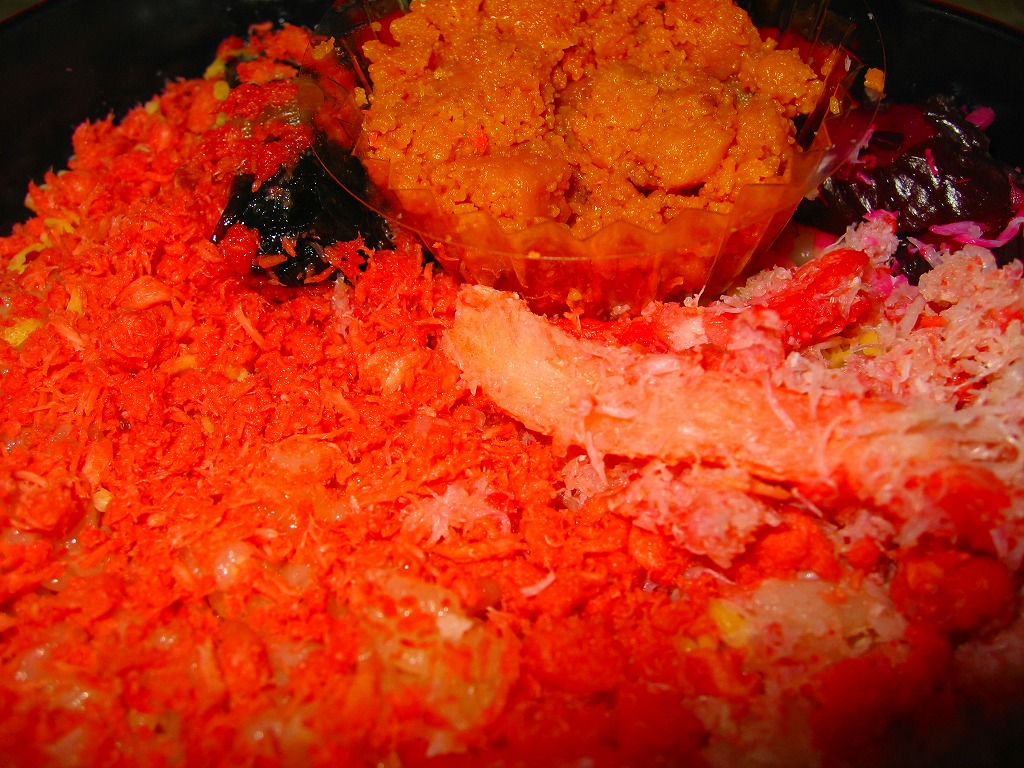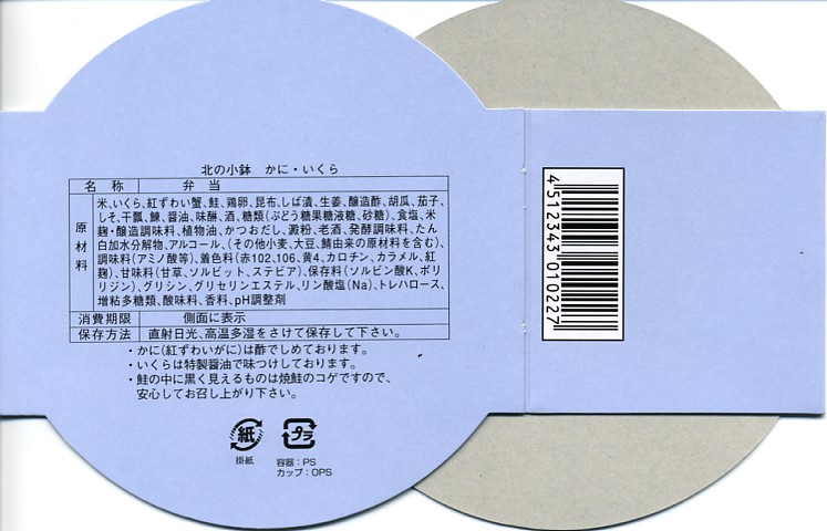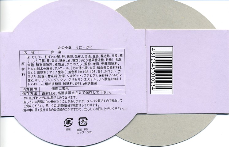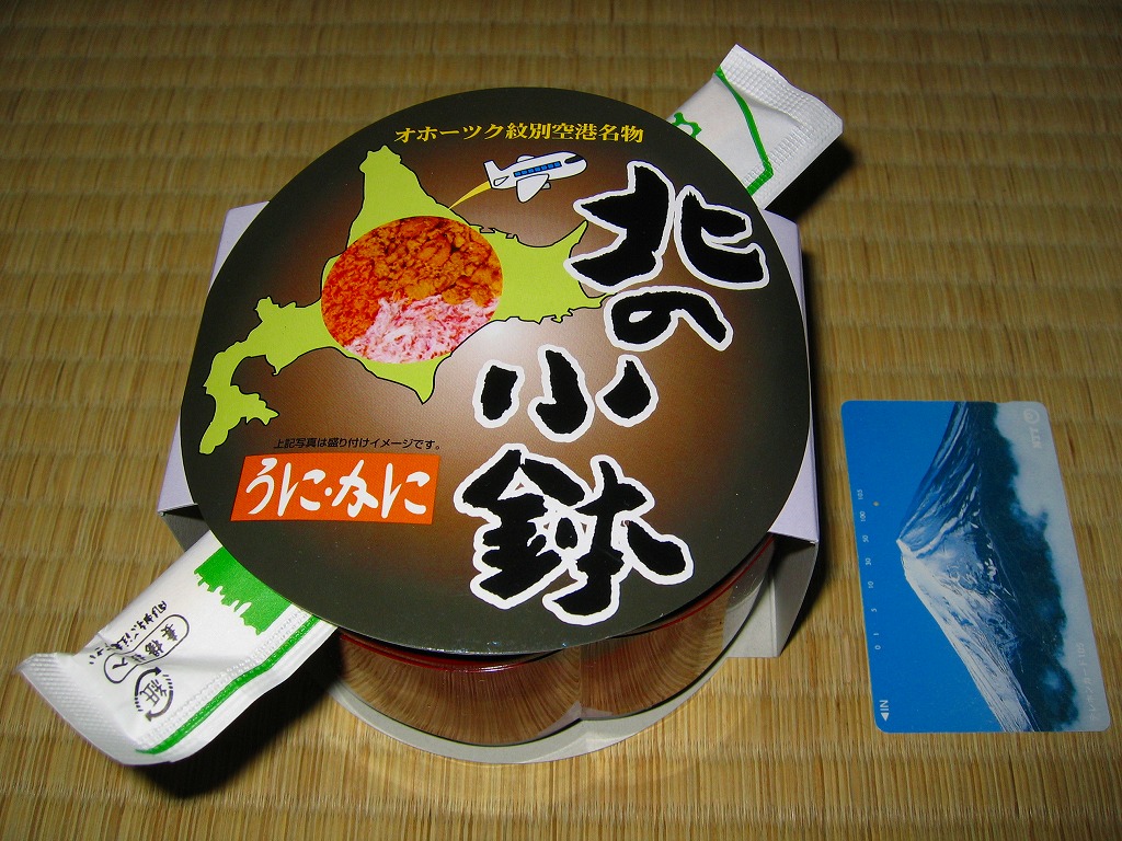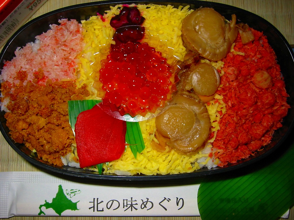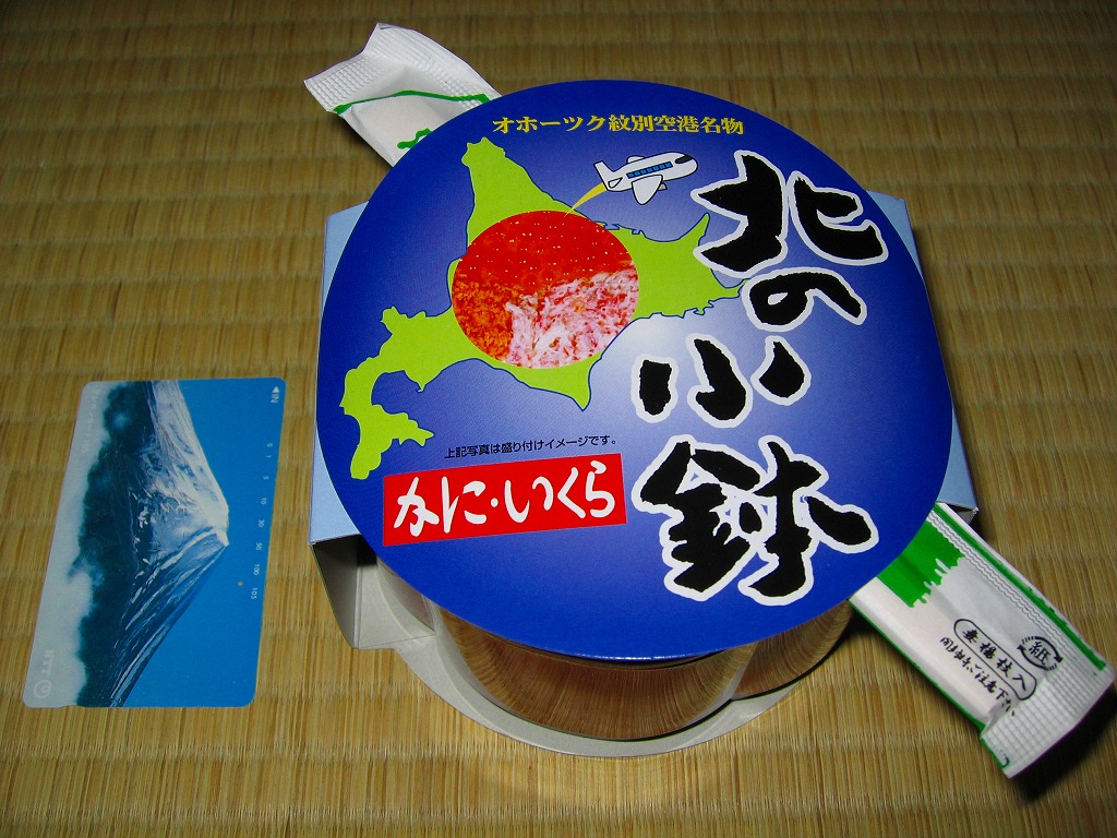 漆器調のプラ製花形容器を、アマチュア風なデザインの紙枠にはめて、割り箸を刺す。中身は茶飯の上を錦糸卵で覆い、鮭フレークとカニ粉などと、カップでたぶんイクラなどを載せるもの。駅弁大会で買える旭川や苫小牧の駅弁に深川や静内の偽駅弁と、風味や価格や内容や作りがとても似ていて、パッケージがなければ差異を見いだせない。 【オホーツク紋別空港】1966(昭和41)年7月21日開港 北海道紋別市小向19−3 http://www.okhotsk.pref.hokkaido.lg.jp/kk/akk/rjeb1.htm 【有限会社浜商U】北海道紋別市本町3−1−28 01582(4)4011 北の小鉢うに・かに(980円) 2006年2月26日にフーデックスプレス山下公園店駅弁大会で購入