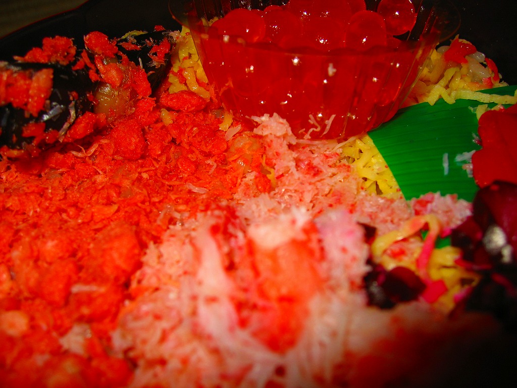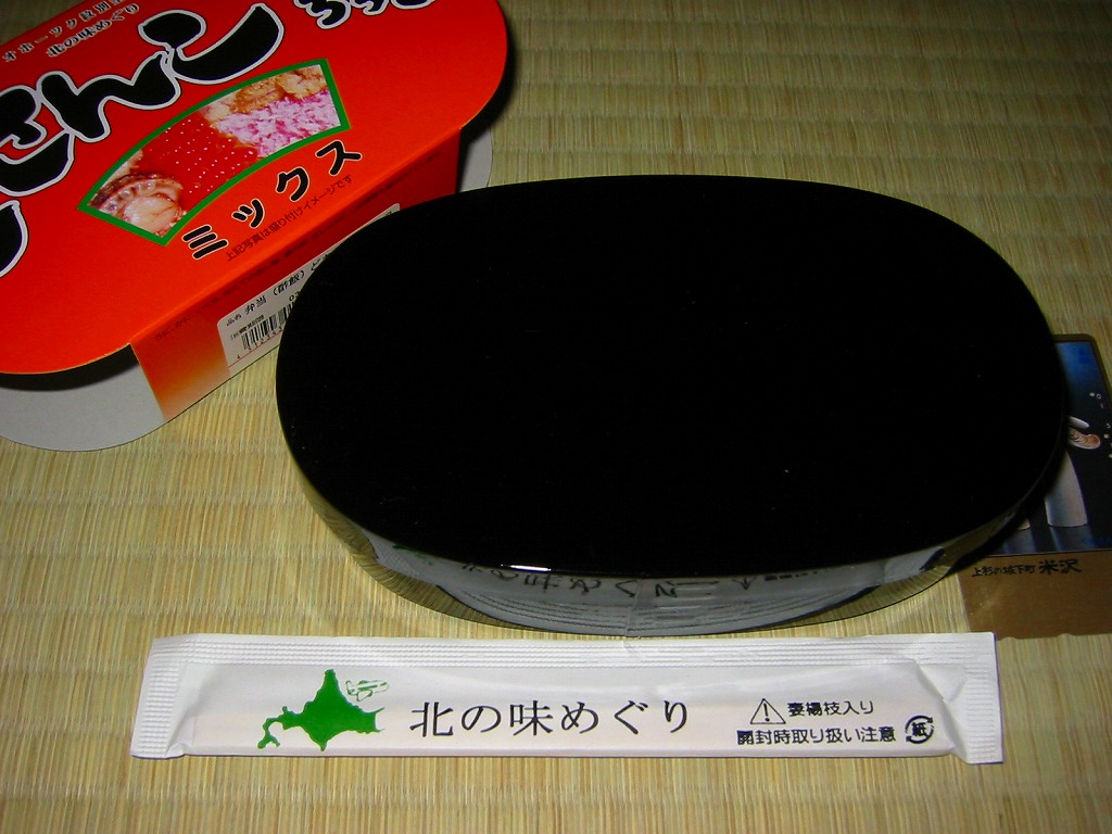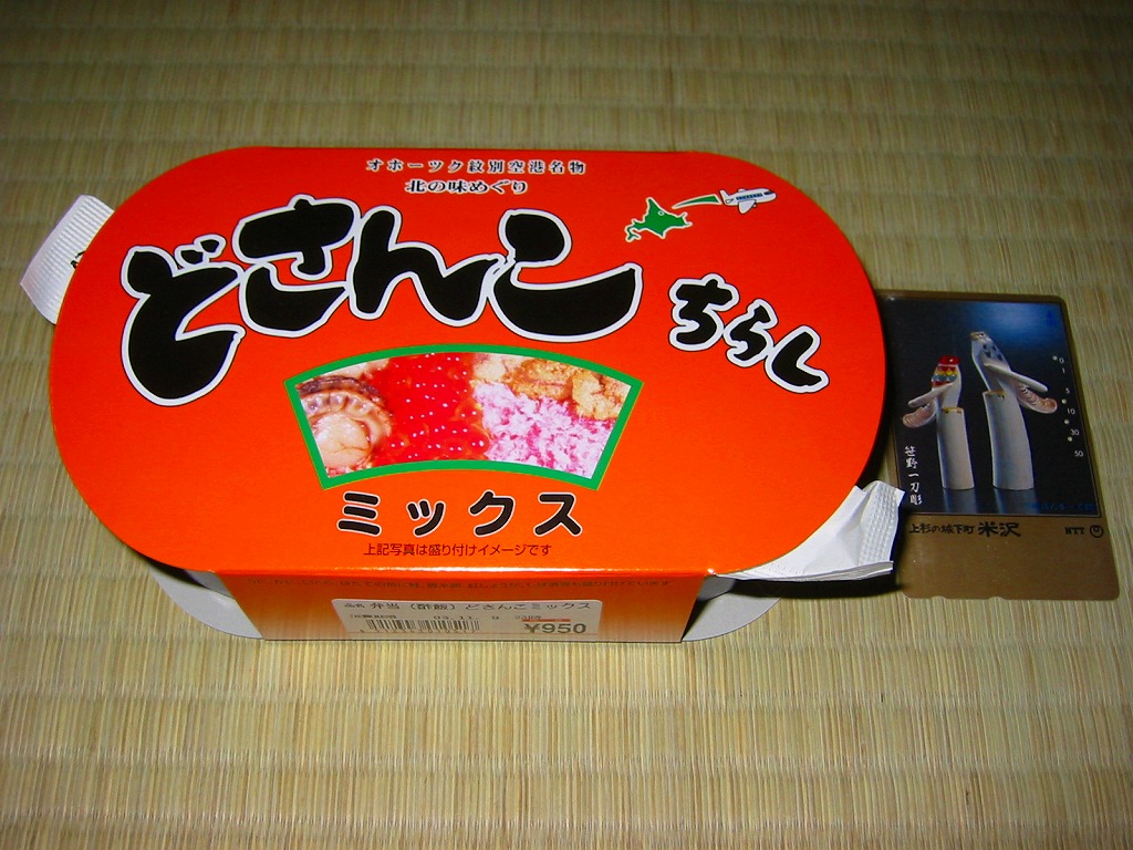 漆器調のプラ製花形容器を、アマチュア風なデザインの紙枠にはめて、割り箸を刺す。中身は茶飯の上を錦糸卵で覆い、鮭フレークとカニ粉などと、カップウニを載せるもの。駅弁大会で買える旭川や苫小牧の駅弁に深川や静内の偽駅弁と、風味や価格や内容や作りがとても似ていて、パッケージがなければ差異を見いだせない。 【オホーツク紋別空港】1966(昭和41)年7月21日開港 北海道紋別市小向19−3 http://www.okhotsk.pref.hokkaido.lg.jp/kk/akk/rjeb1.htm 【有限会社浜商U】北海道紋別市本町3−1−28 01582(4)4011 どさんこちらしミックス(997円) 2003年11月9日にダイエー横浜店駅弁大会で購入