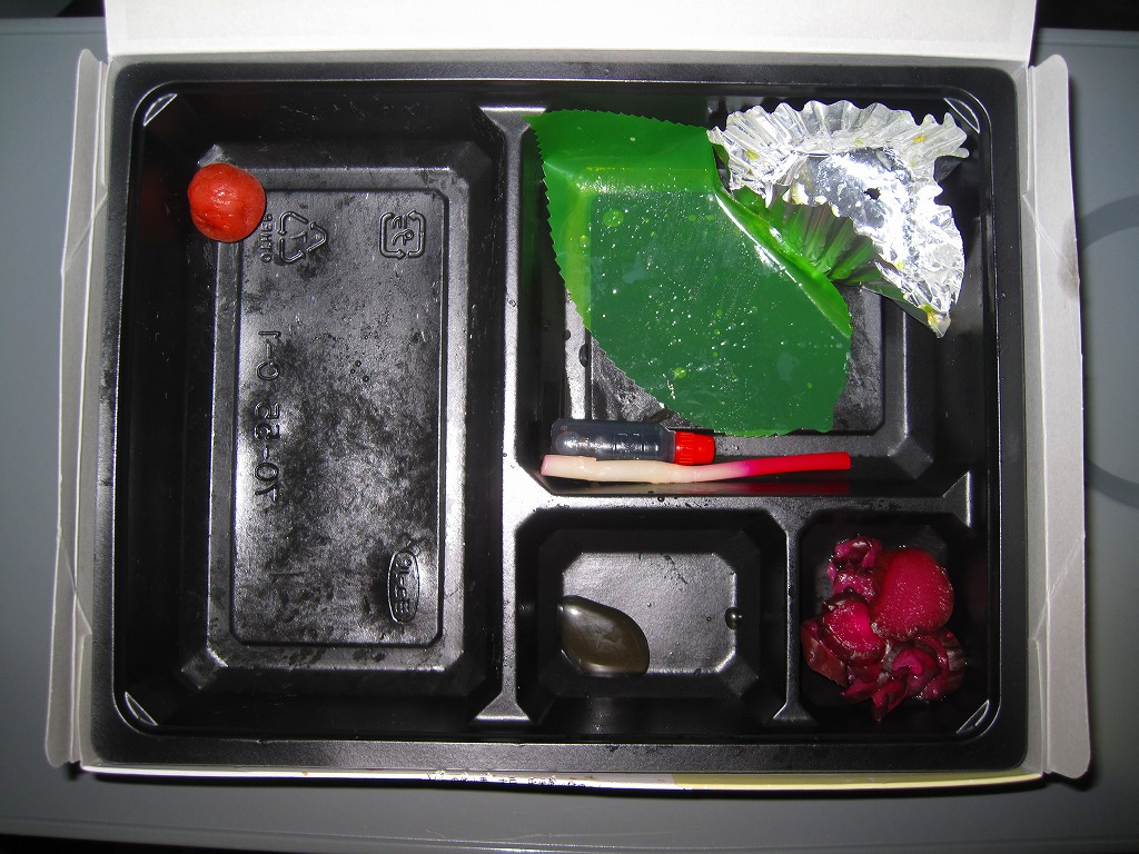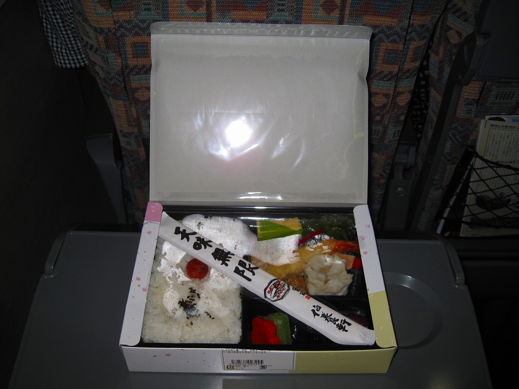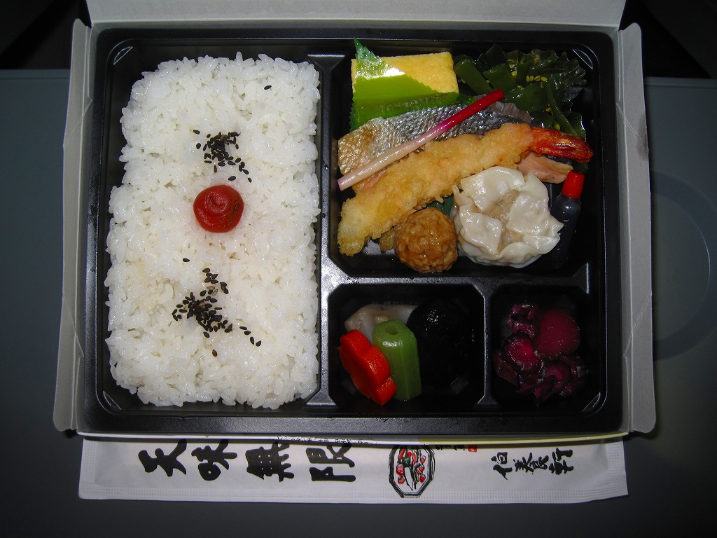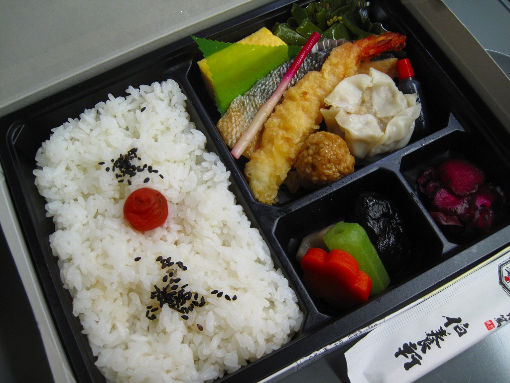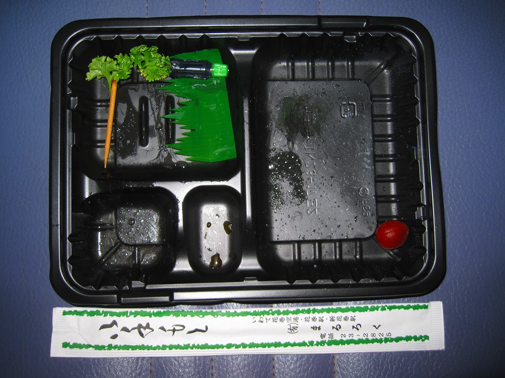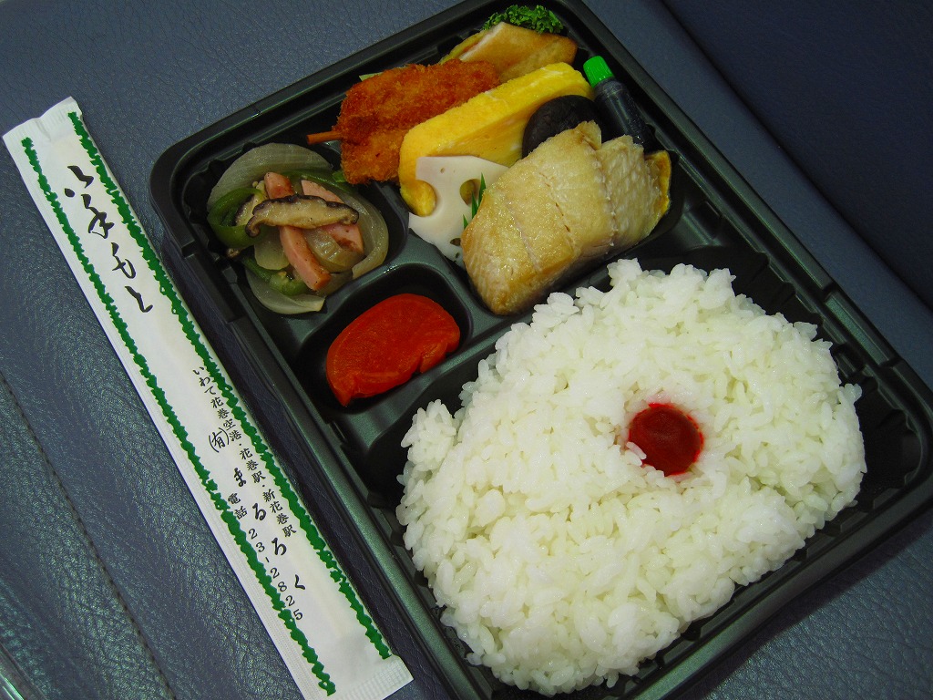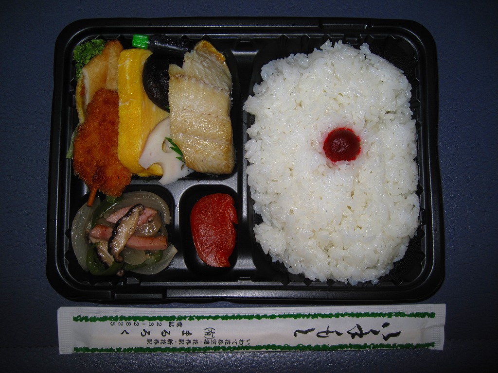 花巻空港の売店で売られていたお弁当。といっても空弁らしさは微塵(みじん)もなく、まるで仕出し弁当。市販の仕出し弁当用ボール紙箱に収まる黒いトレーに、日の丸御飯と焼鮭、エビフライ、焼売、肉団子、玉子焼、茎わかめ、シイタケやフキなどの煮物、しば漬けを詰めていた。調製元はJR盛岡駅の駅弁屋。花巻や岩手や陸中を何か入れてあげられないものだろうか。 訪問時の花巻空港では1階売店にウェルネス伯養軒の盛岡駅弁とまるろくの花巻駅弁が置かれていた。旧ビルの頃は食堂で空弁を作っていたはずが、新ビルではそういう掲示や実物にはお目にかかれず。ということで花巻空港限定の空弁は存在しないらしい。 【花巻空港】1964(昭和39)年4月開港 岩手県花巻市東宮野目第二地割 http://www.hna-terminal.co.jp/ 【株式会社ウェルネス伯養軒盛岡支店】岩手県盛岡市下太田下川原11番1号 019(658)1014 http://www.greenhouse.co.jp/w-hakuyoken/ (幕の内弁当)(500円) 2011年7月16日に花巻空港旅客ターミナルビル1階売店「hana AIRPORT SHOP&CAFE」で購入
