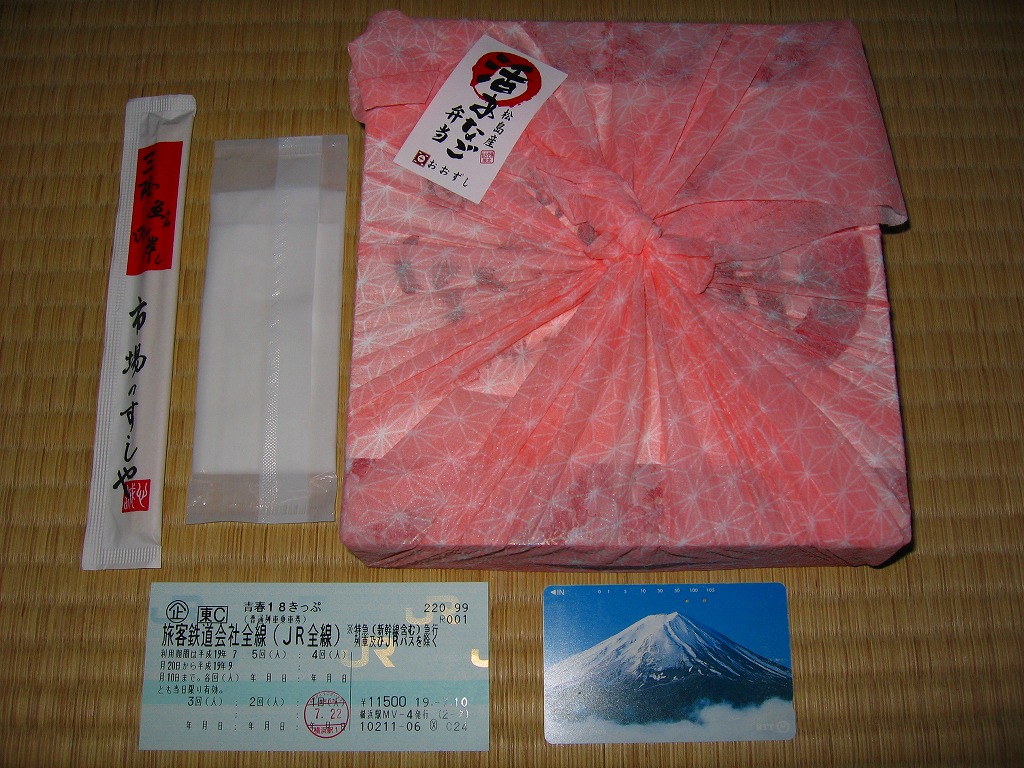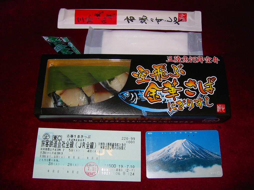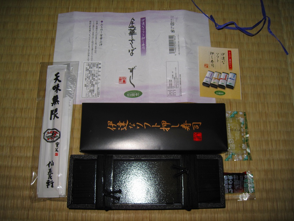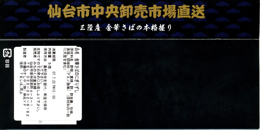 仙台空港鉄道開業記念、ということは2007年3月の登場か。公式速弁を思わせる大きな容器と風呂敷の包装。中身もやはり豪華に見せる速弁風で、松島産活あなごが載る酢飯に、仙台名物の笹かまぼこや、牛たんのスモークとソーセージの串刺し、昆布巻や玉子焼や焼き鳥や煮物、仙台長ナス漬など。調製元はニュータウンの宴会向け寿司料理屋で、その定休日である水曜は売らない模様。 羽田空港以外では希な、高額高級でも土産物向けでない異端空弁は、鈍行で仙台から横浜まで持ち帰り消費期限ギリギリまで粘ったら、腐敗臭が漂ってきたので残念ながら消費は見送り。駅弁や棒寿司や押寿司ではまずないが、こういうタイプの街売り弁当では、たまにそんなことがある。悪いのはたぶん、調製元ではなく消費者。 【仙台空港】1940(昭和15)年開港 宮城県名取市下増田字南原 http://www.sdj-airport.com/ 【おおずし】宮城県仙台市泉区七北田字町52−22 022(372)8472 空飛ぶ金華さばにぎりずし(800円) 2007年7月22日に仙台空港ターミナルビル観光売店で購入