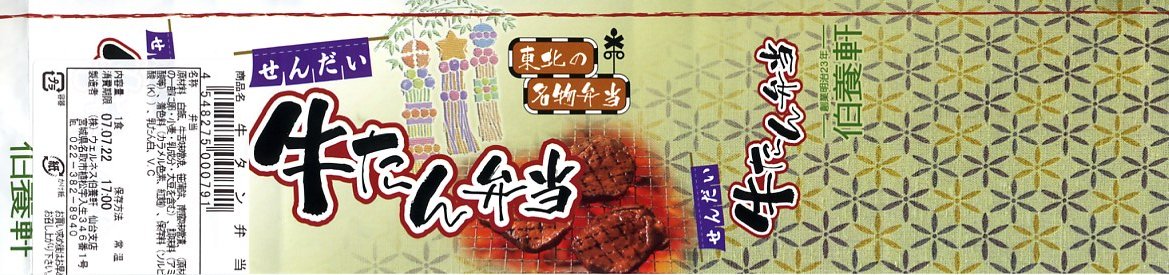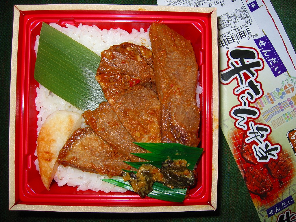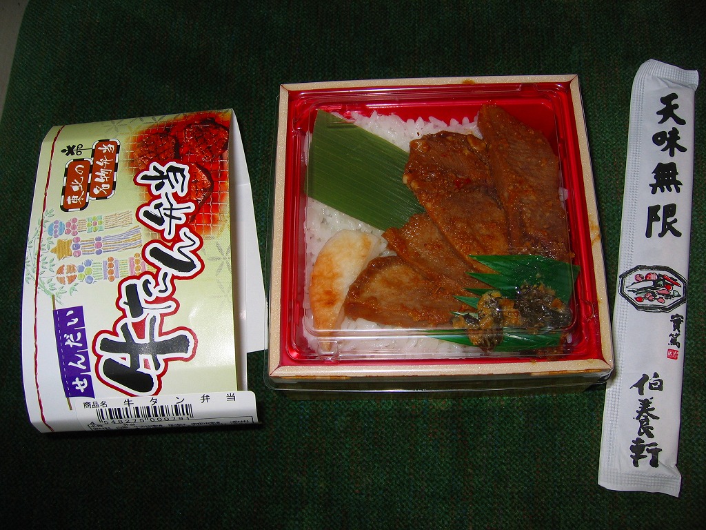 小柄で細い長方形容器を、商品名を書いて窓を開けたボール紙の枠にはめる。中身はサンマ棒寿司のカットが5切れ。シソの葉とガリで臭みを取る工夫を感じながら、しかし一歩間違えば薬品臭と取られかねないクセのある風味では、うまい空弁には挙がらないと思う。 【仙台空港】1940(昭和15)年開港 宮城県名取市下増田字南原 http://www.sdj-airport.com/ 【みちのく汐里本舗】宮城県仙台市若林区卸町4−3−1 022(232)8182 せんだい牛たん弁当(780円) 2007年7月22日に仙台空港ターミナルビル軽食堂売店で購入