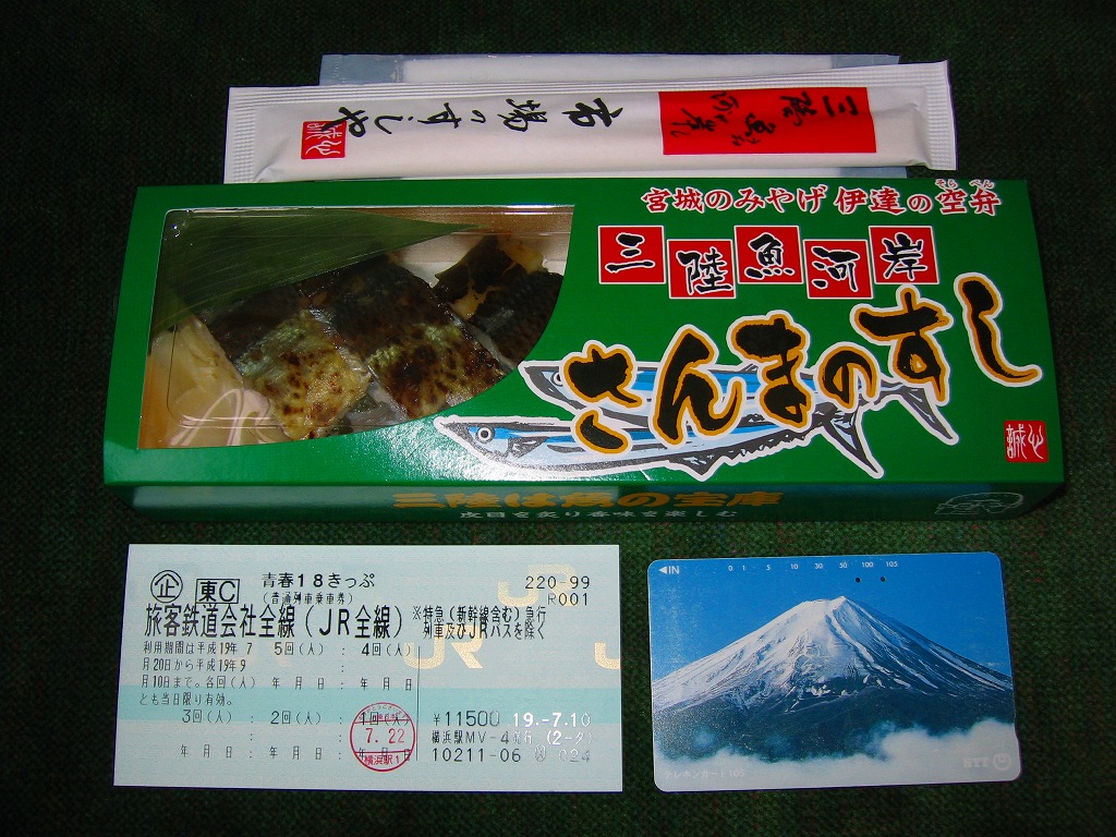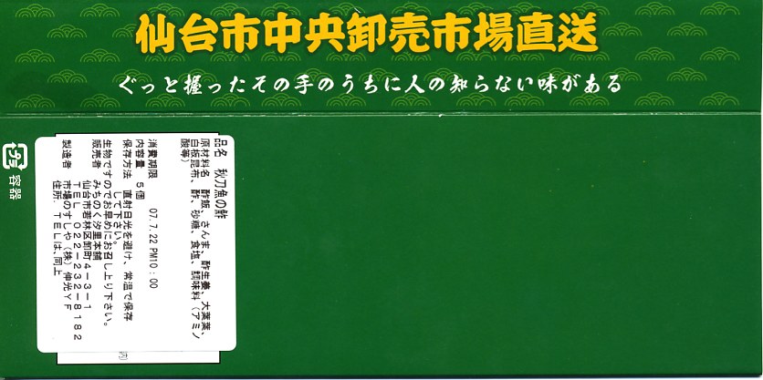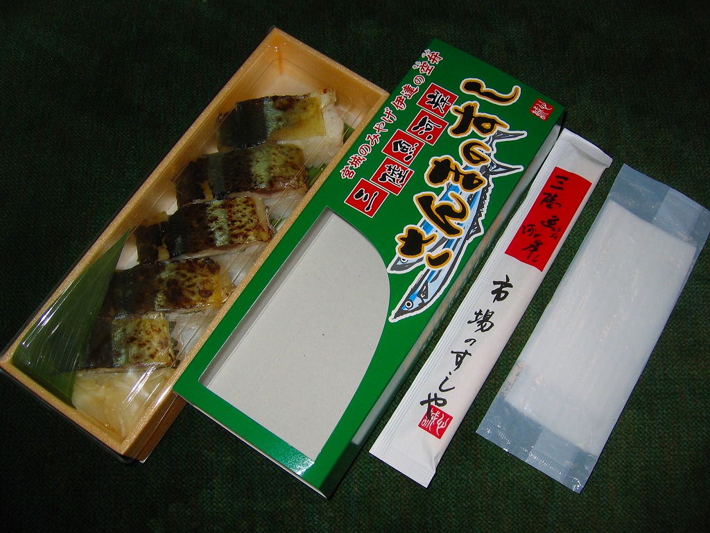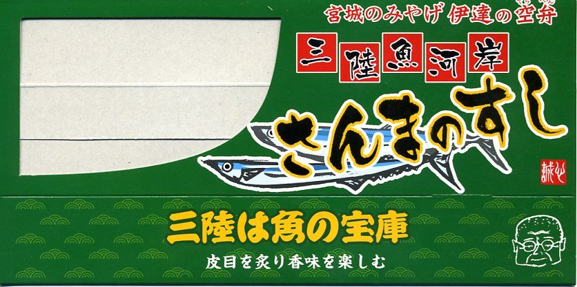 小柄で細い長方形容器を、商品名を書いて窓を開けたボール紙の枠にはめる。中身は酢締めのサバのにぎり寿司が5個、笹に少々掛かりながら入るもの。鯖寿司の弁当として最近は珍しい、特に焼き鯖寿司で火が着いた空弁ではまず見ないタイプの江戸前風。味はそこそこ良いと思うが、切れの見栄えがややマイナス。 【仙台空港】1940(昭和15)年開港 宮城県名取市下増田字南原 http://www.sdj-airport.com/ 【みちのく汐里本舗】宮城県仙台市若林区卸町4−3−1 022(232)8182 三陸魚河岸さんまのすし(700円) 2007年7月22日に仙台空港ターミナルビル観光売店で購入