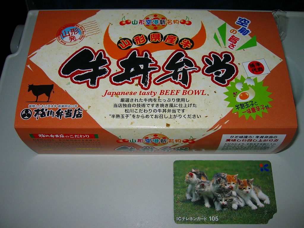 2005年秋に現地でひっそりと、首都圏その他遠隔地のスーパーでの駅弁催事で大々的にデビューした、山形空港唯一の空弁。プラ製トレーを接着した長方形の発泡材容器を、空港名と弁当名を書いたボール紙の枠にはめる。中身は白御飯に甘味の勝る甘辛な牛すき焼き肉を少々載せ、半熟卵と椎茸やごぼうや紅生姜を載せ、柴漬けと醤油漬けを添えるもの。製造者がJR山形新幹線米沢駅の駅弁屋なので、そこの牛肉駅弁と同等の良い風味を楽しめた。 一日に定員50名の小型機6便と定員134名の東京便1便のみの空港ではまともな空弁需要が小さいのか、現地では金土日曜のみの販売で、平日の入手には予約が必要。しかし催事場でばかり見て現地ではさっぱり見ないどこかの空弁と違い、こちらはターミナルビルの売店2箇所でしっかり宣伝されていた。 その名のとおり山形県を代表する空港であった山形空港は、1992年のJR山形新幹線開業と1999年の新庄延伸で東京便が打撃を受け、利用者数は過去10年で1/3以下に減少、1991年開港の庄内空港の半分程度しかない。県庁のメンツをかけて補助金漬けで羽田便を維持している。 ※2008年6月補訂:写真の更新と解説文の一部修整 【山形空港】1964(昭和39)年6月開港 山形県東根市大字羽入字柏原新林3008 http://www.yamagata-airport.co.jp/ 【有限会社松川弁当店】山形県米沢市駅前3−5−3 0238(23)0725 http://www.yonezawaekiben.jp/ Copyright (C) 2006-2022 まっこうくじら |