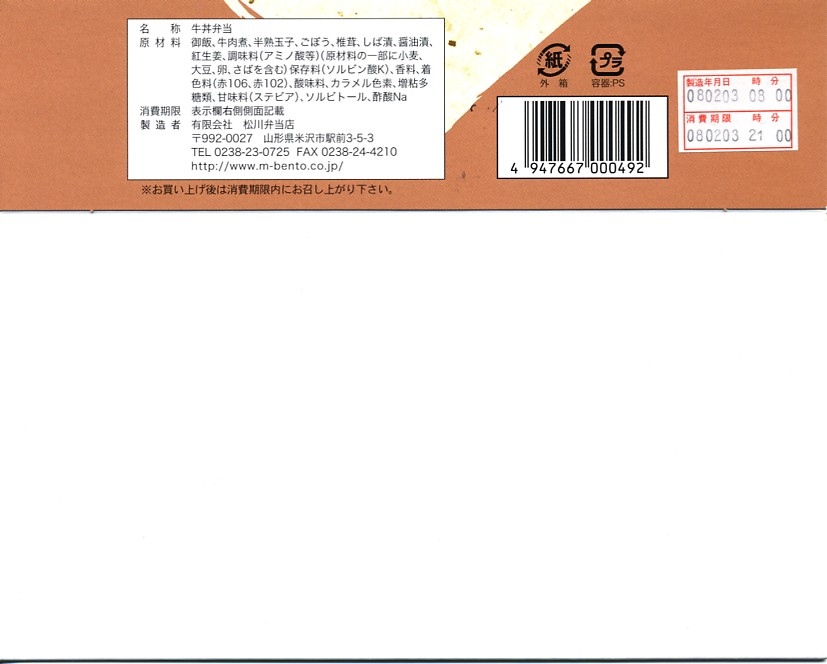 牛丼弁当(1,100円) 2008年2月3日に山形空港ターミナルビル2階土産物売店で購入