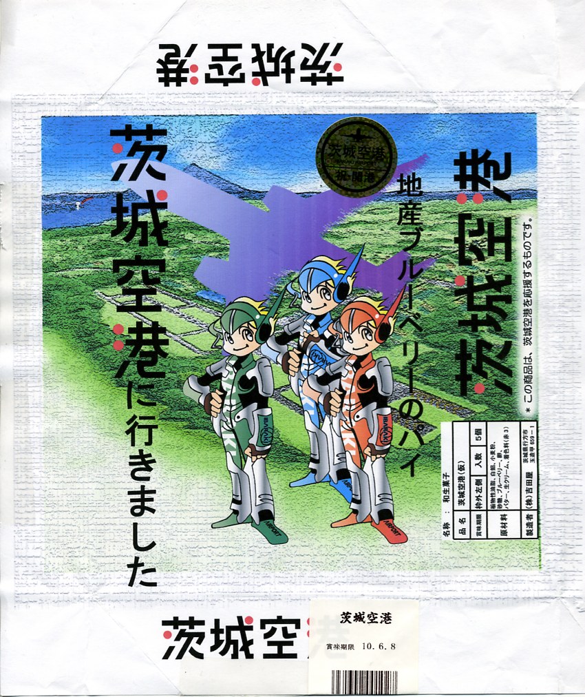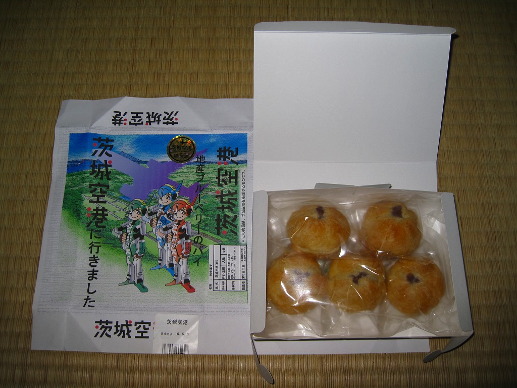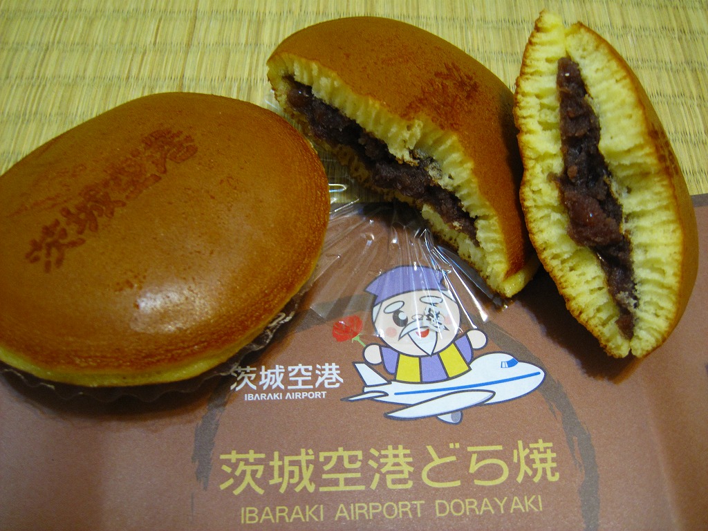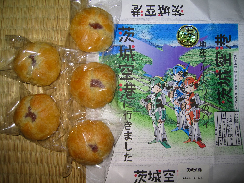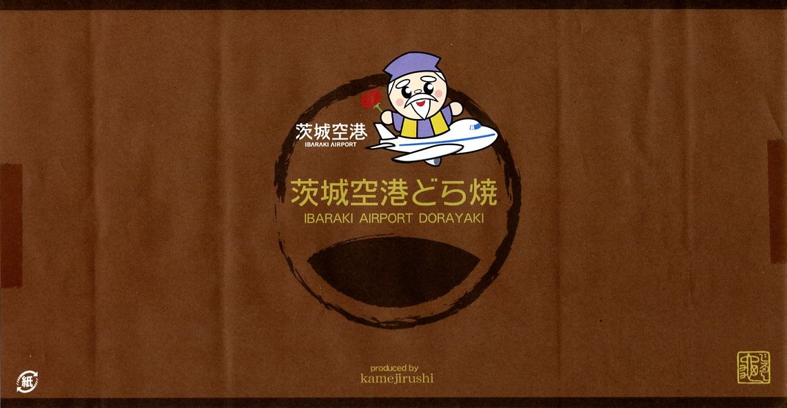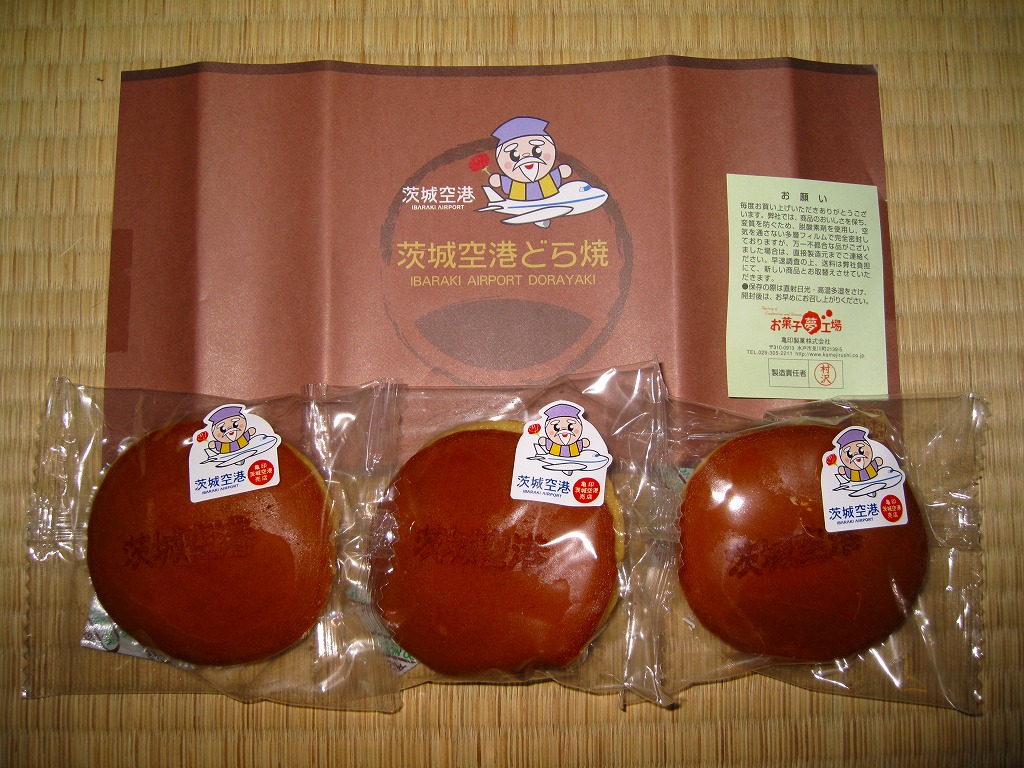 ブルーベリー入りの丸いパイが5個、個別包装された上にまとめて透明な袋に密封され、白いボール紙の箱に詰められ、茨城空港の俯瞰図やキャラクターを描いた包装紙に包まれる。どんな空港でも売られていそうな土産物に見えて、製造者が空港から10kmも離れていない地元の御菓子司であることは、このたぐいの土産物としてはとても珍しい。そんなことで、これもここに収蔵。 包装紙に描かれる3人の戦士?は、開港約2年前の2008年5月28日に小美玉市茨城空港利用促進協議会が発表した空港PR用キャラクター。名前は包装紙では分からないが、3人まとめて「スカイスリー」というらしい。しかし同じ2008年5月には茨城県が、2007年の全国健康福祉祭茨城大会のために2005年4月に生んだキャラクター「ハッスル黄門」を茨城空港のPRマスコットに採用することを決定しており、県と市でマスコットが異なる事態になってしまった。 【茨城空港】2010(平成22)年3月11日開港 茨城県小美玉市百里 http://www.ibaraki-airport.net/ 【株式会社吉田屋】茨城県行方市玉造甲659−1 連絡先の記載なし 茨城空港どら焼(500円) 2010年5月30日に茨城空港ターミナルビル2階売店で購入