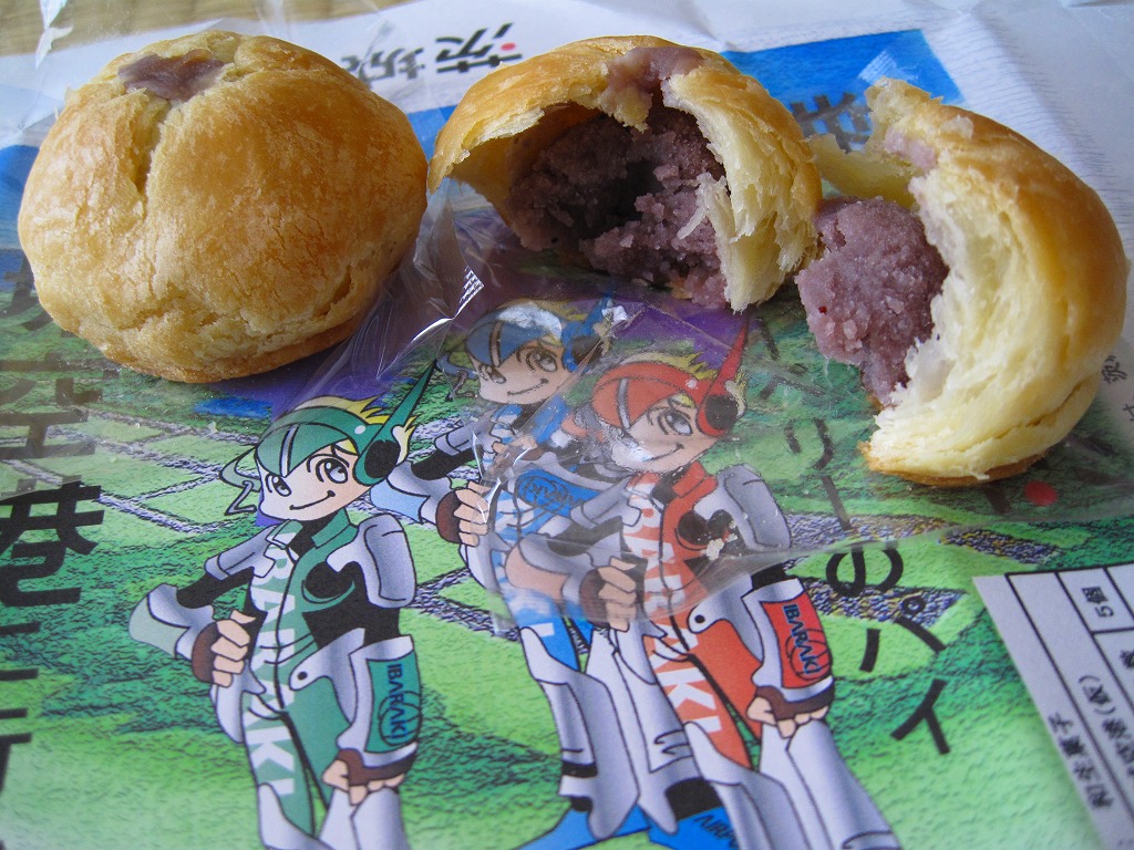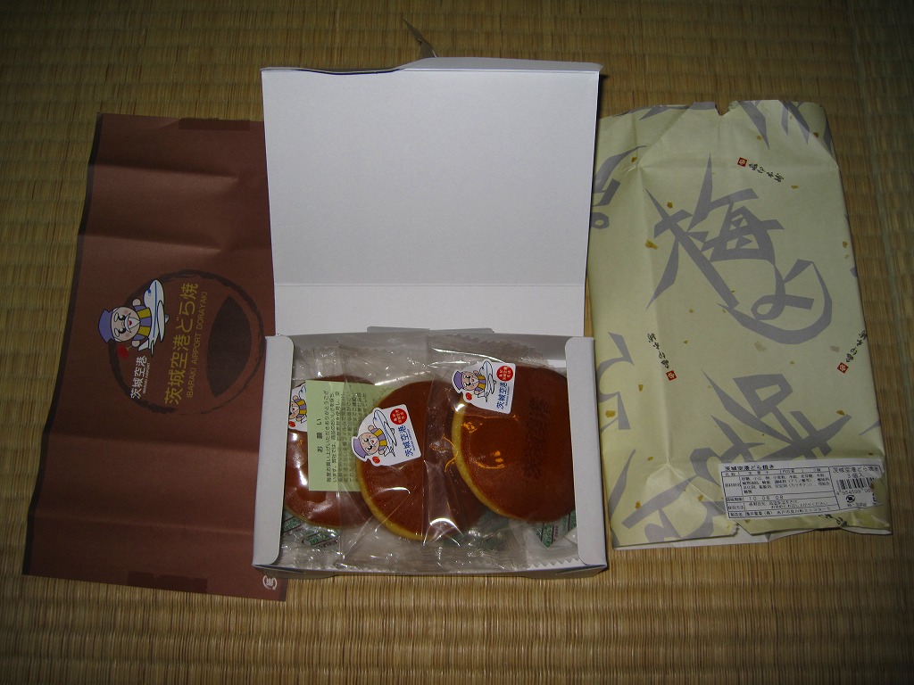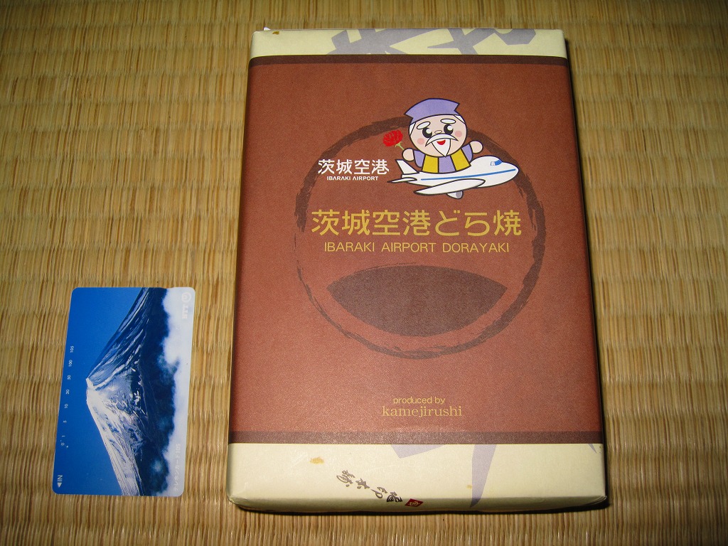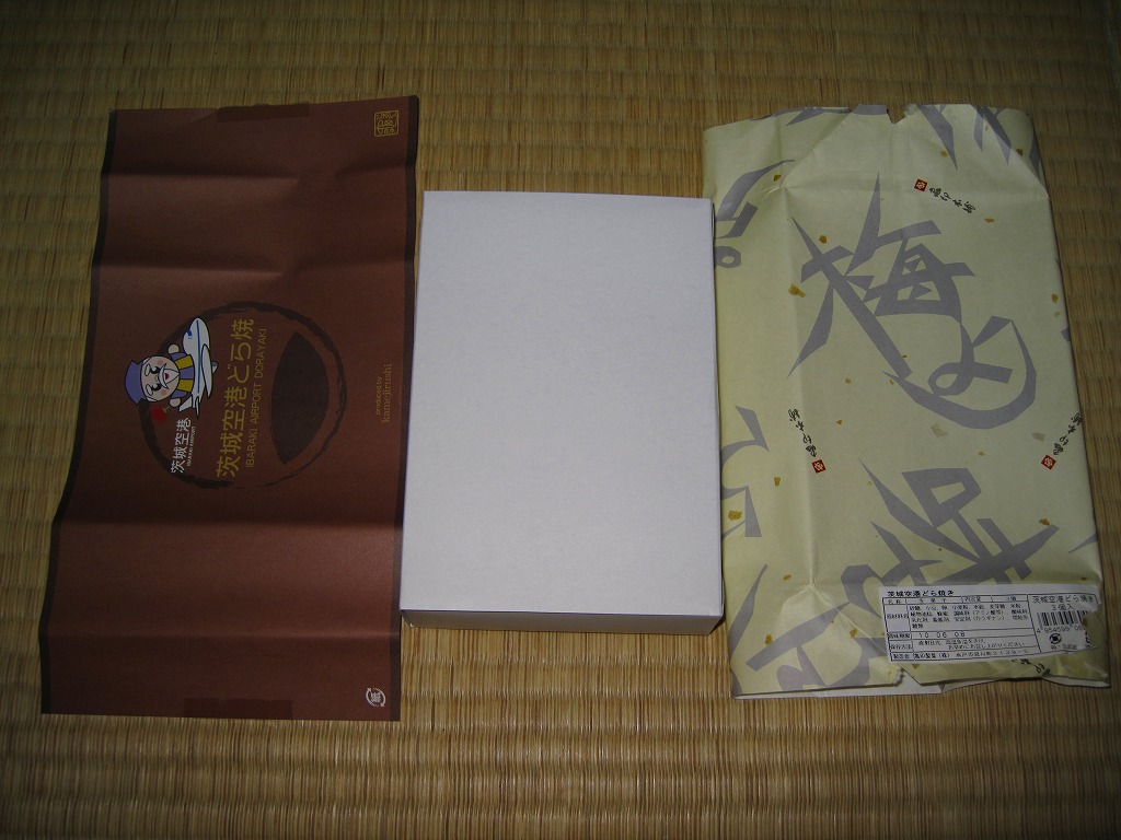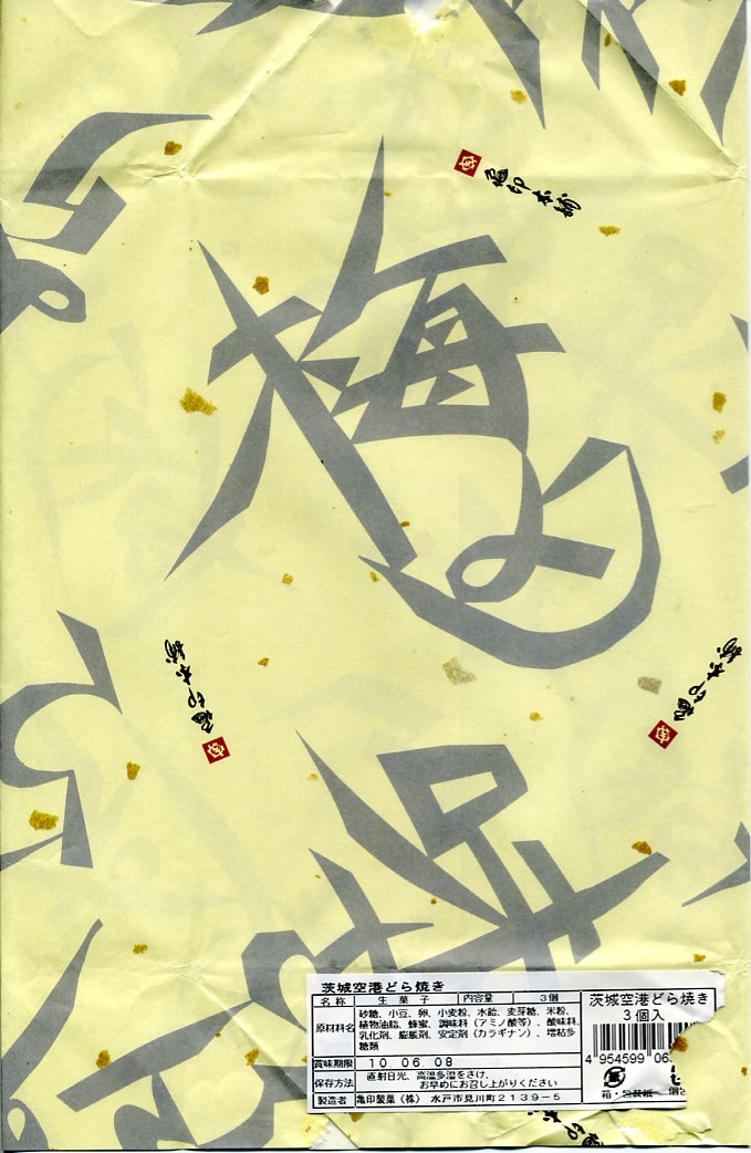 ブルーベリー入りの丸いパイが5個、個別包装された上にまとめて透明な袋に密封され、白いボール紙の箱に詰められ、茨城空港の俯瞰図やキャラクターを描いた包装紙に包まれる。どんな空港でも売られていそうな土産物に見えて、製造者が空港から10kmも離れていない地元の御菓子司であることは、このたぐいの土産物としてはとても珍しい。そんなことで、これもここに収蔵。 包装紙に描かれる3人の戦士?は、開港約2年前の2008年5月28日に小美玉市茨城空港利用促進協議会が発表した空港PR用キャラクター。名前は包装紙では分からないが、3人まとめて「スカイスリー」というらしい。しかし同じ2008年5月には茨城県が、2007年の全国健康福祉祭茨城大会のために2005年4月に生んだキャラクター「ハッスル黄門」を茨城空港のPRマスコットに採用することを決定しており、県と市でマスコットが異なる事態になってしまった。 【茨城空港】2010(平成22)年3月11日開港 茨城県小美玉市百里 http://www.ibaraki-airport.net/ 【株式会社吉田屋】茨城県行方市玉造甲659−1 連絡先の記載なし 茨城空港どら焼(500円) 2010年5月30日に茨城空港ターミナルビル2階売店で購入
