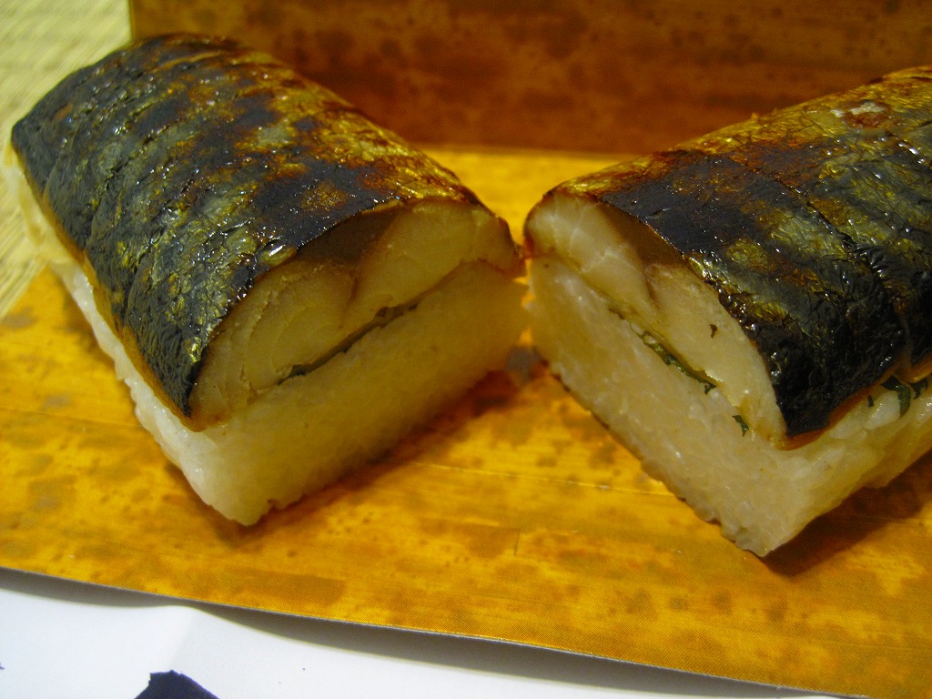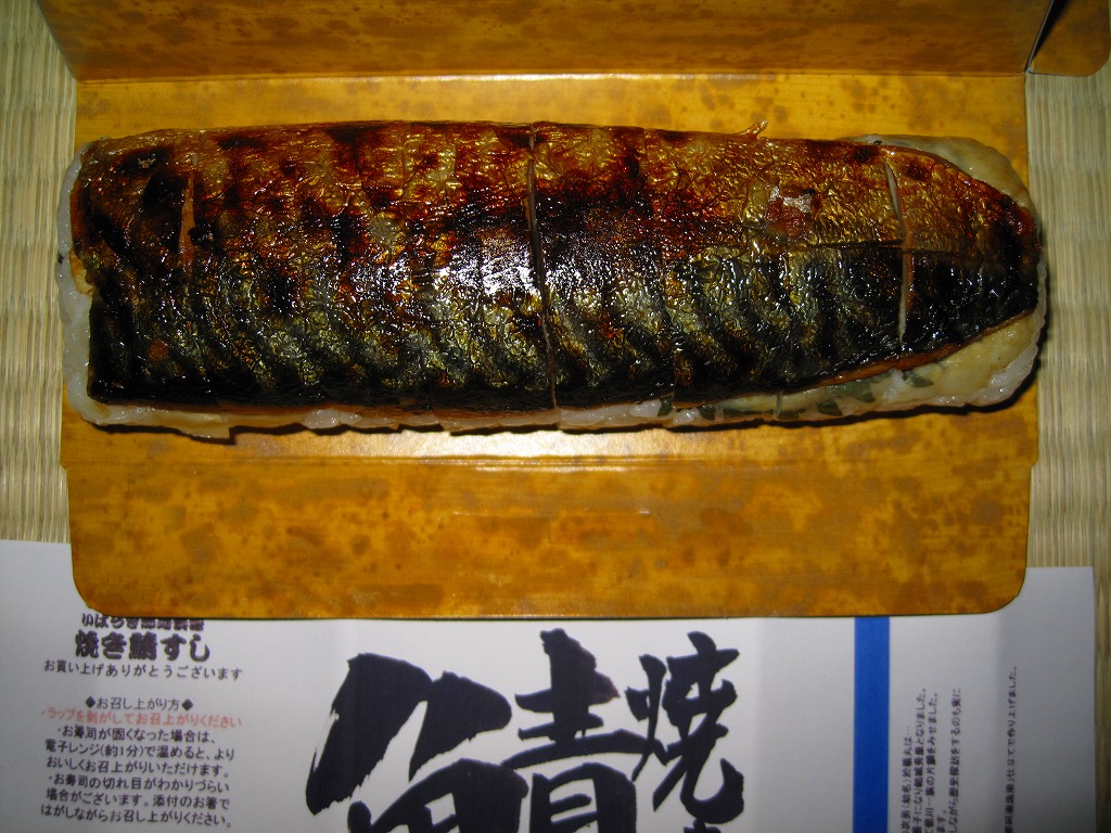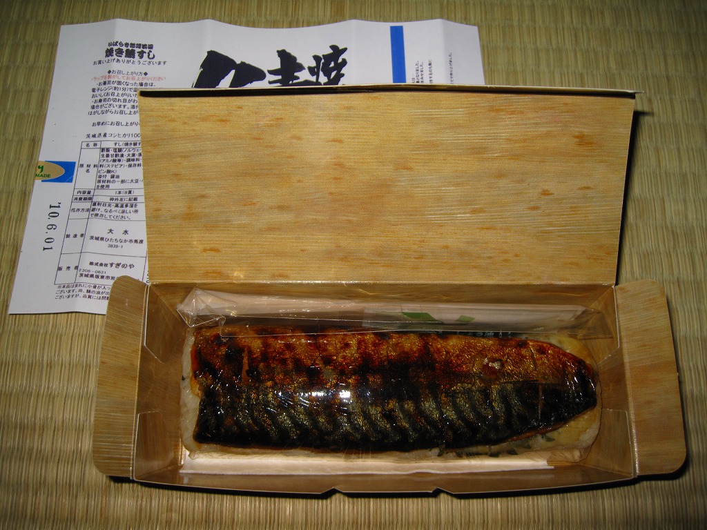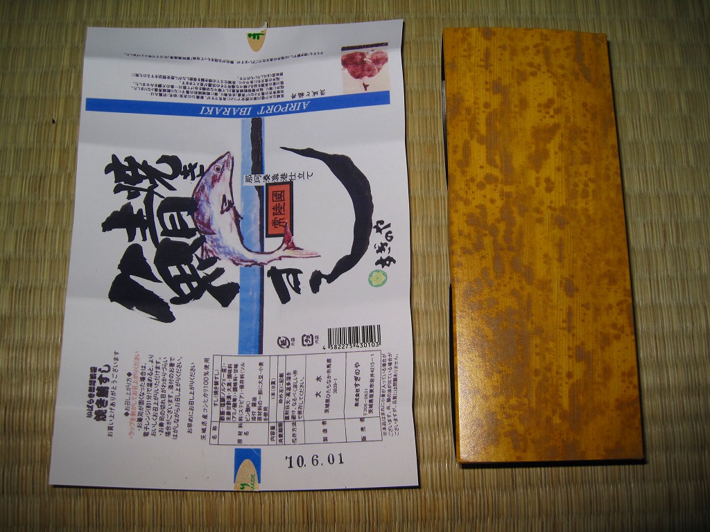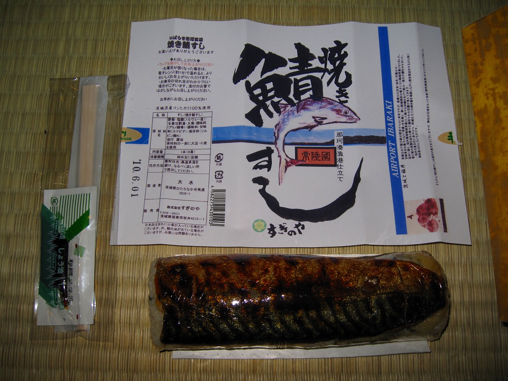 写真のとおり、どんな空港でも売られていそうな土産物のたぐい。「茨城空港」の焼き印を捺したどら焼きが3個、透明な個別包装に茨城空港のシールを貼り、包装紙の上に茨城空港の掛紙をさらに巻いて販売されていた。製造者は寛永5年(1852年)に水戸で漬物商として創業したという老舗の和洋菓子屋。6個で1,000円、10個で1,600円のパッケージもある。 このような商品を集め始めたらキリがない。しかし訪問時の茨城空港では、そんな土産物がことごとく、茨城県内の業者を製造元としていた。通常の空港土産は、全国を販路とする土産物専門業者が一手に製造し、連絡先のフリーダイヤルと販売者の名前を包装紙に印刷して販売されるものであり、地元で製造する商品にはほとんど出会えない。報道上は四面楚歌な茨城空港への個人的な応援として、ここに収蔵する。 【茨城空港】2010(平成22)年3月11日開港 茨城県小美玉市百里 http://www.ibaraki-airport.net/ 【亀印製菓株式会社】茨城県水戸市見川町2139−5 029(305)2211 http://www.kamejirushi.co.jp/ 常陸國焼き鯖すし(1,050円) 2010年5月30日に茨城空港ターミナルビル2階台売りで購入