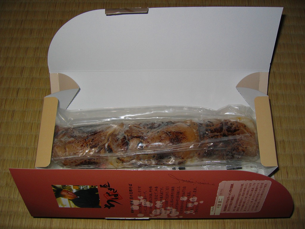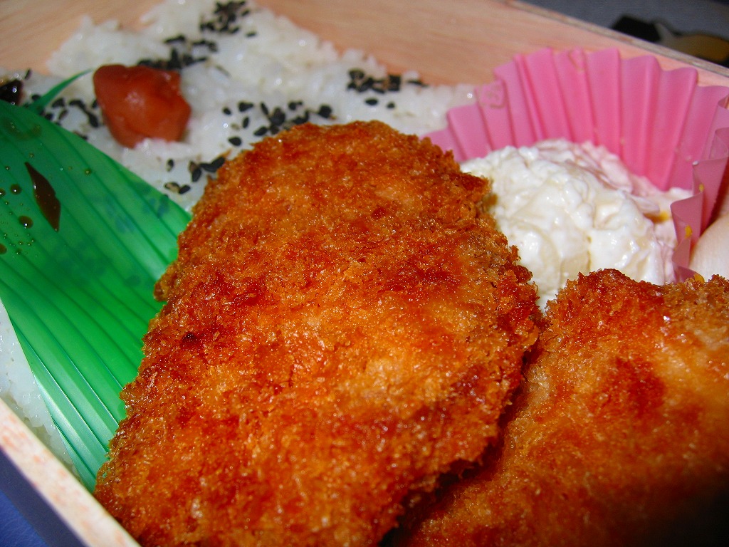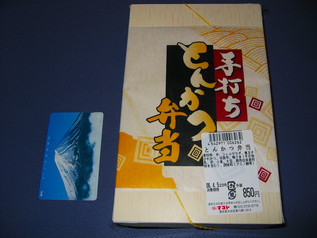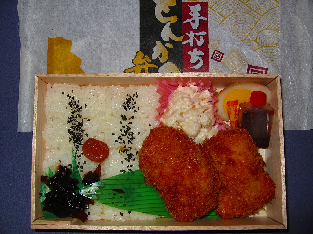 シナチクと錦糸卵を混ぜた酢飯の円柱に薄い焼き豚を貼り付け、ラップで巻いてビニール袋で密封し、ナイフと割り箸とナプキンを添えて紙箱に収納する、ラーメン屋の焼豚寿司。手を汚さずに食べるのは難しい。 内容は豚寿司や豚丼というより、例えばラーメンに入るチャーシューのように、御飯の風味付けに豚肉を利用した感じで、豚肉とタレとおこげの香りで御飯を食べて腹を満たす。御飯も錦糸卵の散り具合が八戸駅弁「菊ずし」のように美しい。でも食べた人の味の評価はかなり厳しい模様。 【東京国際空港】1931(昭和6)年8月25日開港 東京都大田区羽田空港 http://www.tokyo-airport-bldg.co.jp/ 【佃屋食料販売株式会社】東京都大田区羽田3−3−15 03(3744)6868 手打ちとんかつ弁当(850円) 2006年4月5日に羽田空港第1旅客ターミナル空弁売り場で購入