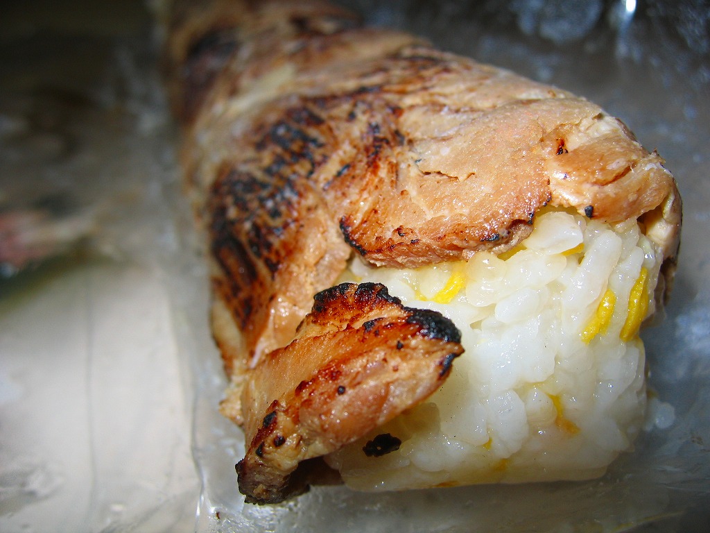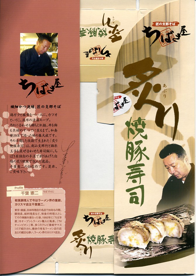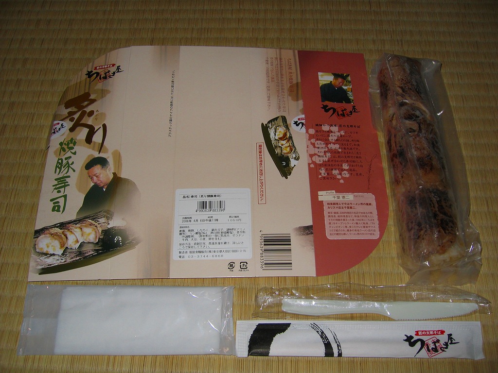 2006年頃の登場か。耐水紙の四角い紙箱の中に白御飯を薄く敷いて、軽く焦げ目の付いた豚バラカルビ焼をぐっちゃり詰めて、目玉焼やパブリカなどを添える。内容も外観も風味も、おしゃれな方向に傾いた豚丼。しかし関東で焼肉といえば、豚ではなく牛だと思うが。 【東京国際空港】1931(昭和6)年8月25日開港 東京都大田区羽田空港 http://www.tokyo-airport-bldg.co.jp/ 【佃屋食料販売株式会社】東京都大田区羽田3−3−15 03(3744)6868 炙り焼豚寿司(1,050円) 2006年4月5日に羽田空港第2旅客ターミナル売店で購入