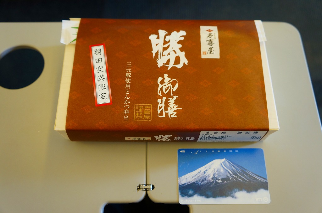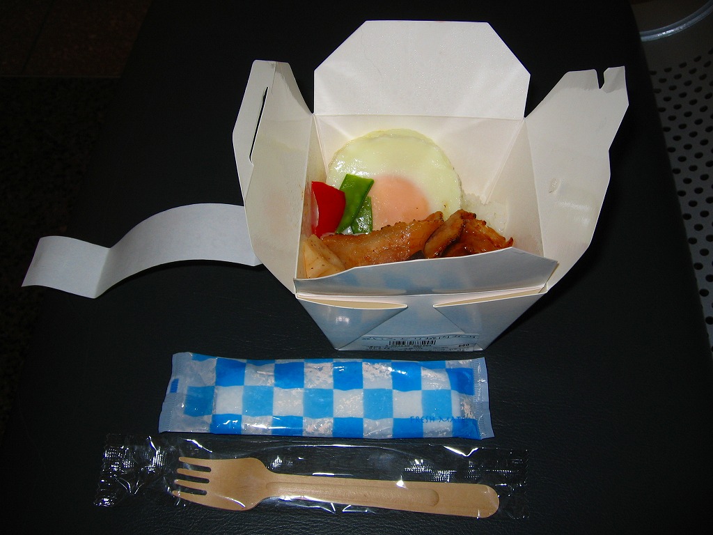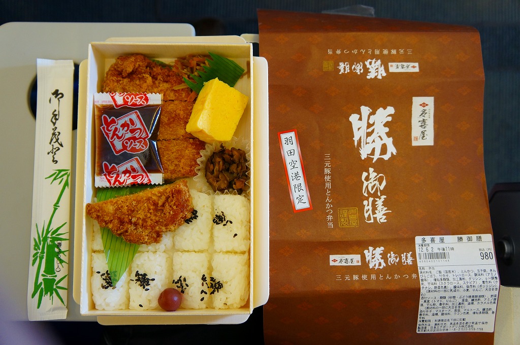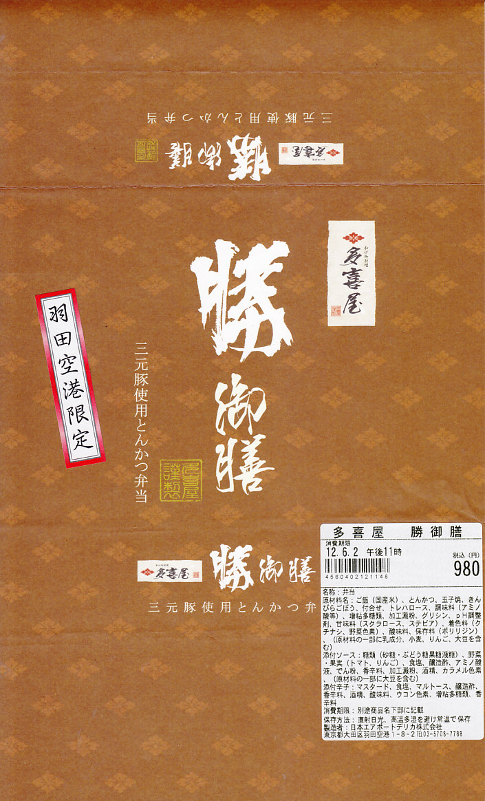 2012年前半の登場か。牛乳パックのような耐水紙の容器の半分が日の丸御飯、半分が豚生姜焼、そこにポテトサラダや漬物を付け合わせるという、懐かしくはないが確かにシンプルで割り切った仕様。空弁売店で買える常温のホカ弁。 【東京国際空港】1931(昭和6)年8月25日開港 東京都大田区羽田空港 http://www.tokyo-airport-bldg.co.jp/ 【日本エアポートデリカ株式会社】東京都大田区羽田空港1−8−2 03(5708)7788 http://www.airdeli.co.jp/ 勝御膳(980円) 2012年6月2日に羽田空港第1旅客ターミナル搭乗待合室BLUESKYで購入